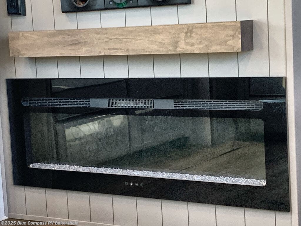 You won't want to camp any other way once you step inside this fifth wheel! the chef will enjoy all of the space in the rear kitchen with ample counter space, a 19 cu. ft. 12 volt residential refrigerator, and a pantry for snacks. Everyone will love to meet in the middle living area that includes dual sleeper sofas and a dual recliner loveseat across from the 50" Smart TV and fireplace. The half bathroom is nearby for quick bathroom breaks too. You will feel right at home in the master suite with a king bed slide to lay your head on at night, a flip top dresser with a Smart TV above it to watch your movies in true comfort, and a seat with storage, plus access to the front full bathroom. Inside the bathroom, you will find a 61" x 30" shower to freshen up in and a walk-in closet with a hamper, shelves, and washer and dryer prep for clean clothes throughout your entire trip!