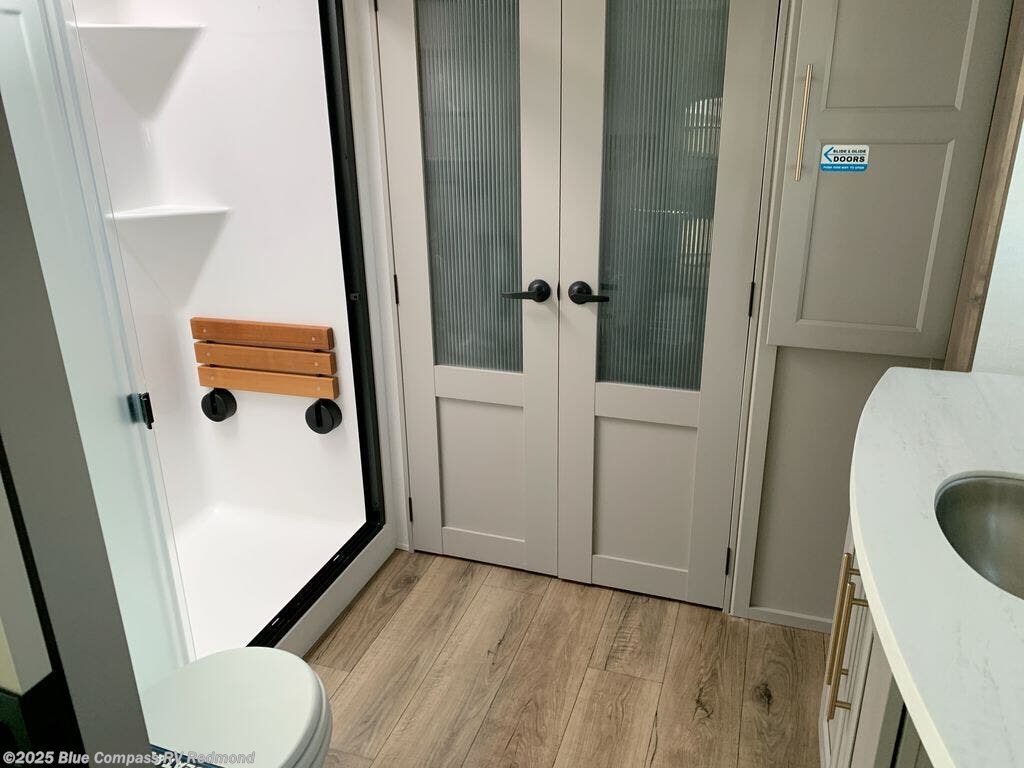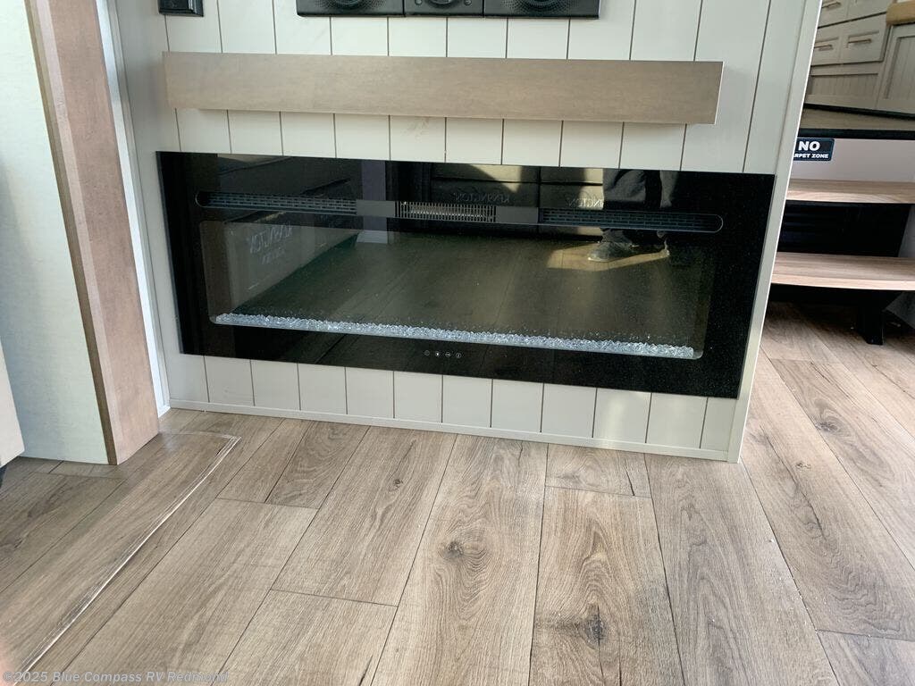 You won't want to camp any other way once you step inside this fifth wheel! the chef will enjoy all of the space in the rear kitchen with ample counter space, a 19 cu. ft. 12 volt residential refrigerator, and a pantry for snacks. Everyone will love to meet in the middle living area that includes dual sleeper sofas and a dual recliner loveseat across from the 50" Smart TV and fireplace. The half bathroom is nearby for quick bathroom breaks too. You will feel right at home in the master suite with a king bed slide to lay your head on at night, a flip top dresser with a Smart TV above it to watch your movies in true comfort, and a seat with storage, plus access to the front full bathroom. Inside the bathroom, you will find a 61" x 30" shower to freshen up in and a walk-in closet with a hamper, shelves, and washer and dryer prep for clean clothes throughout your entire trip!
