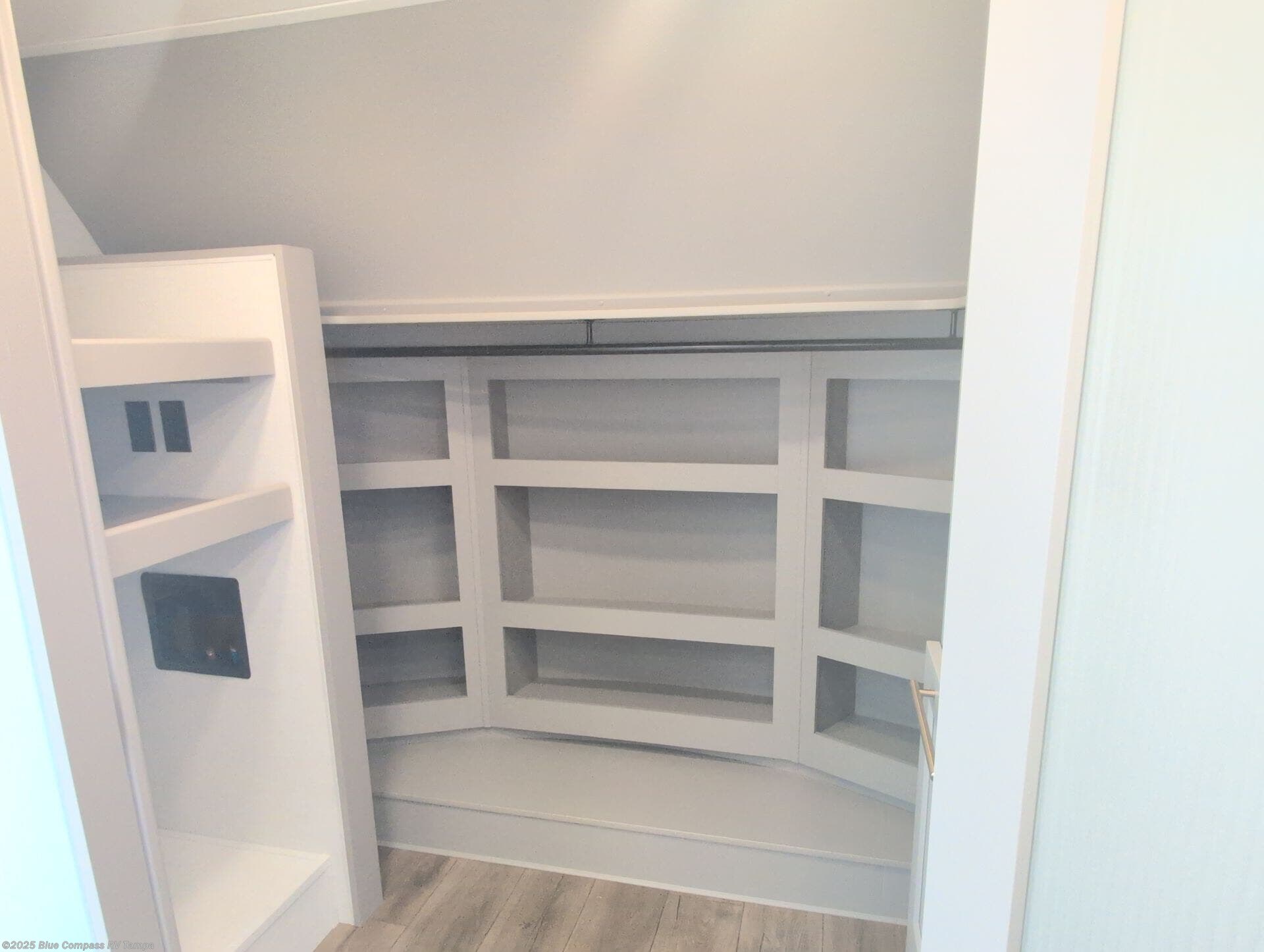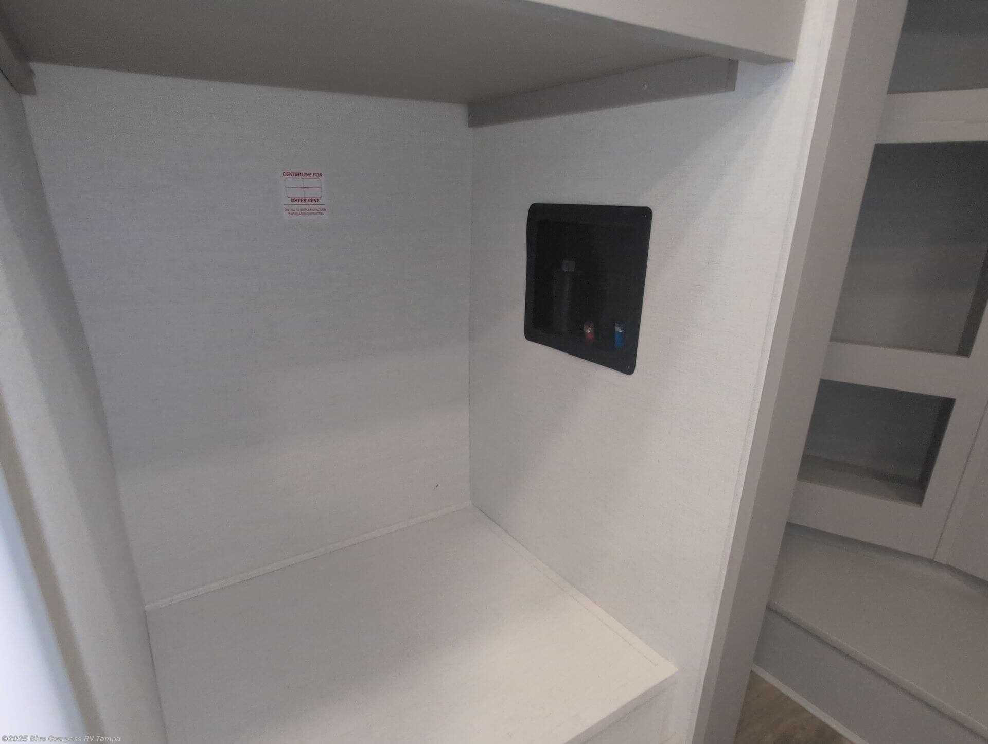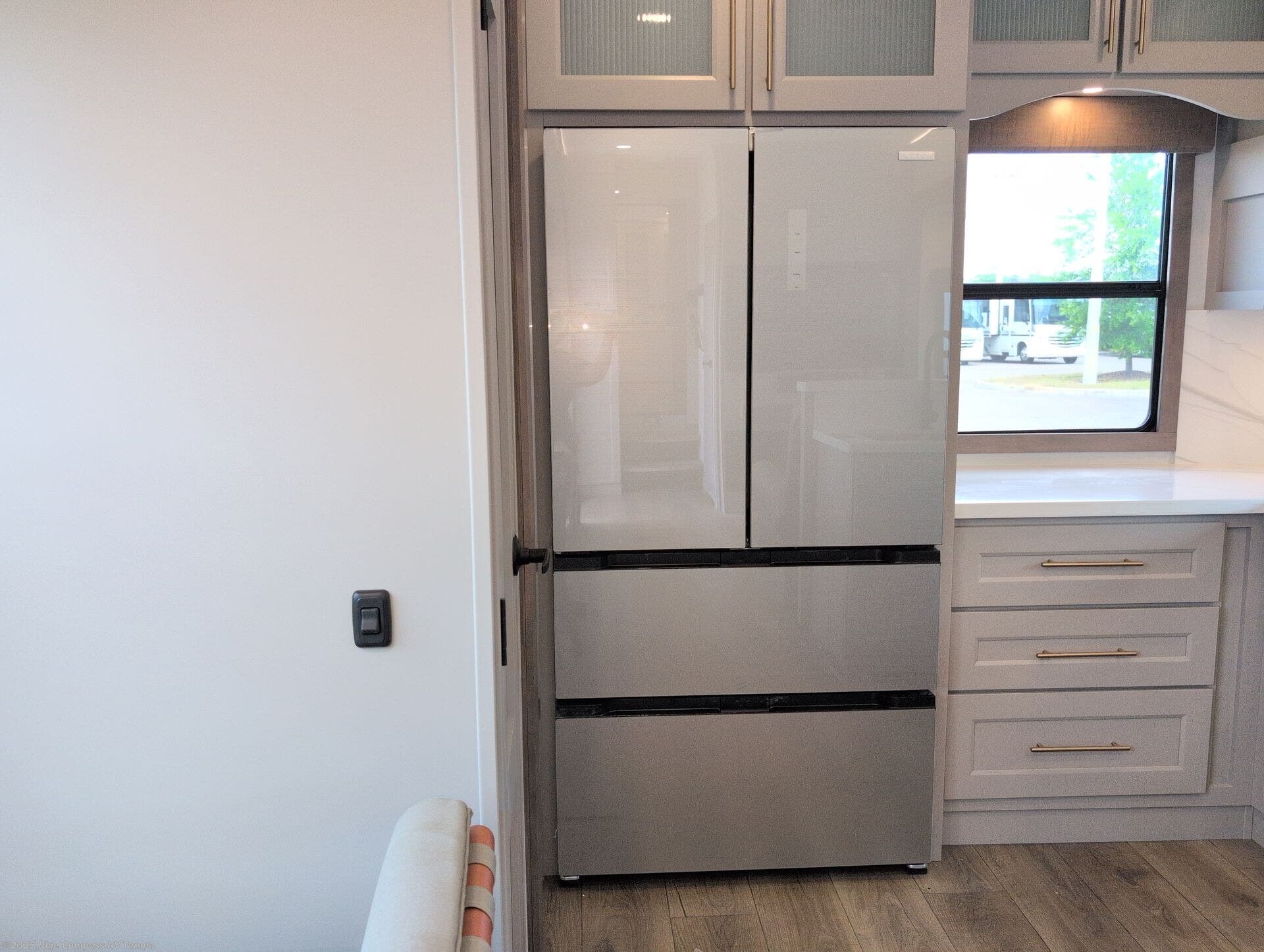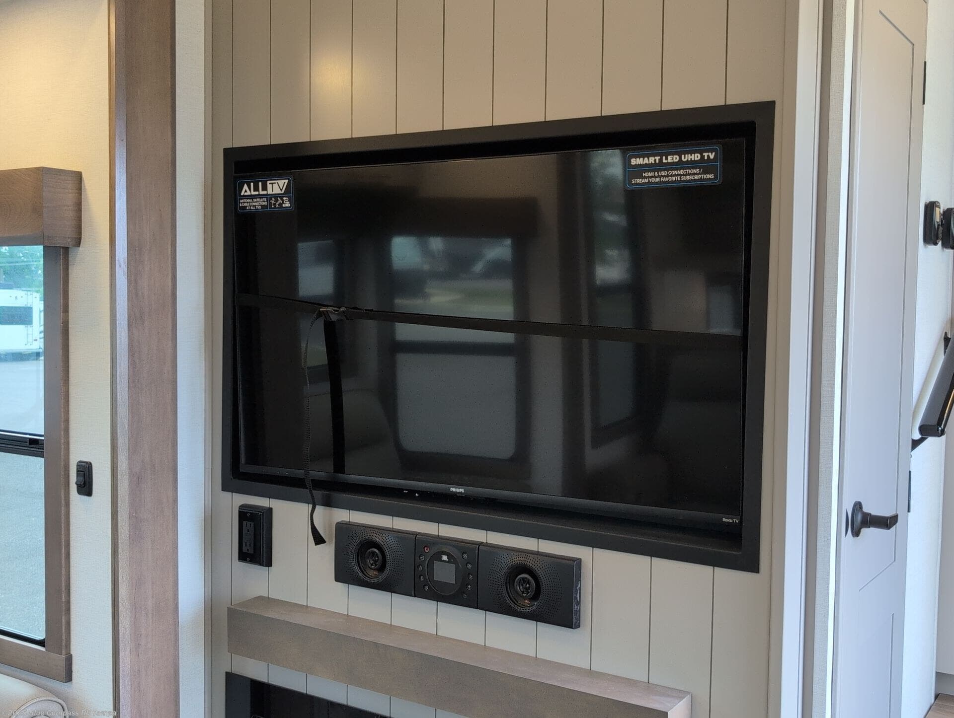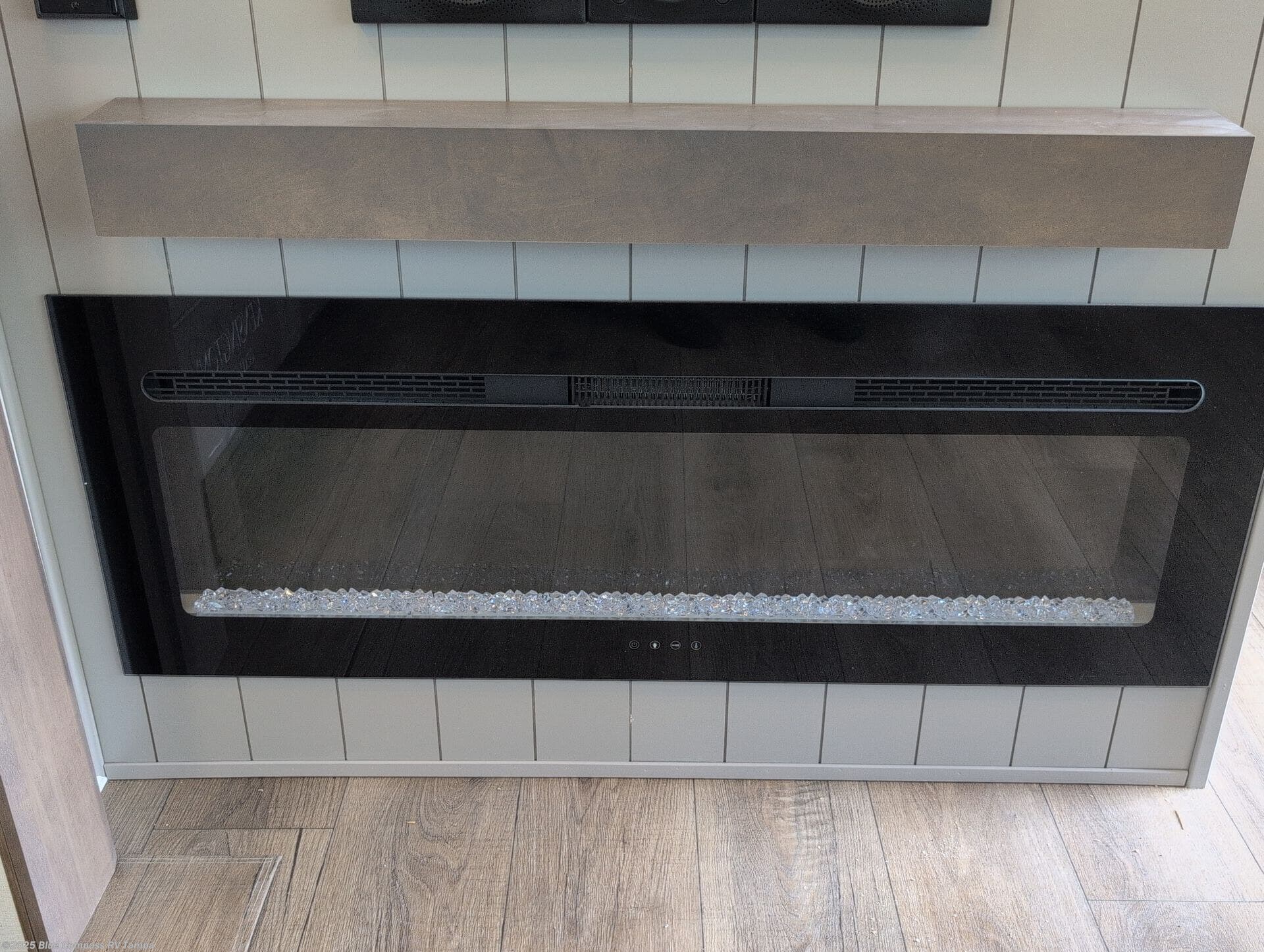You won't want to camp any other way once you step inside this fifth wheel! the chef will enjoy all of the space in the rear kitchen with ample counter space, a 19 cu. ft. 12 volt residential refrigerator, and a pantry for snacks. Everyone will love to meet in the middle living area that includes dual sleeper sofas and a dual recliner loveseat across from the 50" Smart TV and fireplace. The half bathroom is nearby for quick bathroom breaks too. You will feel right at home in the master suite with a king bed slide to lay your head on at night, a flip top dresser with a Smart TV above it to watch your movies in true comfort, and a seat with storage, plus access to the front full bathroom. Inside the bathroom, you will find a 61" x 30" shower to freshen up in and a walk-in closet with a hamper, shelves, and washer and dryer prep for clean clothes throughout your entire trip!