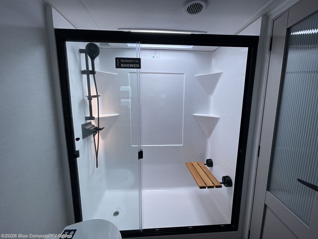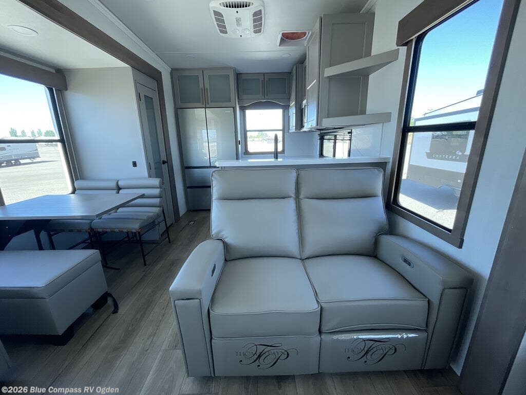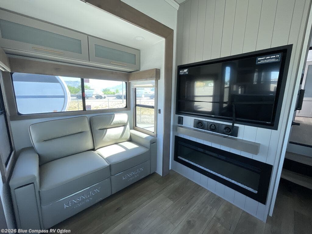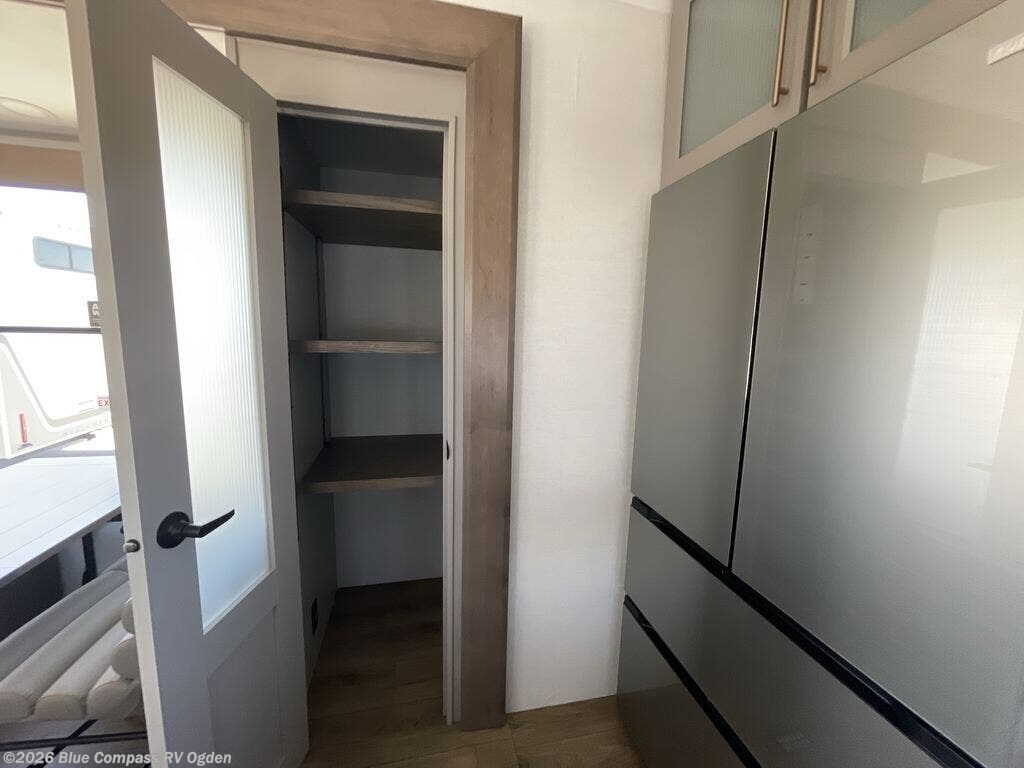 You won't want to camp any other way once you step inside this fifth wheel! the chef will enjoy all of the space in the rear kitchen with ample counter space, a 19 cu. ft. 12 volt residential refrigerator, and a pantry for snacks. Everyone will love to meet in the middle living area that includes dual sleeper sofas and a dual recliner loveseat across from the 50" Smart TV and fireplace. The half bathroom is nearby for quick bathroom breaks too. You will feel right at home in the master suite with a king bed slide to lay your head on at night, a flip top dresser with a Smart TV above it to watch your movies in true comfort, and a seat with storage, plus access to the front full bathroom. Inside the bathroom, you will find a 61" x 30" shower to freshen up in and a walk-in closet with a hamper, shelves, and washer and dryer prep for clean clothes throughout your entire trip!