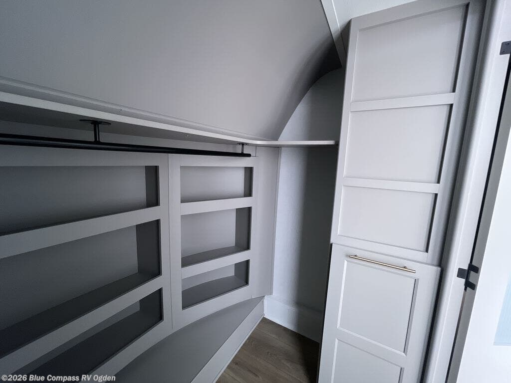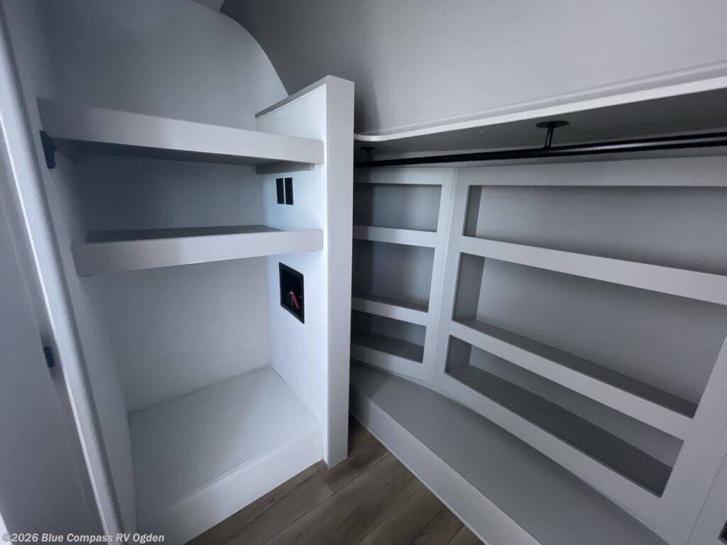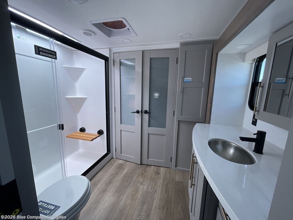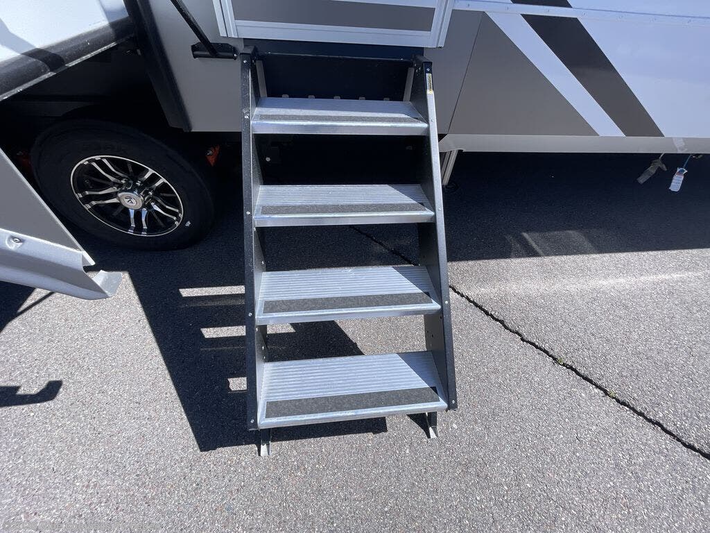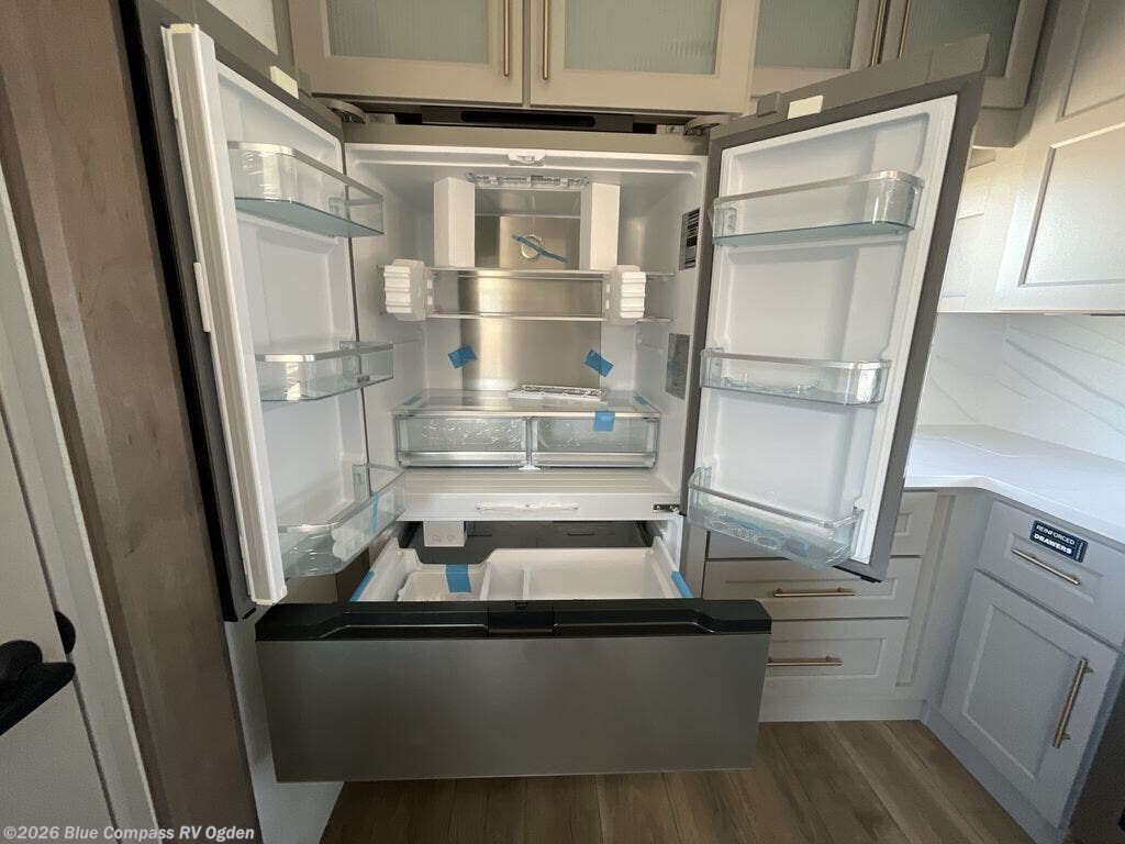 You won't want to camp any other way once you step inside this fifth wheel! the chef will enjoy all of the space in the rear kitchen with ample counter space, a 19 cu. ft. 12 volt residential refrigerator, and a pantry for snacks. Everyone will love to meet in the middle living area that includes dual sleeper sofas and a dual recliner loveseat across from the 50" Smart TV and fireplace. The half bathroom is nearby for quick bathroom breaks too. You will feel right at home in the master suite with a king bed slide to lay your head on at night, a flip top dresser with a Smart TV above it to watch your movies in true comfort, and a seat with storage, plus access to the front full bathroom. Inside the bathroom, you will find a 61" x 30" shower to freshen up in and a walk-in closet with a hamper, shelves, and washer and dryer prep for clean clothes throughout your entire trip!