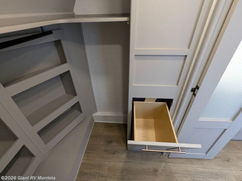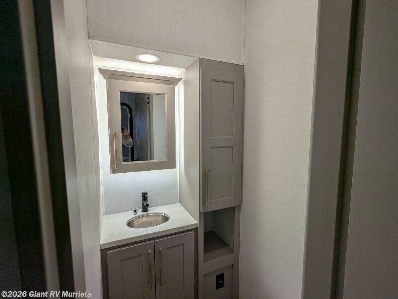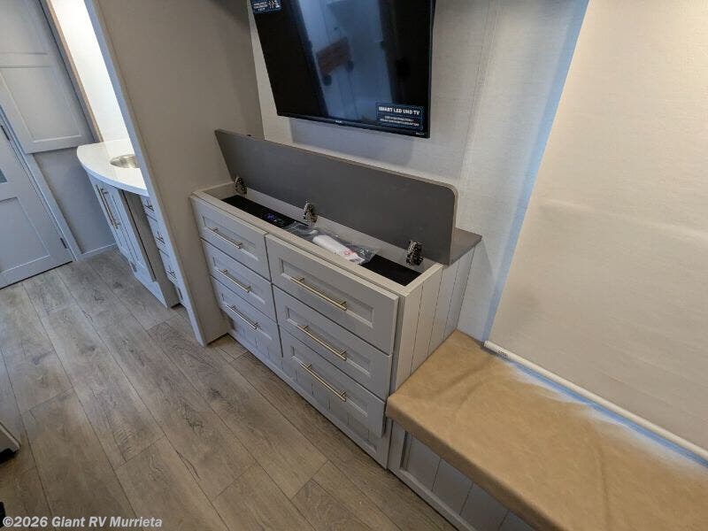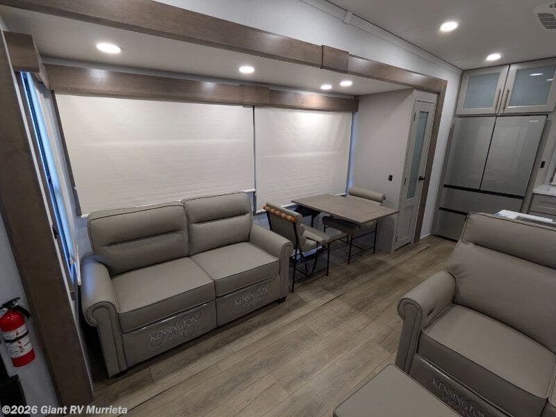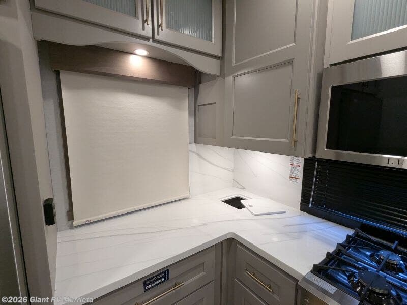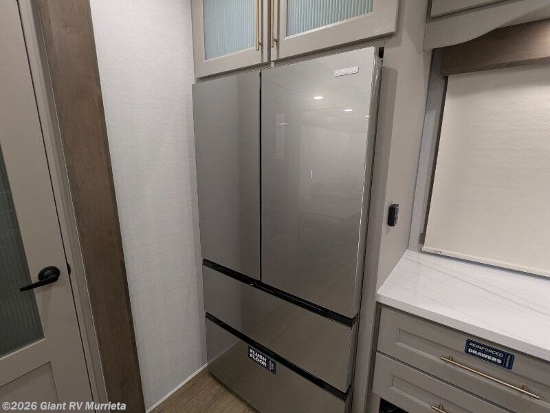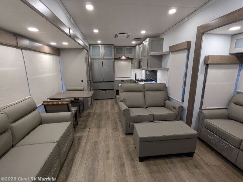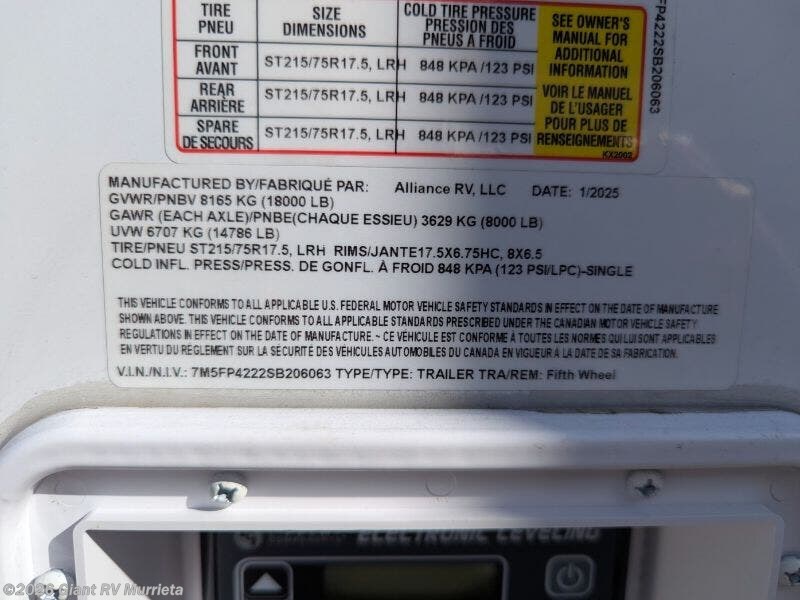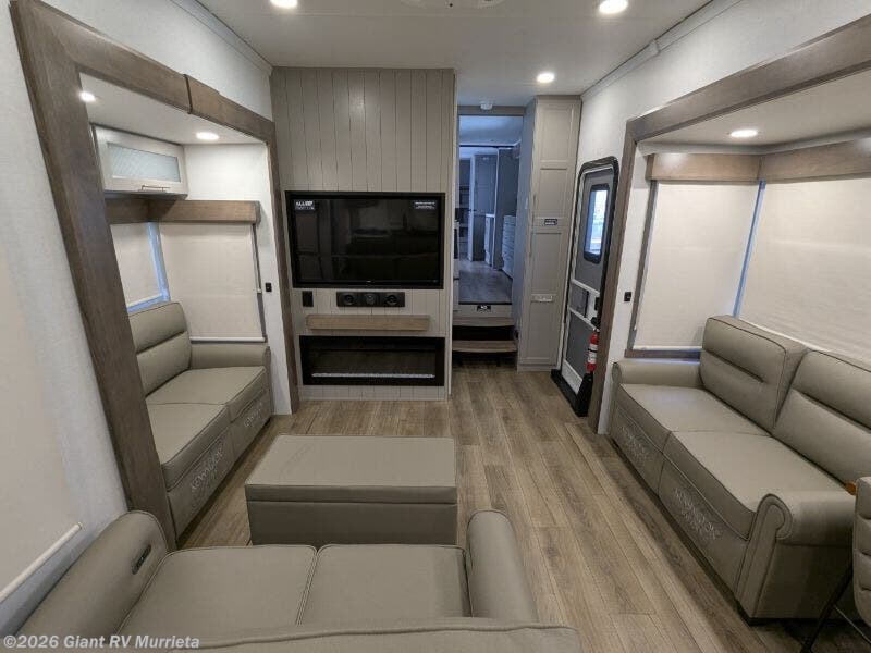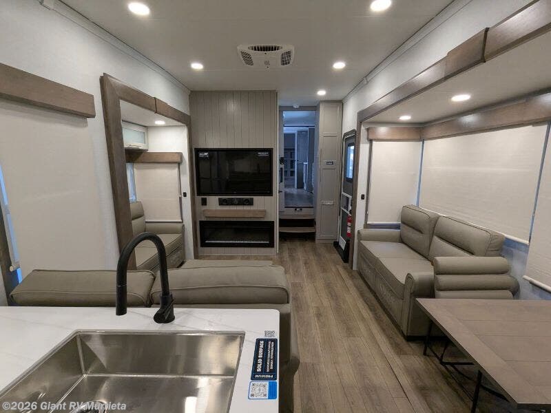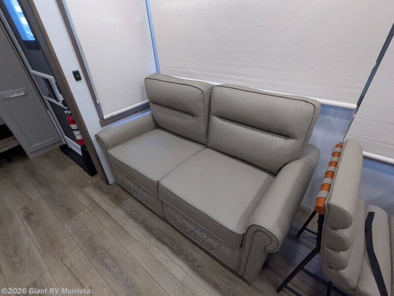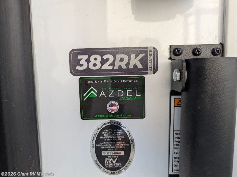 Experience luxury RV living with the 2025 Alliance RV Paradigm 382RK fifth wheel at Giant RV in California! Ideal for couples, this RV features a rear kitchen with a 19 cu. ft. fridge, Insignia range, and island, plus a front king bedroom. Three slide-outs expand the living area with theater seating, a tri-fold sofa, and 50” LED TV. A full bath with shower adds comfort. Enjoy a 16’ power awning, exterior storage, and a 98.3-gal fresh water tank. Equipped with three 13,500 BTU A/Cs, a 40,000 BTU furnace, and 6-point hydraulic leveling.