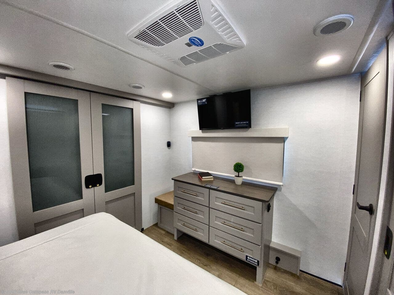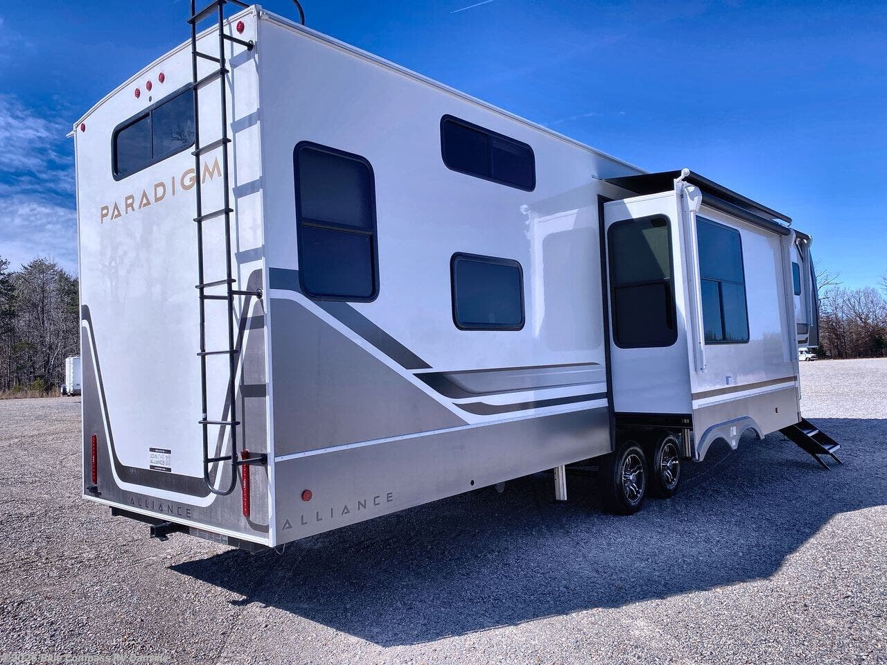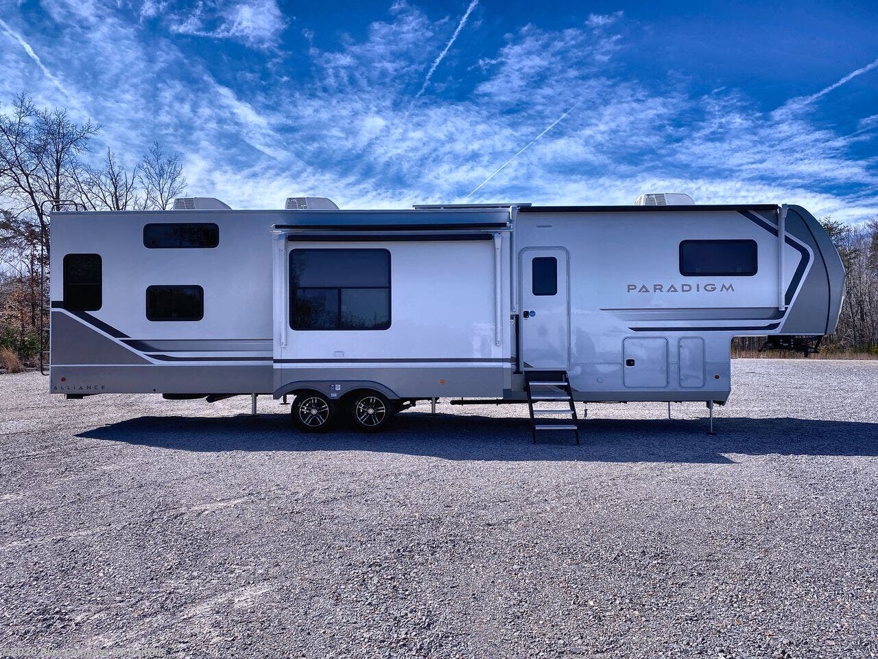 The Paradigm fifth wheels by Alliance RV are functional, high-quality, and luxurious for an unforgettable camping experience. There are three A/C units and a 40K BTU furnace to keep you comfortable year around, and you'll appreciate additional convenient amenities, like the all-in-one enclosed/heated utility center and the color coded and numbered wiring. A Rota-Flex pin box comes standard for hassle-free towing, along with Super-G 4,400 lb. rated tires and Dexter 7,000 lb. axles. You'll love the kitchen with its LG solid surface countertops and Lusso range, plus there is LED motion lighting in the pantry and a Maxx fan with a rain sensor to keep everything fresh when making dinner. Each model also includes an HD Smart TV in the living room and bedroom, plus a Winegard Air 360 antenna to keep you connected to the outside world. And of course there are a variety of options you can choose from to further customize your fifth wheel; dual pane windows, Super Solar Plus, slide out awning toppers, and generator prep or a generator to name a few!