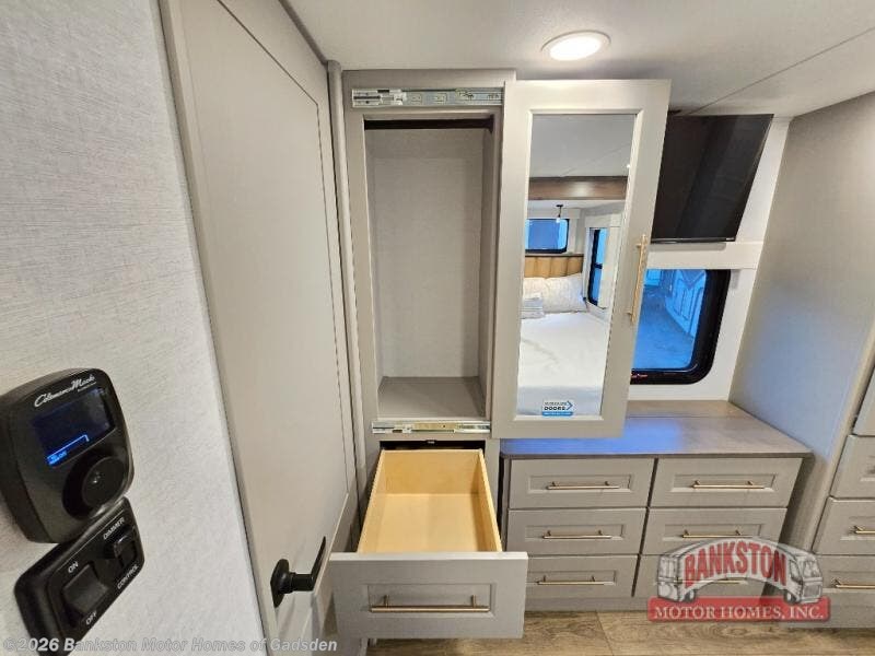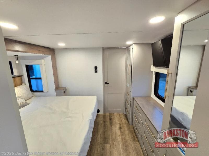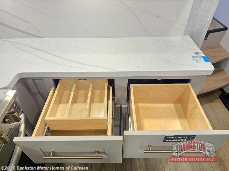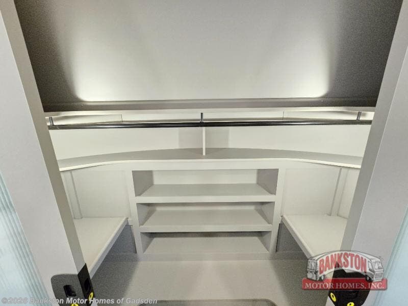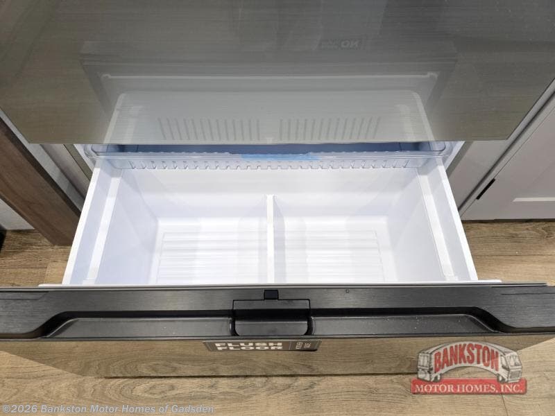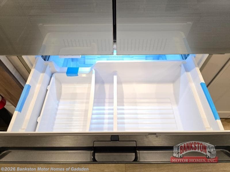 A spacious unit with sleeping for eight with plenty of choices to suit everyone! There is a front private bedroom with a king size bed that offers a large full front closet that has also been prepped for a washer and dryer if you choose that option. The front bath features a 40" x 30" shower and dual entry. Head down to the kitchen and living space at the bottom of the stairs to find a curbside slide that houses the 19 cu. ft. residential refrigerator, a pantry, and a swivel table and desk. As you continue on toward the rear of this coach, you will find a spacious living area along the roadside with a 50" Smart TV and a fireplace, a sofa sleeper slide, and a dual reclining loveseat. This makes a great gathering place for television watching, game playing, and even added sleeping space if needed at night. The rear private bedroom with its own private bath features a queen bed, two closets, and a Smart TV as well. The multipurpose loft area above can be accessed just before this rear bedroom entry by a ladder, and it is perfect for extra storage, or it can be used for added sleeping that the kiddos are sure to love.