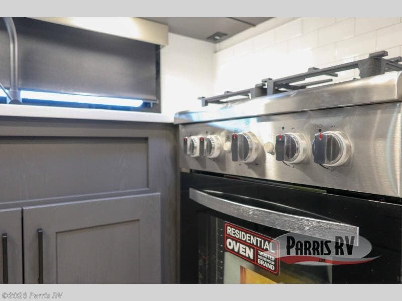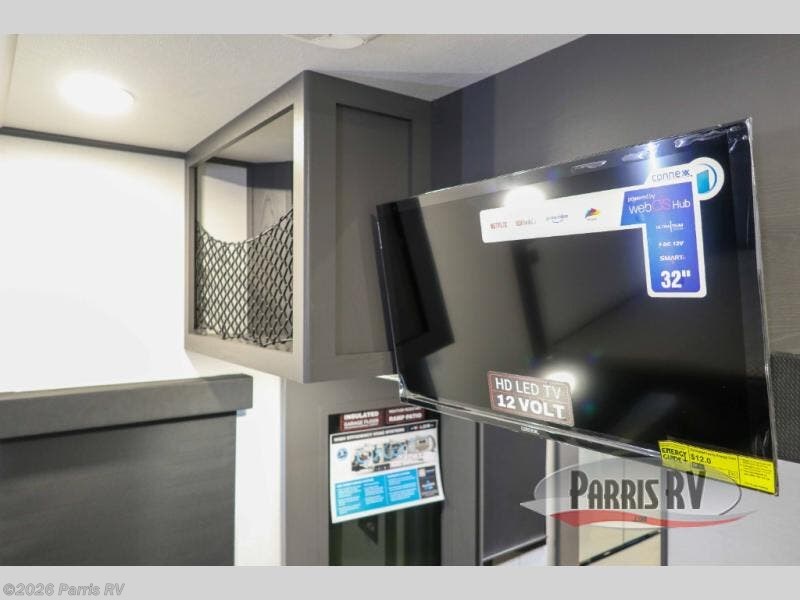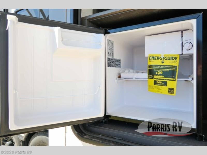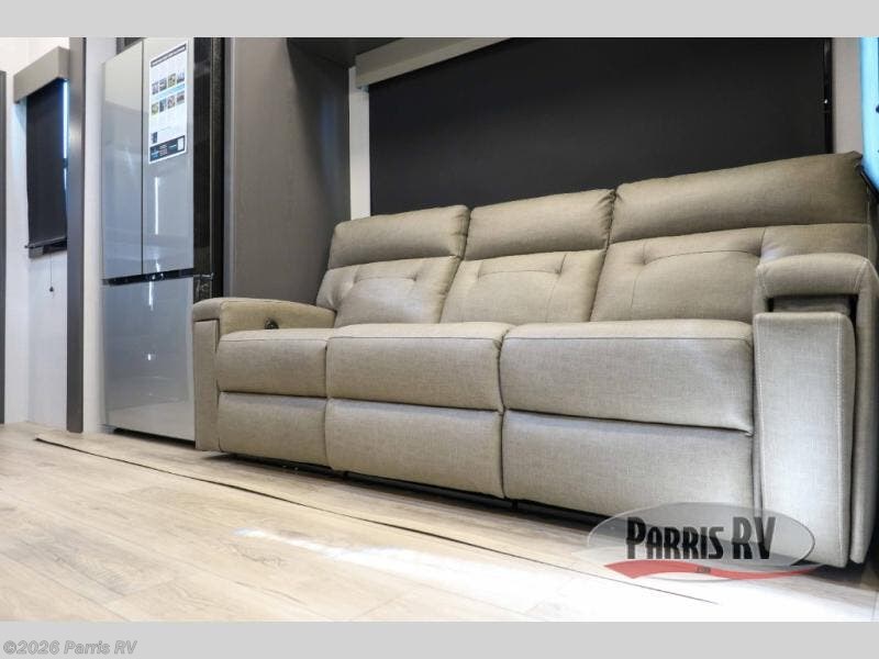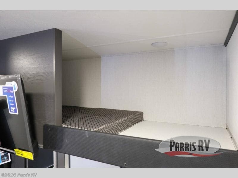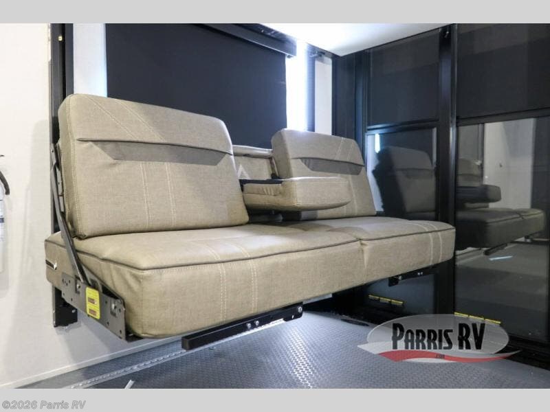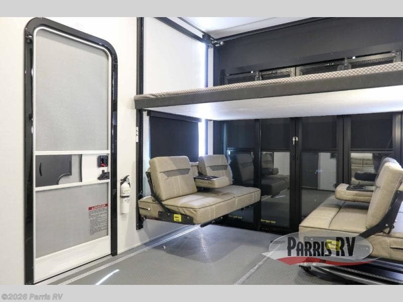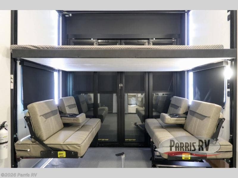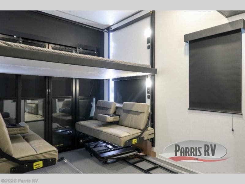 There is room for your off-road toys and the whole family in this toy hauler! The bath and a half makes life more convenient and the dual entry doors create a smooth flow of traffic in and out of the unit. Aside from 13' of garage space, an air compressor, and an entrance/exit door, there are also opposing HappiJac sofas with a queen bed above them, a loft that opens to the garage, and a half bathroom. The chef can prepare their best meals with the four burner cooktop while two others sit at the flip up counter with two bar stools. After a fun day on the trails, wash up in the full bathroom with the 48" x 30" shower, grab your pajamas from the front wardrobe or flip top dresser in the front private bedroom then relax on one of the two sofas by the fireplace and 50" HDTV!