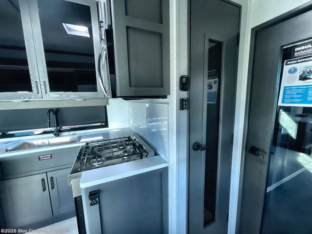 There is room for your off-road toys and the whole family in this toy hauler! The bath and a half makes life more convenient and the dual entry doors create a smooth flow of traffic in and out of the unit. Aside from 13' of garage space, an air compressor, and an entrance/exit door, there are also opposing HappiJac sofas with a queen bed above them, a loft that opens to the garage, and a half bathroom. The chef can prepare their best meals with the four burner cooktop while two others sit at the flip up counter with two bar stools. After a fun day on the trails, wash up in the full bathroom with the 48" x 30" shower, grab your pajamas from the front wardrobe or flip top dresser in the front private bedroom then relax on one of the two sofas by the fireplace and 50" HDTV!