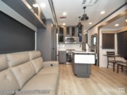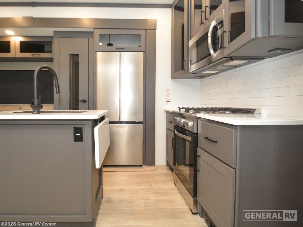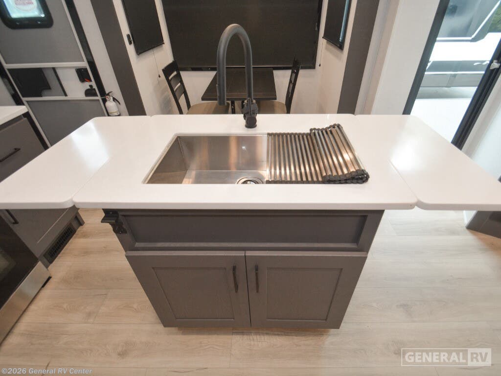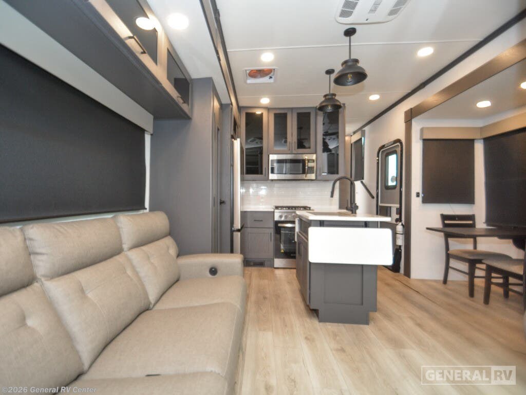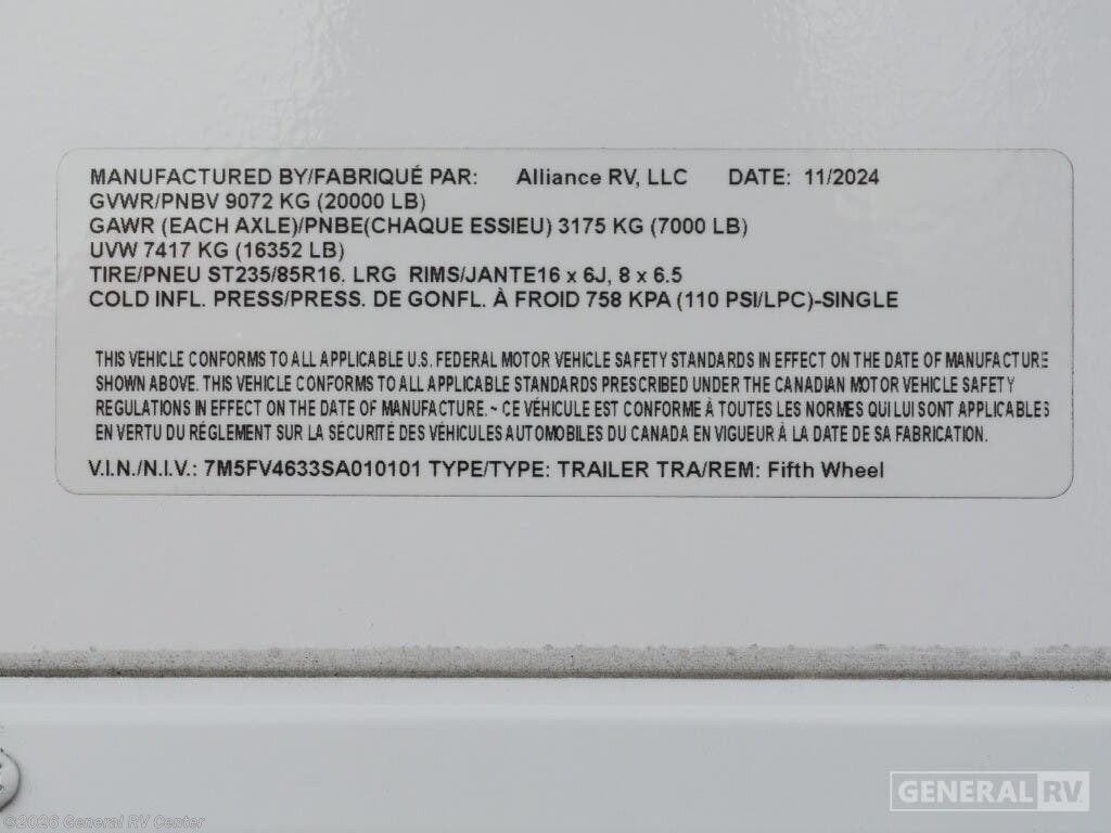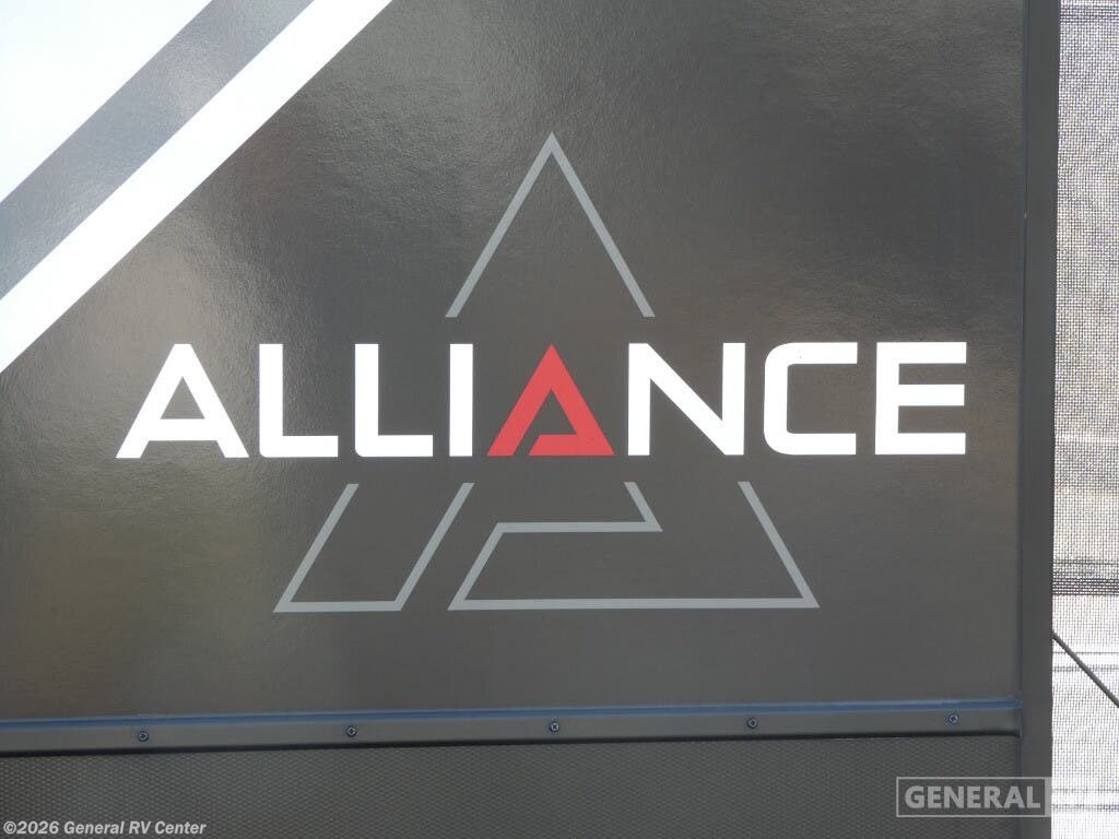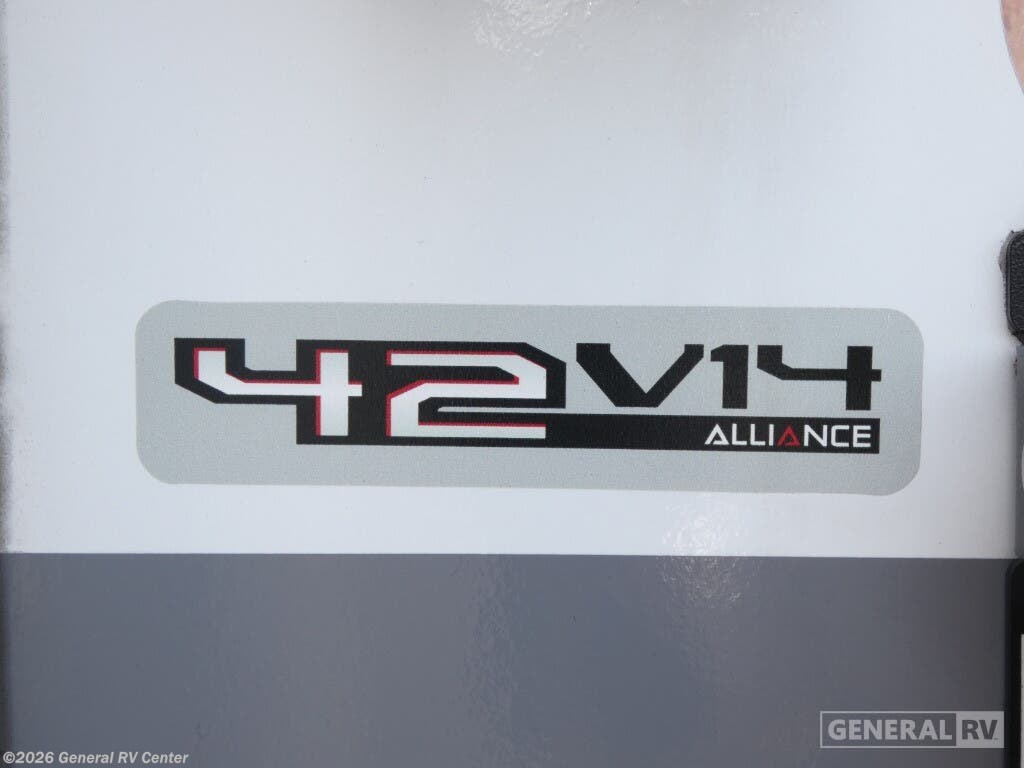 Discover the epitome of luxury and functionality with the 2025 Alliance RV Valor 42V14. This impressive fifth wheel seamlessly combines comfort with adventure, offering a spacious layout that sleeps up to seven. The heart of the RV is its center kitchen, equipped with a full-size electric refrigerator and a four-burner cooktop, perfect for crafting delicious meals on the road. The adjacent living area invites relaxation with ample seating, making it an ideal spot for family gatherings or unwinding after a day of exploration. The Valor 42V14 boasts a versatile 14-foot garage, providing plenty of space for your toys and gear, while doubling as an additional sleeping area with its rollover sofas and loft bed. The luxurious front bedroom offers a king bed, ensuring restful nights, and the unit is prepped for a washer and dryer for added convenience. With dual powered retractable awnings and a fold-down side patio, outdoor enjoyment is at your fingertips. Plus, the generous fresh, gray, and black water capacities allow for extended adventures without compromise. Experience the ultimate in RV living with the Alliance RV Valor 42V14, where every journey becomes an unforgettable adventure. For more information, visit your nearest General RV dealership location.