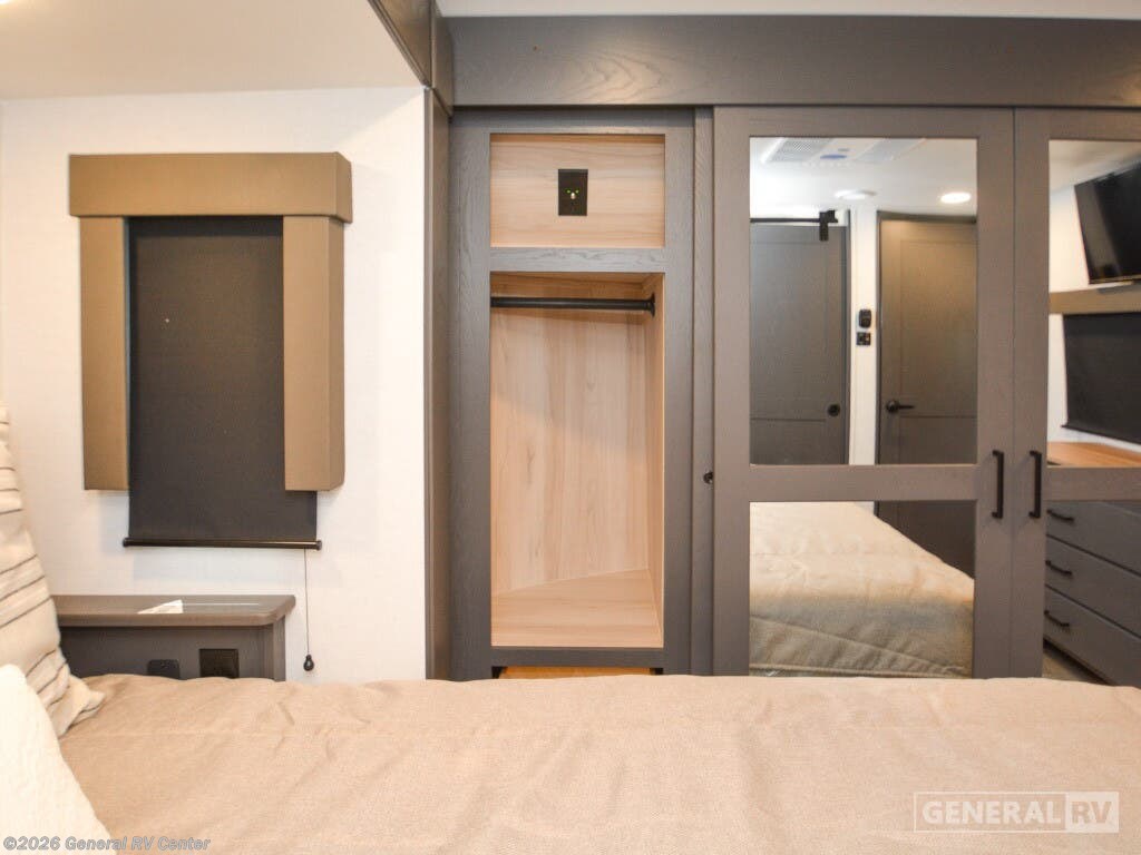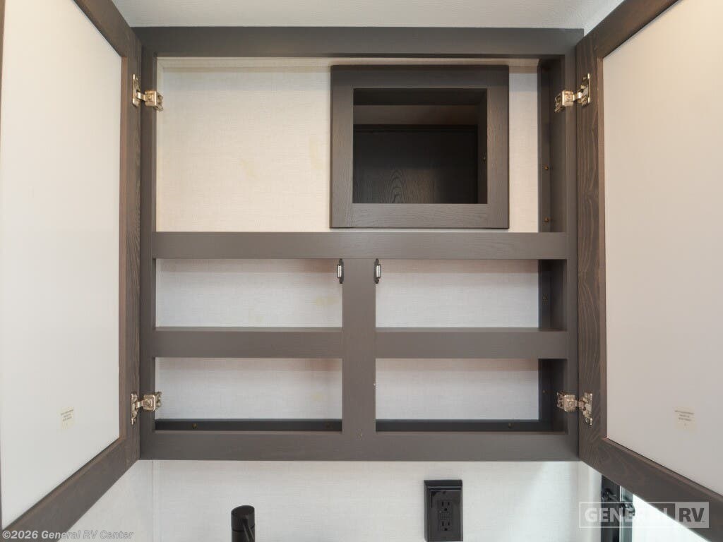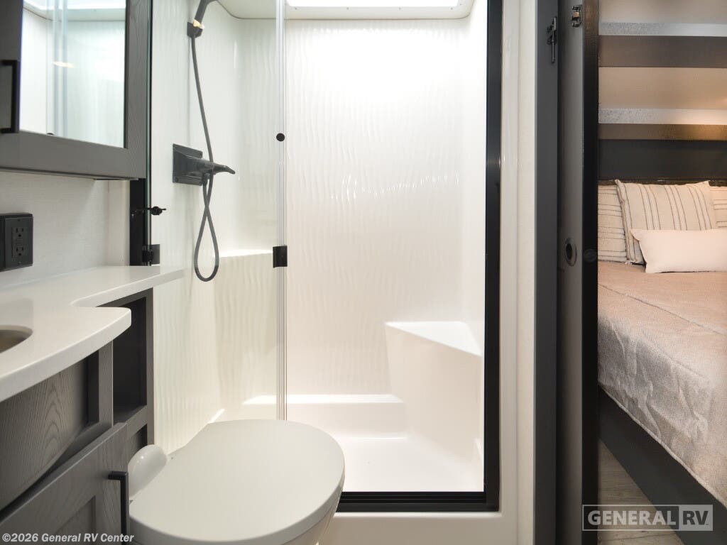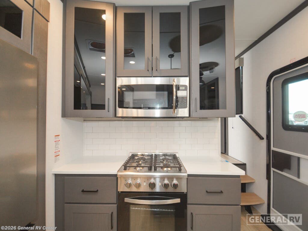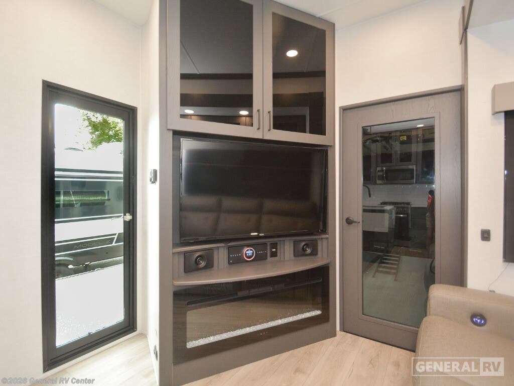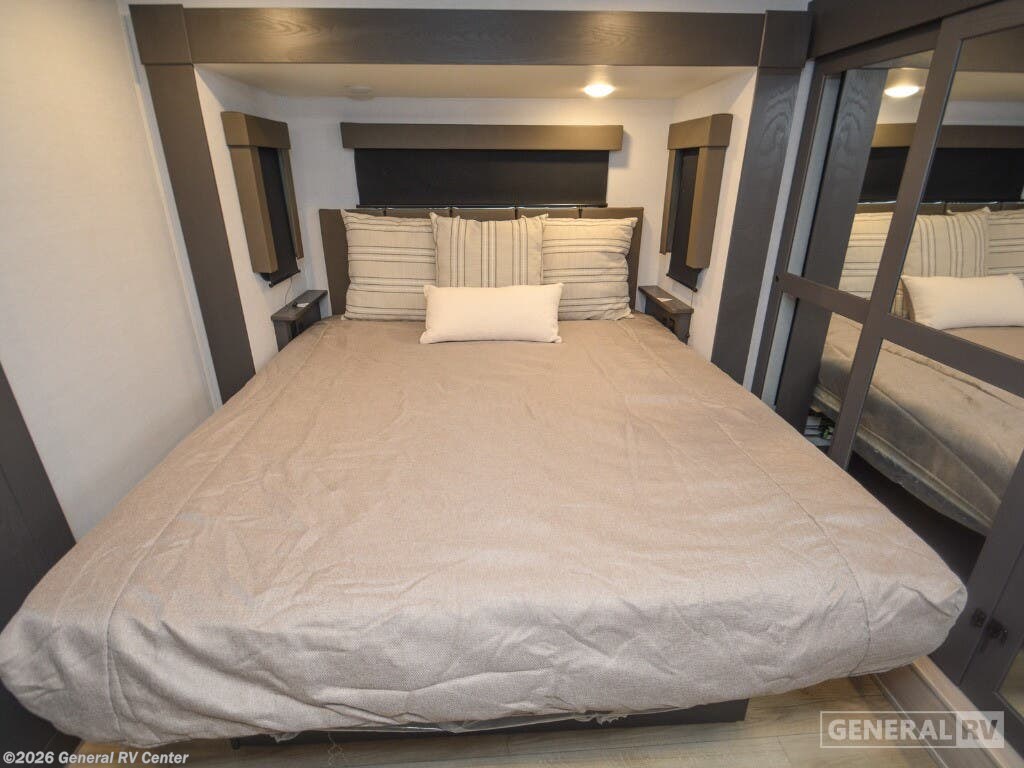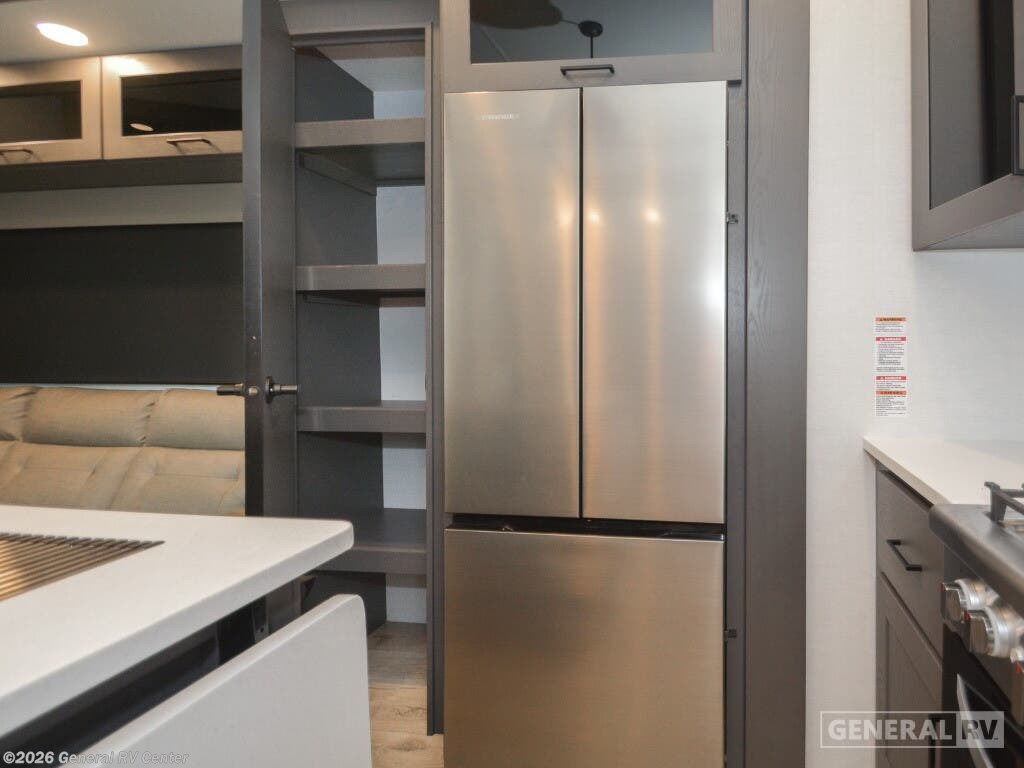 Discover the epitome of luxury and functionality with the 2025 Alliance RV Valor 42V14. This impressive fifth wheel seamlessly combines comfort with adventure, offering a spacious layout that sleeps up to seven. The heart of the RV is its center kitchen, equipped with a full-size electric refrigerator and a four-burner cooktop, perfect for crafting delicious meals on the road. The adjacent living area invites relaxation with ample seating, making it an ideal spot for family gatherings or unwinding after a day of exploration. The Valor 42V14 boasts a versatile 14-foot garage, providing plenty of space for your toys and gear, while doubling as an additional sleeping area with its rollover sofas and loft bed. The luxurious front bedroom offers a king bed, ensuring restful nights, and the unit is prepped for a washer and dryer for added convenience. With dual powered retractable awnings and a fold-down side patio, outdoor enjoyment is at your fingertips. Plus, the generous fresh, gray, and black water capacities allow for extended adventures without compromise. Experience the ultimate in RV living with the Alliance RV Valor 42V14, where every journey becomes an unforgettable adventure. For more information, visit your nearest General RV dealership location.