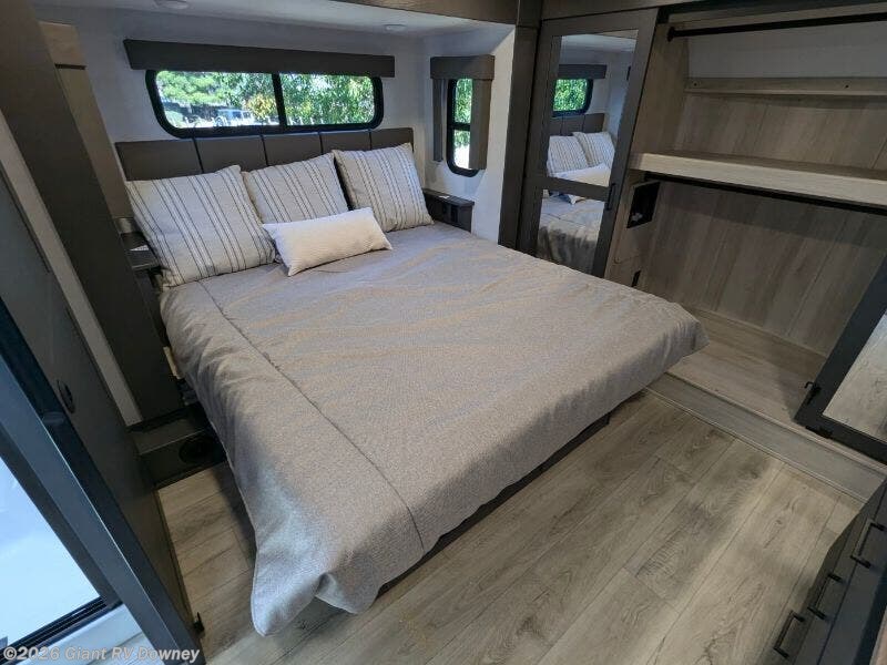 - Gourmet Kitchen: Includes a kitchen island, 12V refrigerator, convection microwave, and ample storage with two hutches and three pantries.