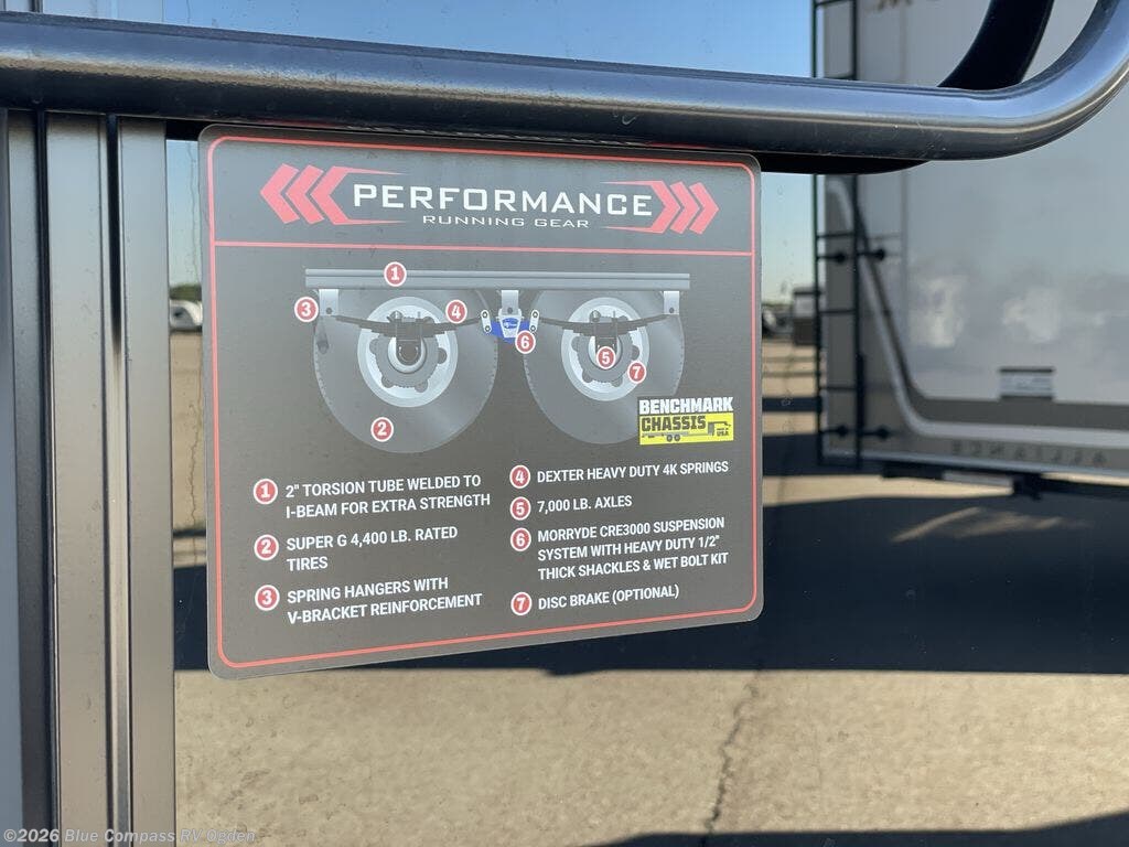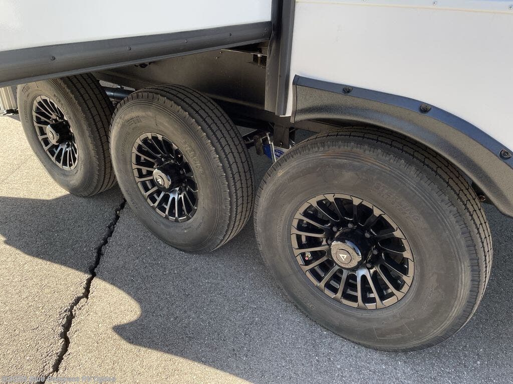 You can bring your toys with you wherever you go with any one of these Alliance RV Valor toy hauler fifth wheels! They are adventure-ready with a quality build from the walk on roof with seamless PVC roof covering to the commercial grade vinyl flooring and MorRyde CRE3000 suspension system. The Performance Running Gear package comes with a 101" wide-body benchmark chassis platform, 7,000 lb. Dexter axles, and a space enhancing drop frame storage compartment to pack in all your riding gear. You can even go off-gridding thanks to the Off the Grid Pack that has two 400 watt solar panels, generator prep, a 40 amp charge controller, and a 100 amp hour lithium iron phosphate battery. Some of the interior comforts you will enjoy are the hardwood cabinet doors and drawers, solid surface kitchen countertops, and commercial grade vinyl flooring with no carpet to make clean up a breeze. The Valor toy haulers are also the Master of 12 Volt with USB charging station throughout, a stainless steel refrigerator, and more 12 volt features to make camping hassle-free!