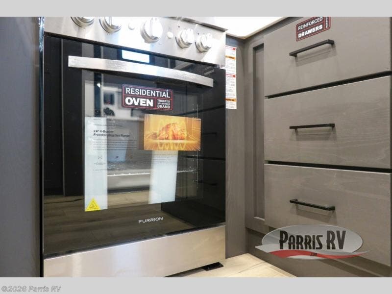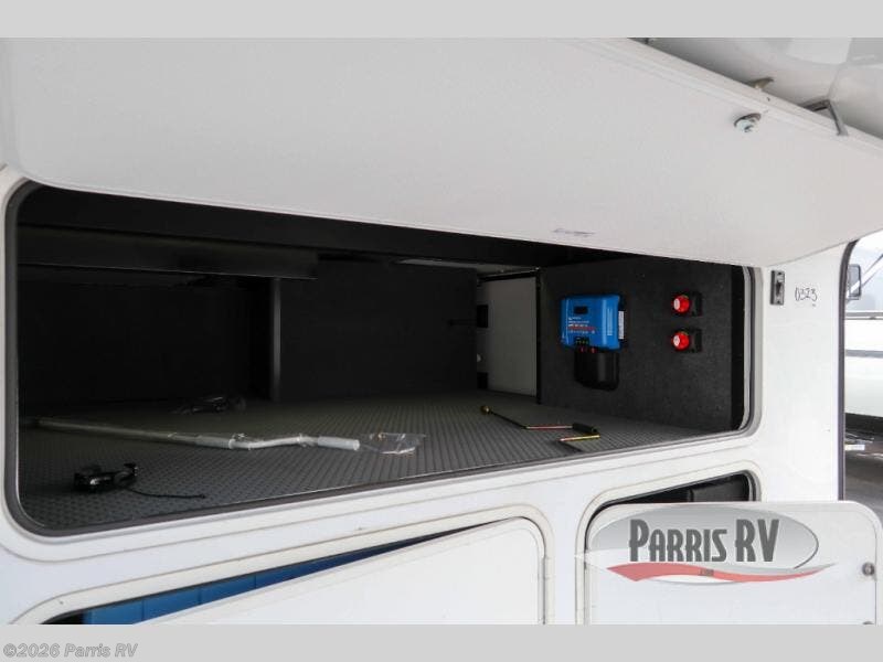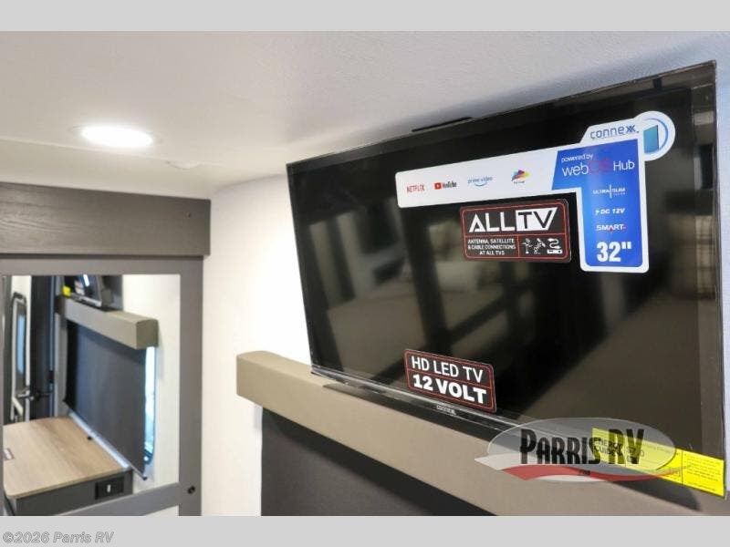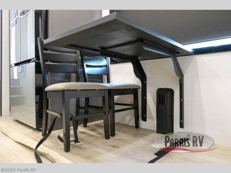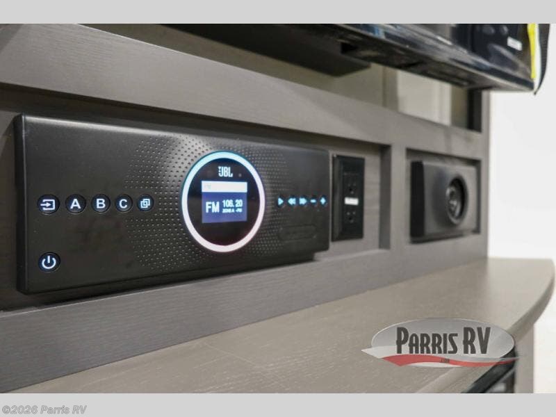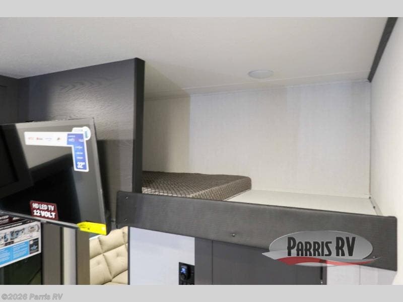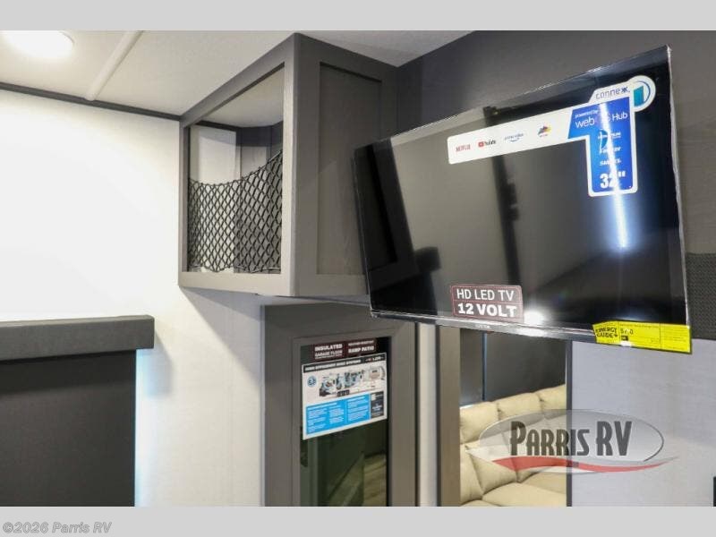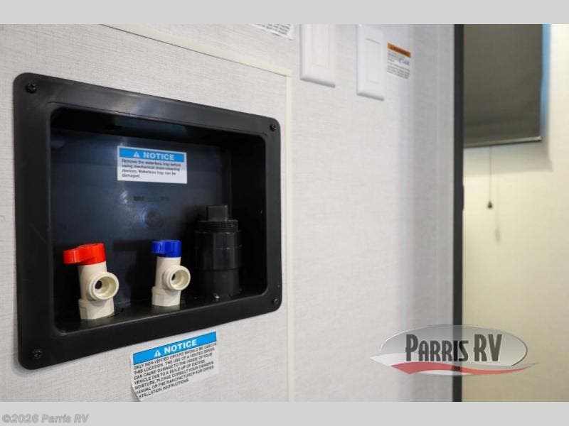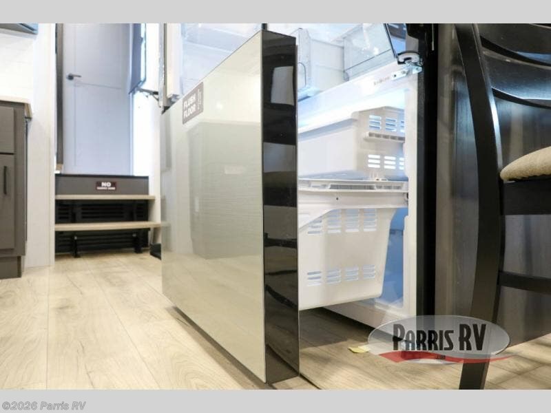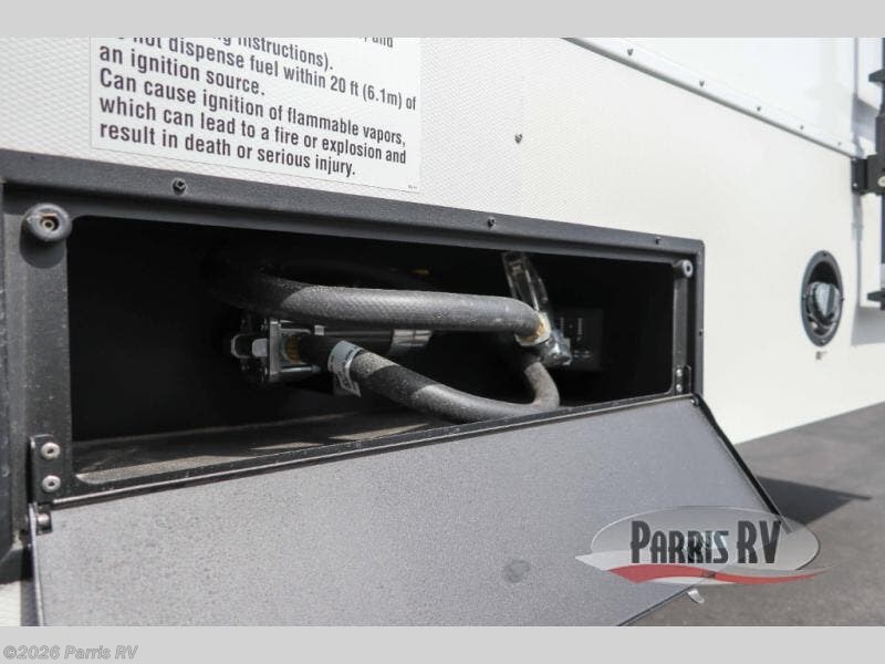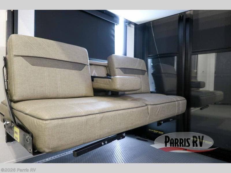 The whole gang will love camping in this toy hauler with 14' of toy parking space for your toys and gear. Once you have arrived at your destination, you can set up the HappiJac roll-over sofas with a queen bed above them, and also a loft which opens to the garage area as well. A half bath is also available off the garage which is an added convenience for those sleeping in this converted area, and for those coming in off the trail so that they do not have to track all through the main unit to use the bathroom. The chef can prepare great meals for their hungry crew with the fully equipped kitchen including a three burner cooktop, a 17 cu. ft. stainless steel 12V refrigerator, large sink, and plenty of countertop prep space. The rest of the gang can be relaxing on the large L-shaped sofa slide watching the 50" HDTV and enjoying the fireplace, or playing a game of cards at the dining table with four chairs. The front private bedroom features a king bed slide for more interior space, a flip top dresser for all of your belongings, and a front wardrobe that is prepped to add an optional washer and dryer, plus it has an entrance into the dual entry bathroom!