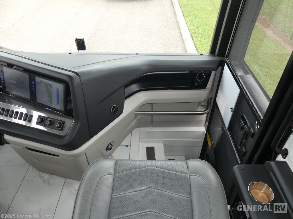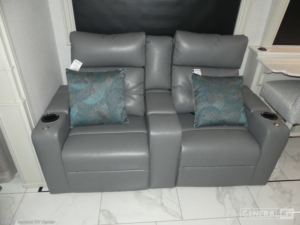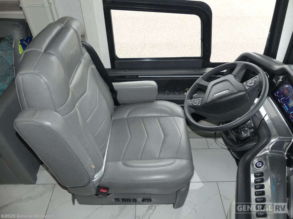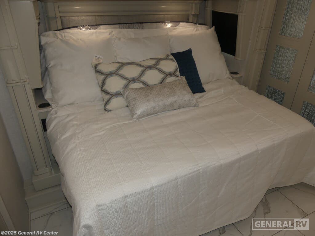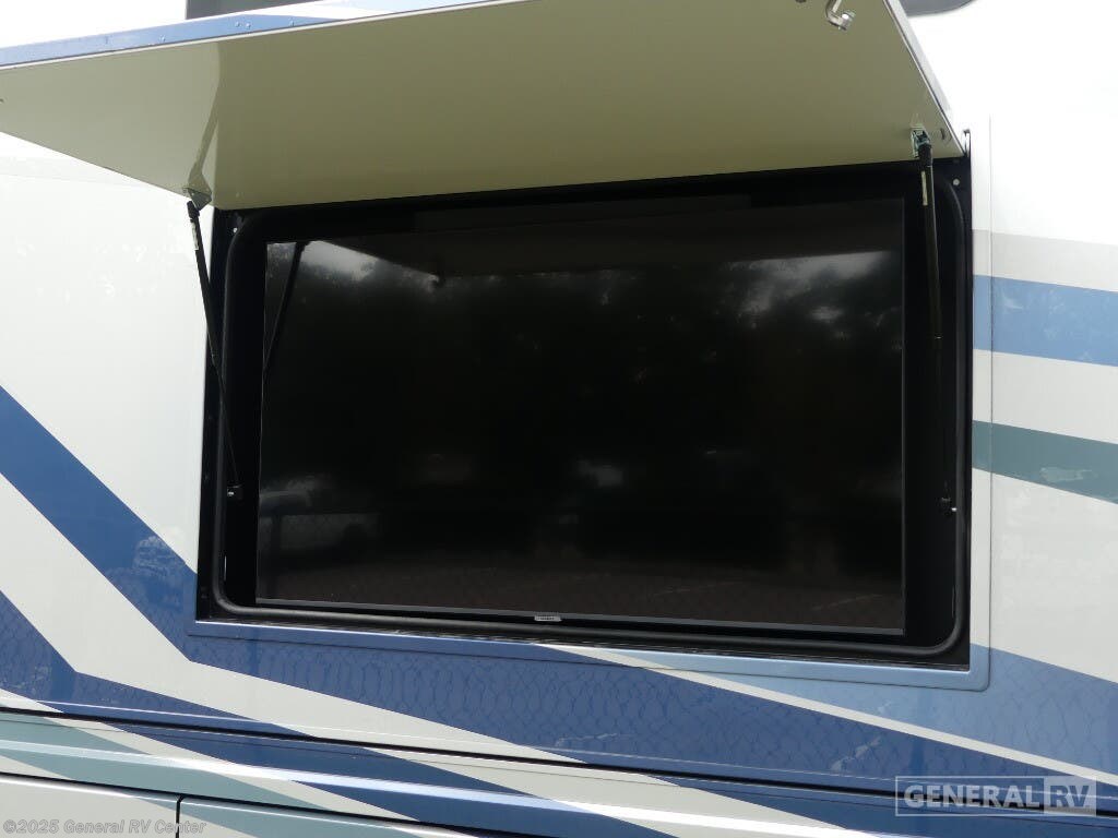 Step into the future of luxury travel with the 2025 American Coach American Dream 45P. This magnificent motorhome, built on the robust Freightliner SLM Series chassis, is powered by a mighty Cummins I6 Diesel Pusher engine, delivering an impressive 605 horsepower and 1950 lb-ft of torque. With a towing capacity of 20,000 pounds, this RV is not only a home on wheels but a powerhouse ready for any adventure. Its sleek exterior houses a 19.7 ft. powered retractable awning, perfect for creating a shaded oasis wherever you roam. Inside, the 45P floorplan offers an exquisite blend of comfort and style. The spacious front living area is adorned with a motion power lounge, ideal for relaxation after a day of exploration. The center kitchen is a culinary enthusiast's dream, featuring a full-size electric refrigerator and convection cooking capabilities. Retreat to the rear center bedroom where a king-sized Encore Series Memory Foam mattress awaits, ensuring restful nights. With a washer and dryer included, extended trips are a breeze. Designed to sleep four comfortably, this RV is perfect for family adventures or luxurious getaways. For more details or to experience this dream firsthand, visit your nearest General RV dealership.