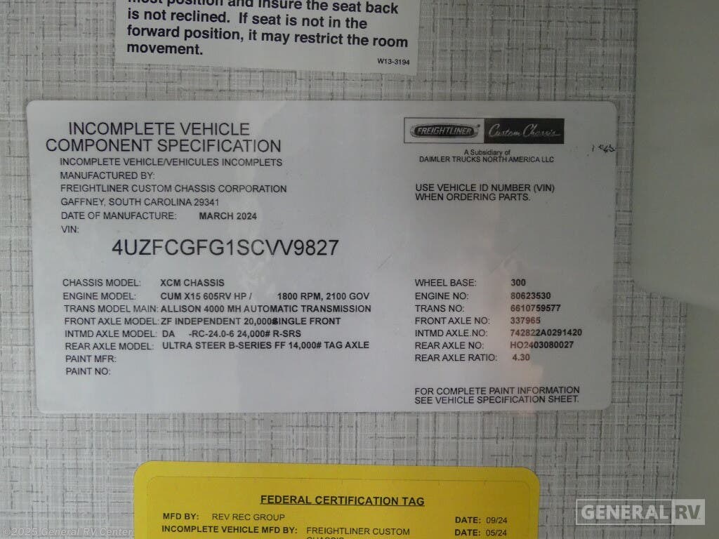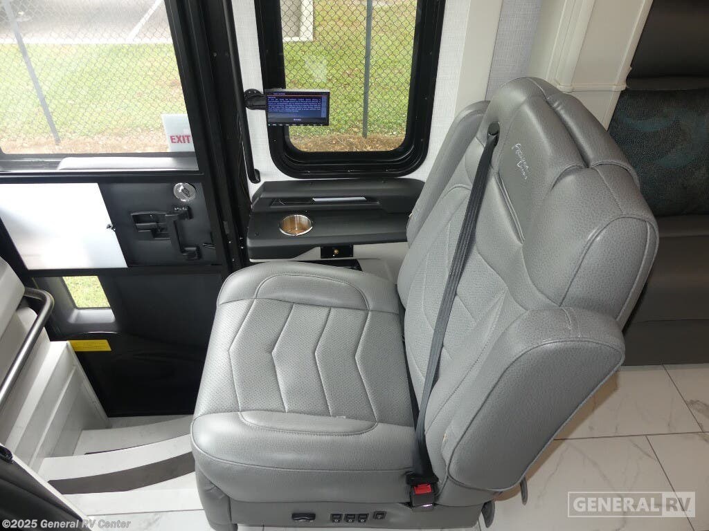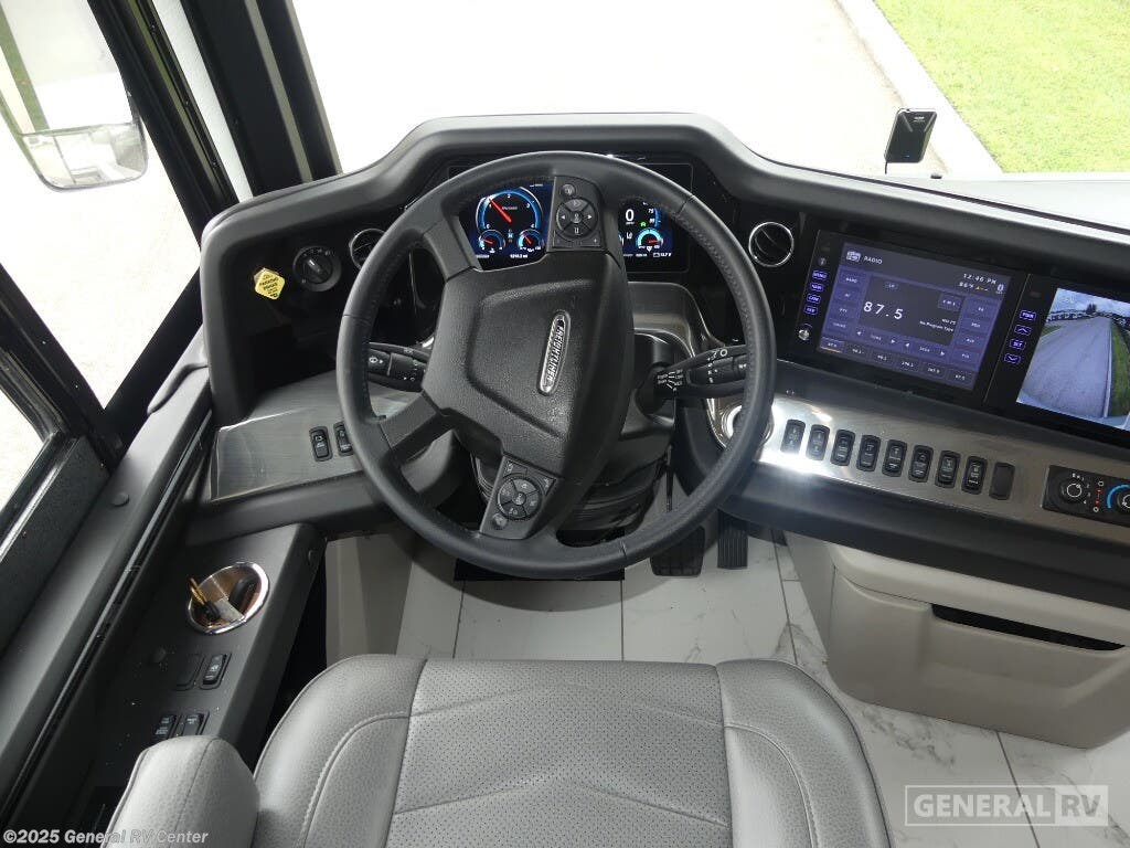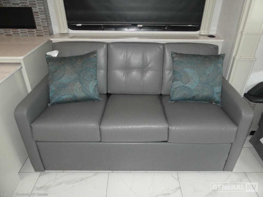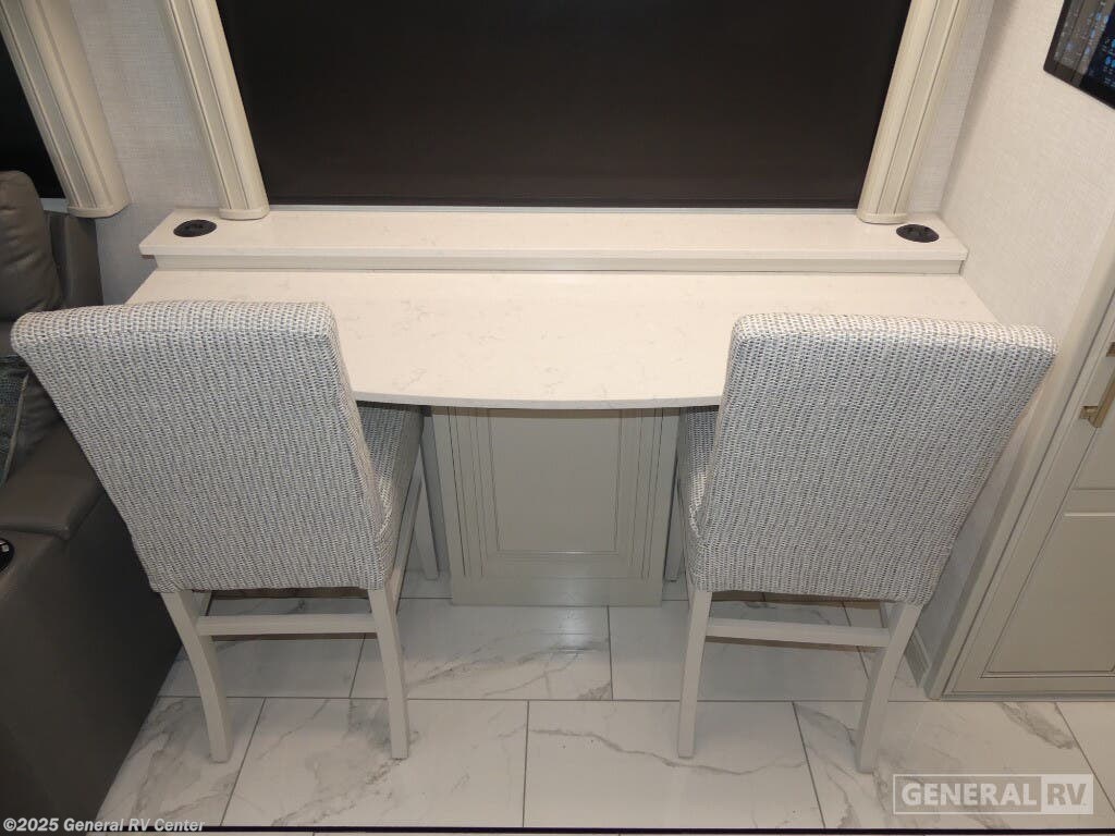 Step into the future of luxury travel with the 2025 American Coach American Dream 45P. This magnificent motorhome, built on the robust Freightliner SLM Series chassis, is powered by a mighty Cummins I6 Diesel Pusher engine, delivering an impressive 605 horsepower and 1950 lb-ft of torque. With a towing capacity of 20,000 pounds, this RV is not only a home on wheels but a powerhouse ready for any adventure. Its sleek exterior houses a 19.7 ft. powered retractable awning, perfect for creating a shaded oasis wherever you roam. Inside, the 45P floorplan offers an exquisite blend of comfort and style. The spacious front living area is adorned with a motion power lounge, ideal for relaxation after a day of exploration. The center kitchen is a culinary enthusiast's dream, featuring a full-size electric refrigerator and convection cooking capabilities. Retreat to the rear center bedroom where a king-sized Encore Series Memory Foam mattress awaits, ensuring restful nights. With a washer and dryer included, extended trips are a breeze. Designed to sleep four comfortably, this RV is perfect for family adventures or luxurious getaways. For more details or to experience this dream firsthand, visit your nearest General RV dealership.
