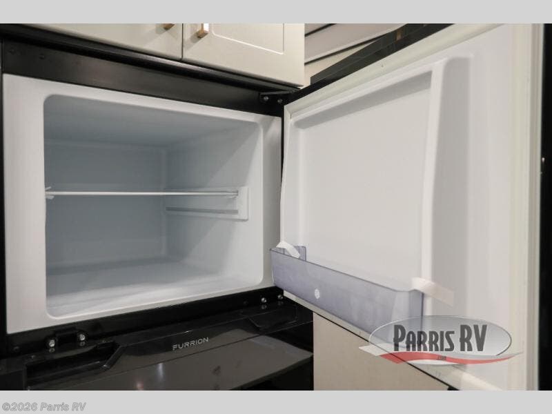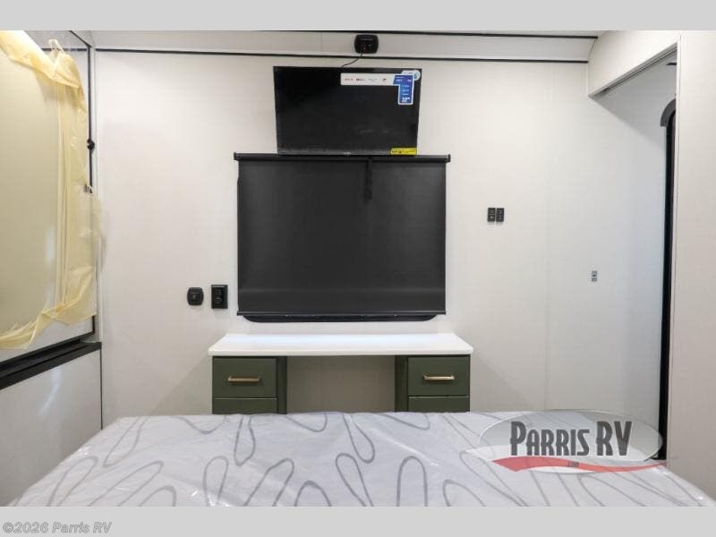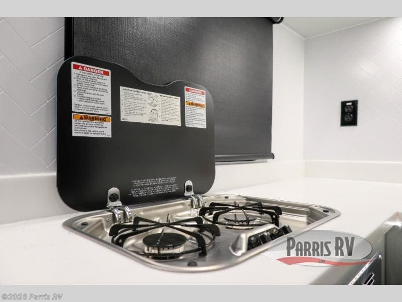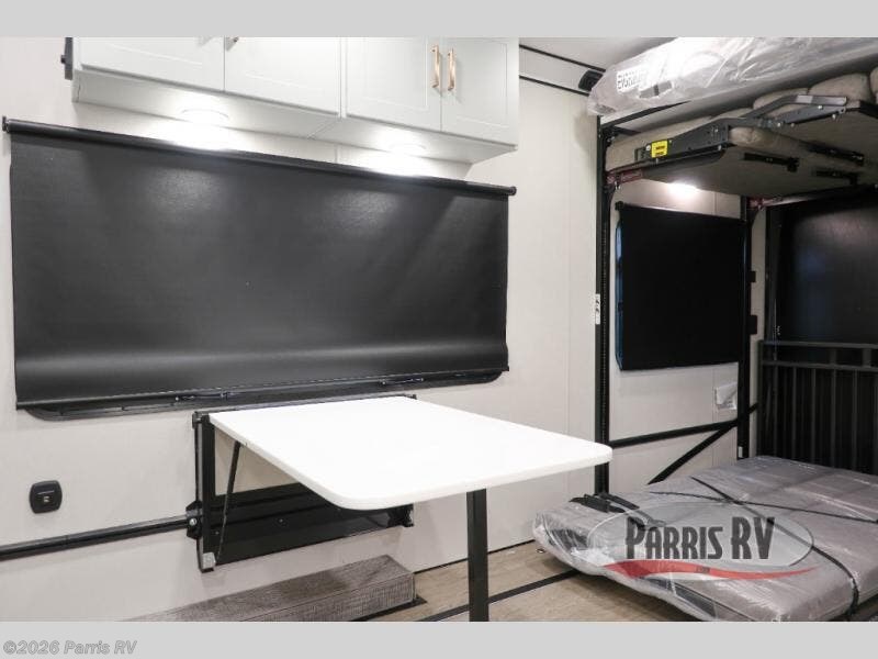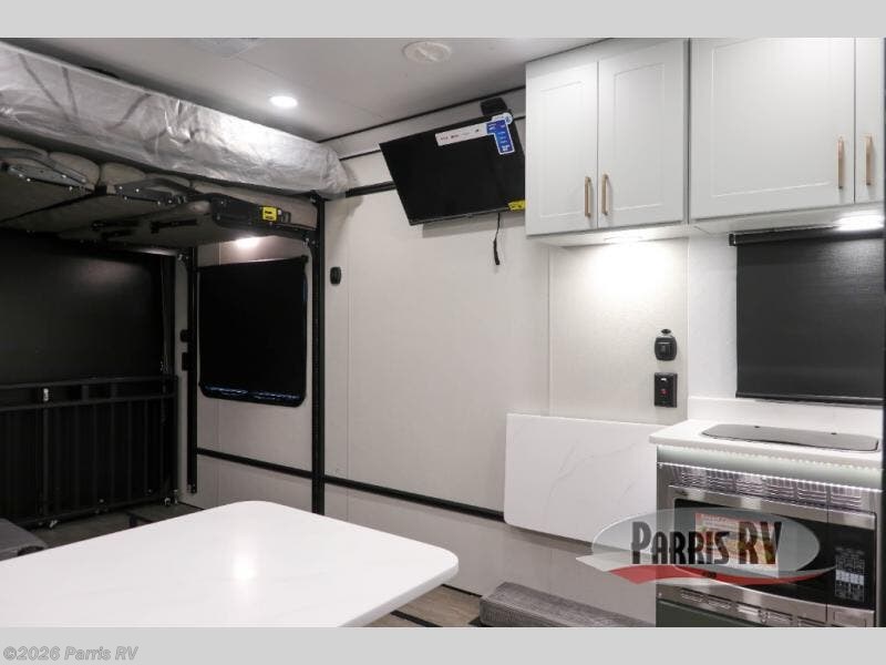 Time spent in this toy hauler will be time well spent! There is 14' 1" total garage space for your toys plus a cableless rear ramp door for easy unloading. You can whip up a meal on the LP two burner cooktop or in the convection microwave when you get back from trail riding, and the 10 cu. ft. 12V refrigerator will keep your food fresh. There is also a dinette table with four folding chairs where you can dine together. A full bath lets you clean up before bed, and you'll find a front private bedroom with a queen bed slide for more space and comfort, along with a front wardrobe for your clothes and shoes!