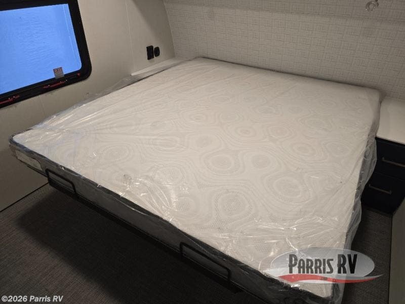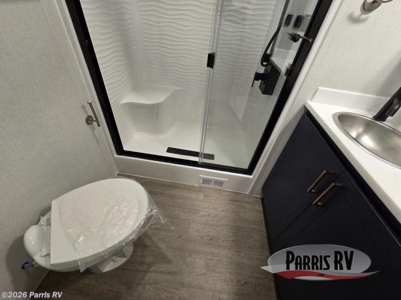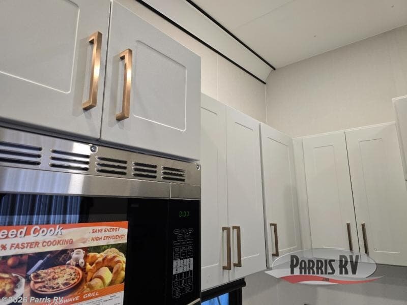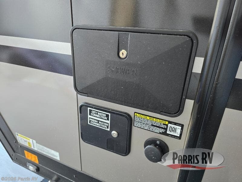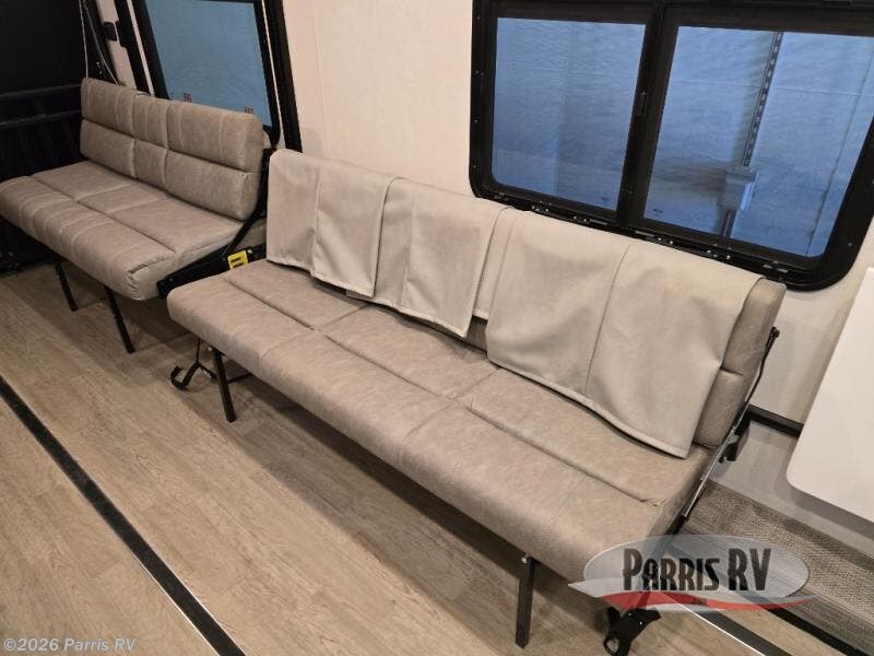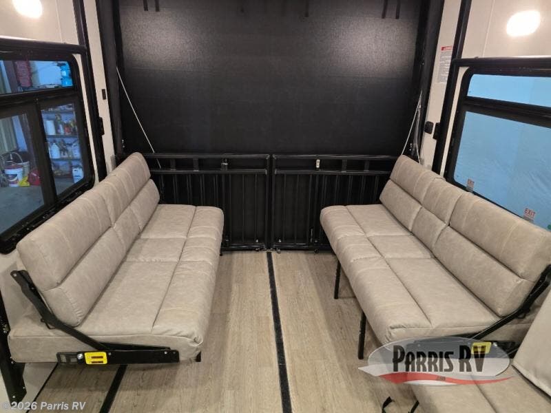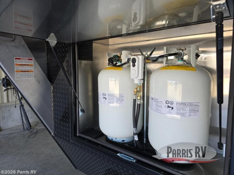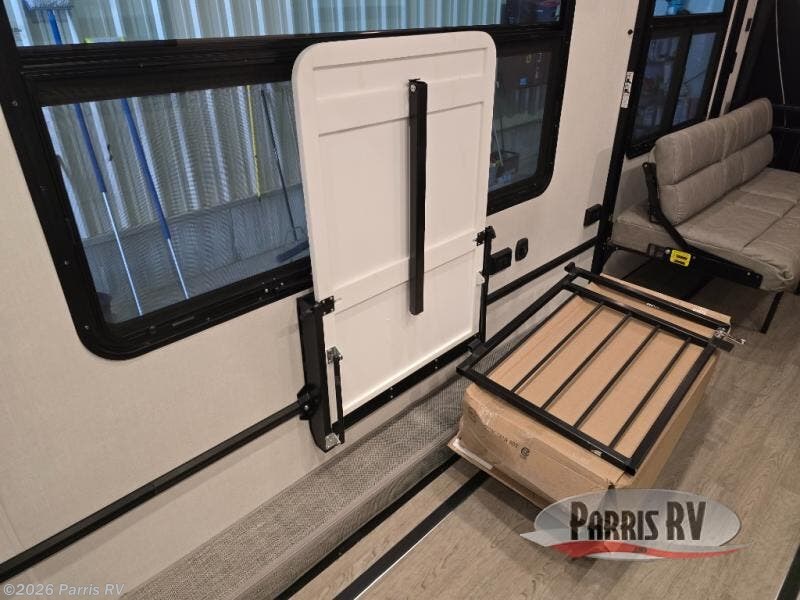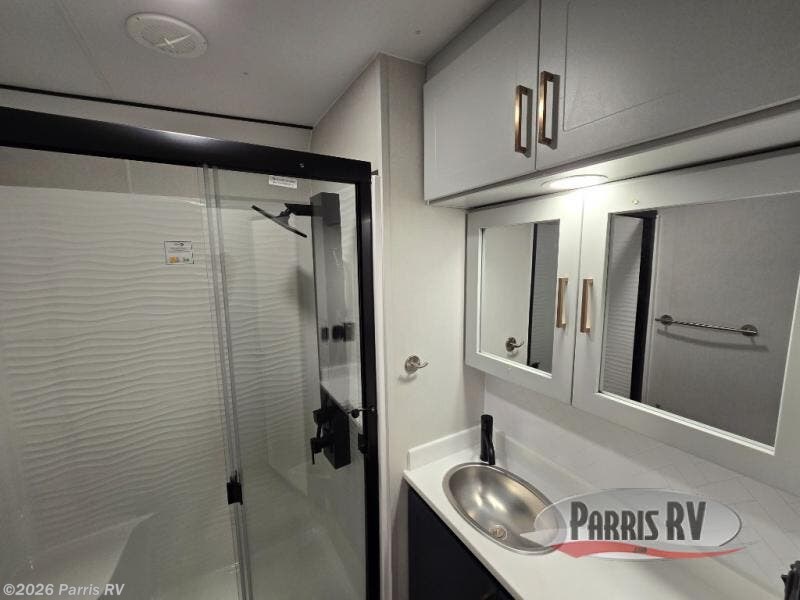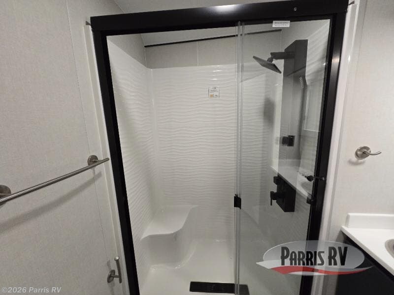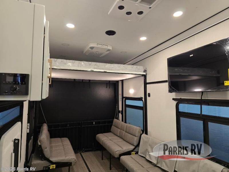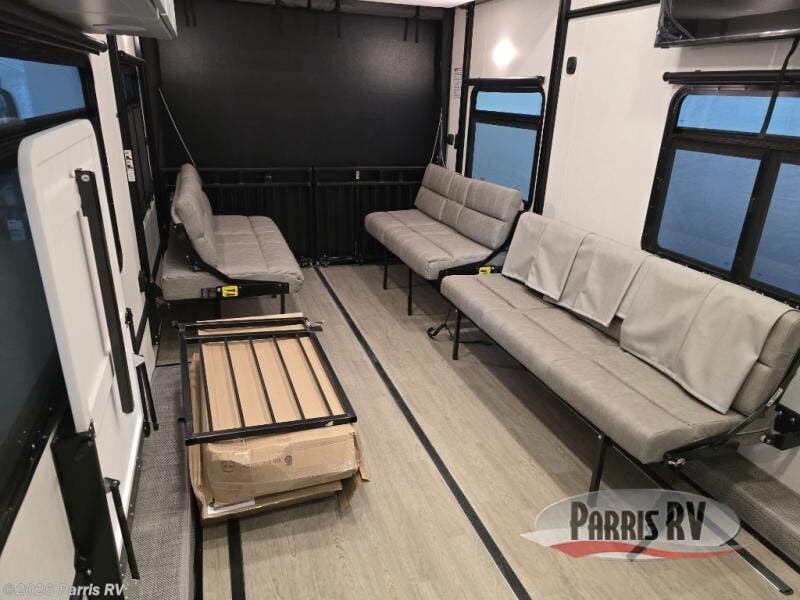 Start a new adventure in this spacious toy hauler that can sleep 2-10 depending on the options you choose to add! Once your toys are unloaded using the cableless rear ramp door, you can head out on a trail or two. You'll find a residential queen bed with storage in the front bedroom, along with storage space for your things and TV prep if you want to add a television. The full bath includes a spa/jet shower fixture that is sure to be nice after a day of riding the trails, and there is a glass shower door for added luxury. Head to the kitchen where you can whip up a meal for your crew on the LP three burner cooktop or in the convection microwave, and you can dine at the dinette with four chairs. If you'd like to get some fresh air, take your plate outdoors to sit under the power awning with a light strip!