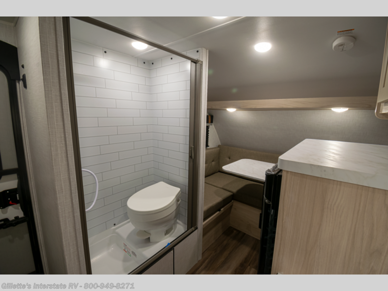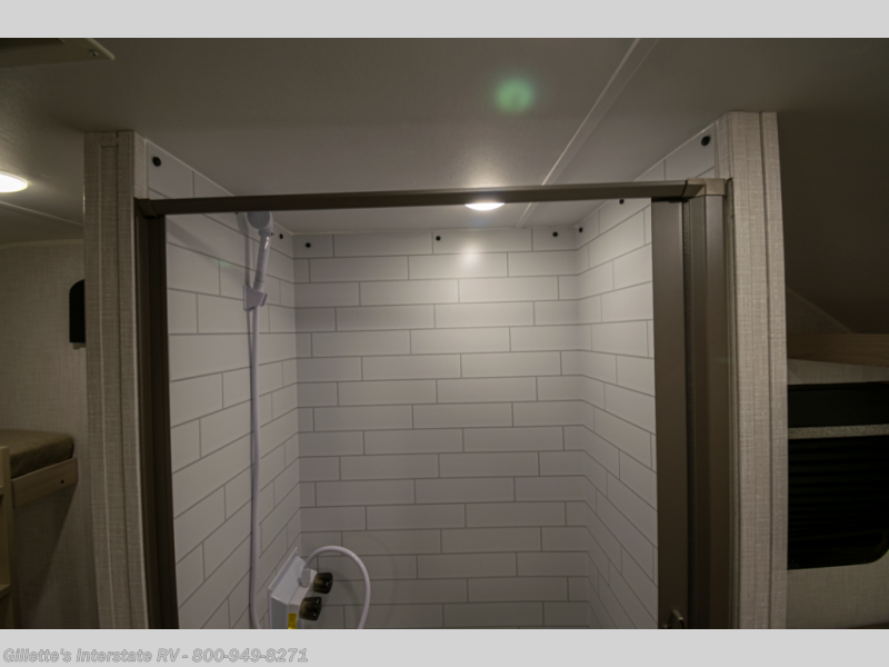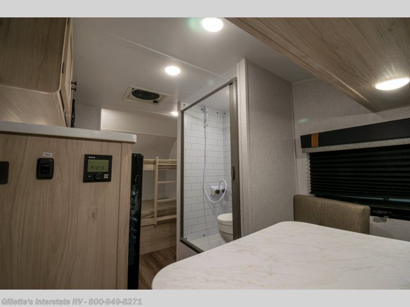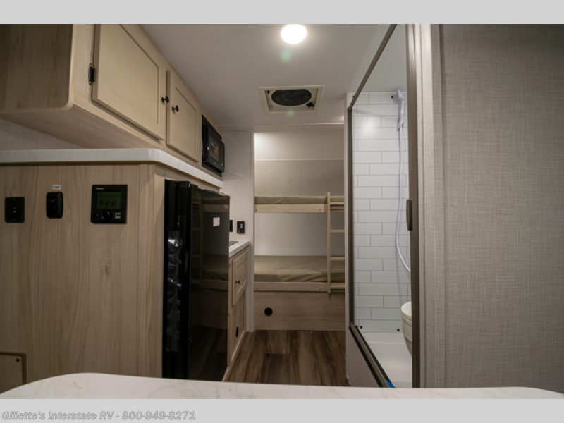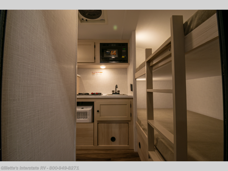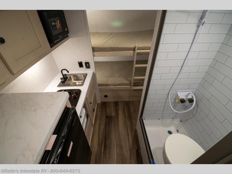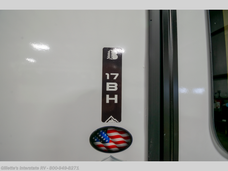 The 17BH features a thoughtful layout with a queen-size bed, a set of bunk beds, and a convertible dinette, providing sleeping space for up to 5 people. The fully equipped kitchen includes a 2-burner cooktop, microwave, refrigerator, and ample storage for your cooking essentials. The bathroom offers a full shower, toilet, and vanity for on-the-road convenience. Designed with adventure in mind, the 17BH includes a power awning, solar prep, and durable construction for long-lasting performance.