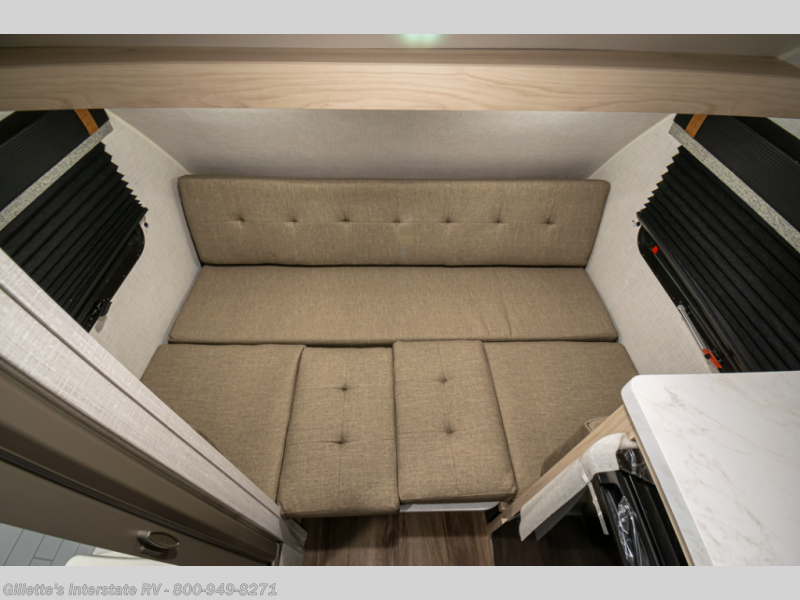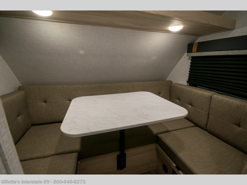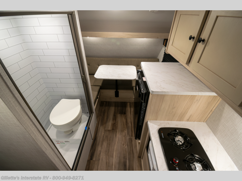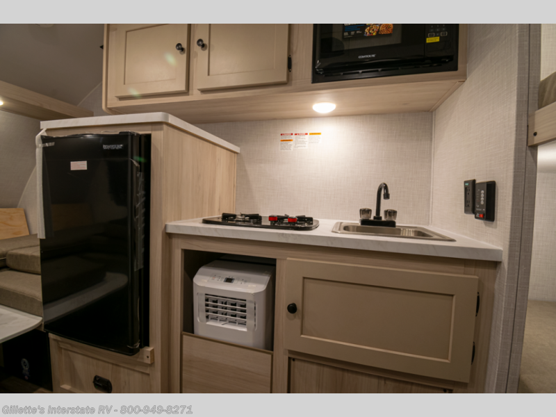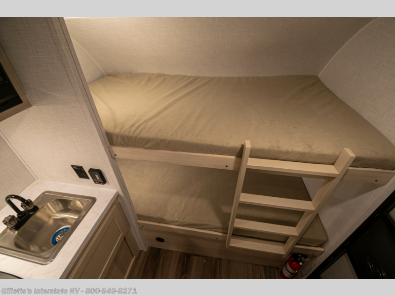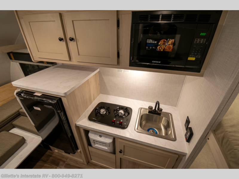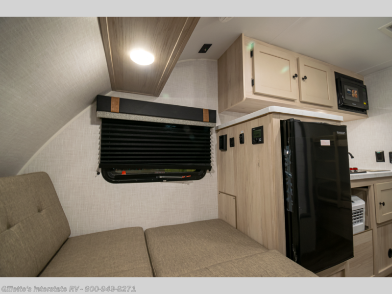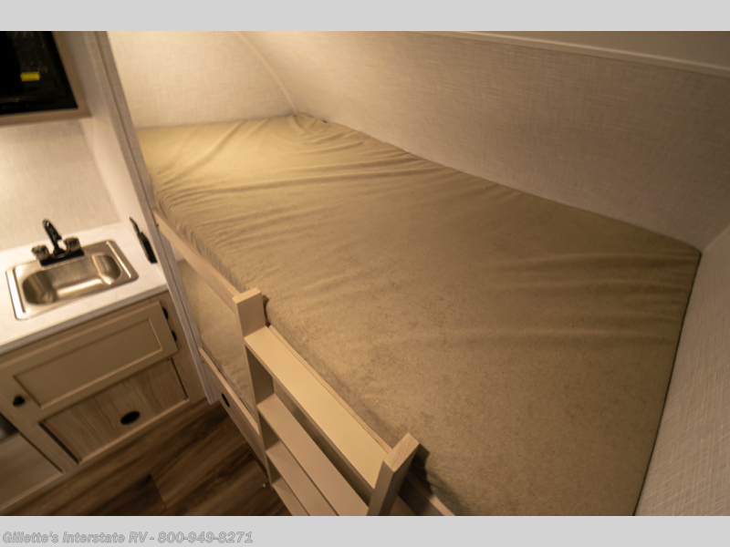 Now you can camp light and bring friends along with you in this teardrop trailer! Your guests or the little ones will love the front bunk beds, while you take the U-shaped dinette with an integrated folding sofa/bed. The chef of your group can prepare breakfast on the two burner cooktop, and there is even a sink here to clean up. This model also includes a 3.3 cu. ft. 12V refrigerator for your perishables and TV prep if you decide to bring along your own TV.