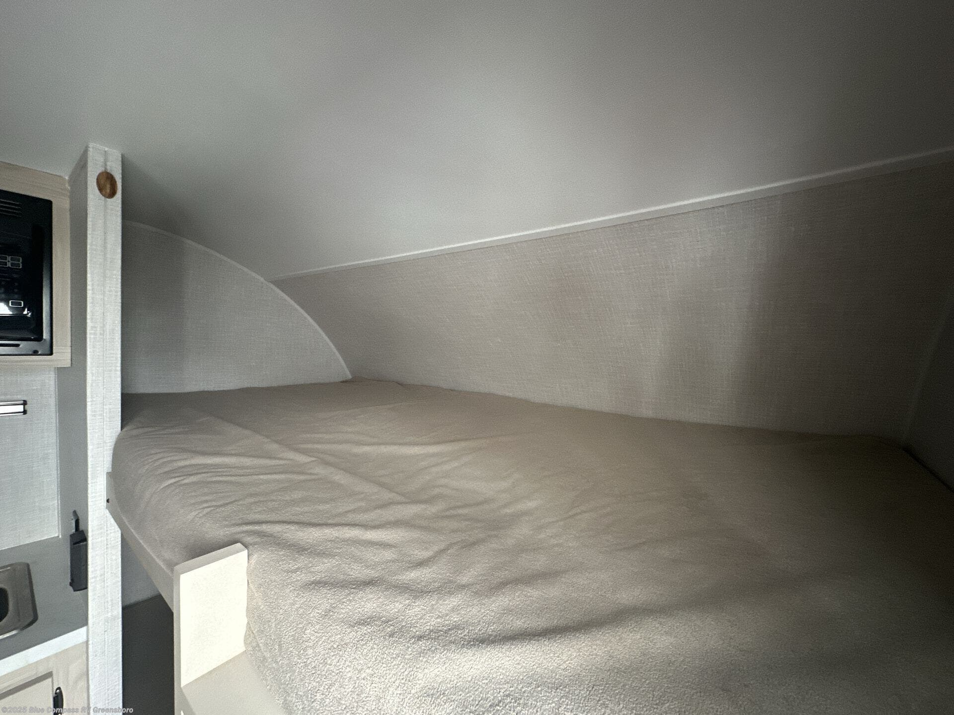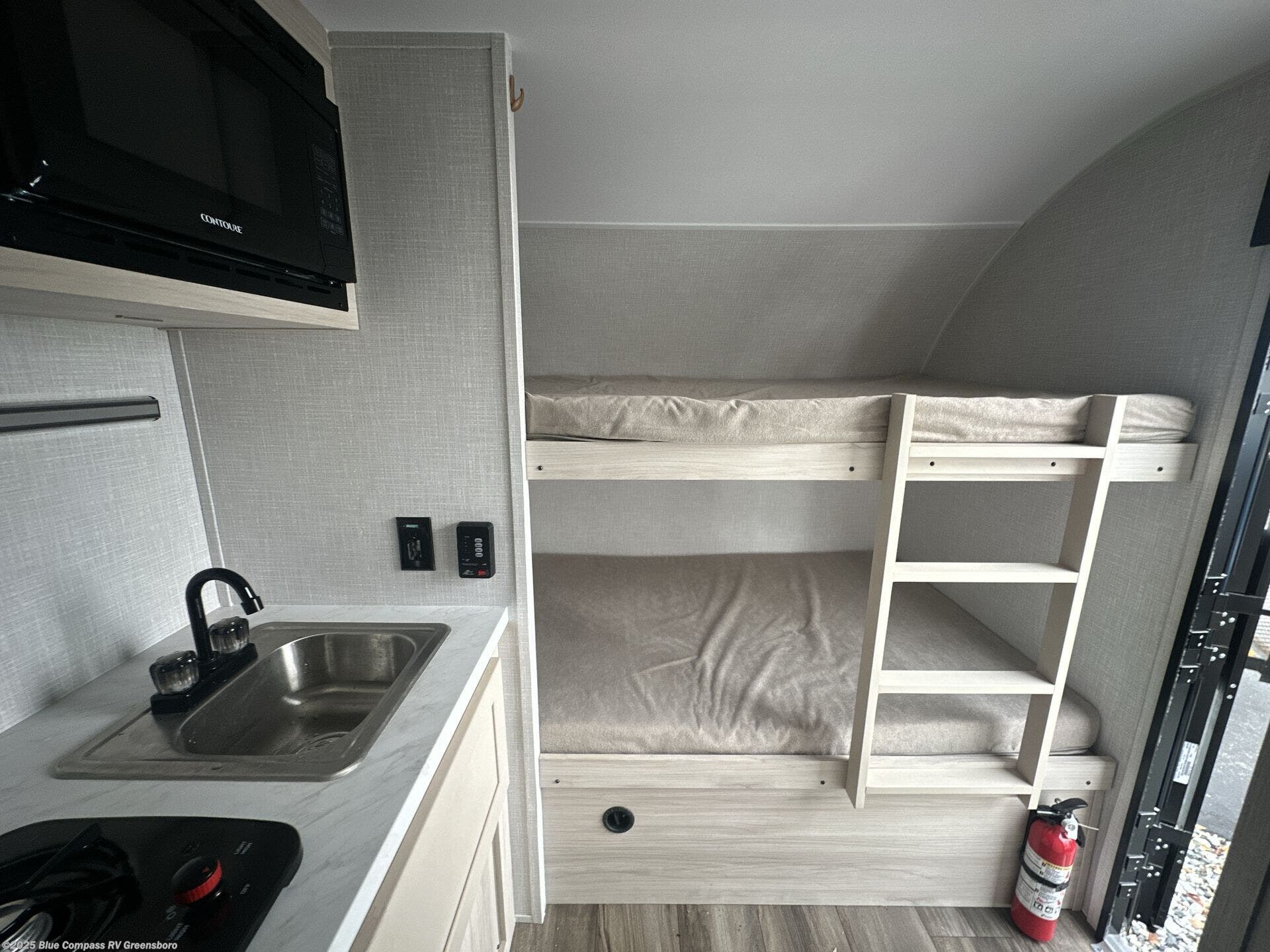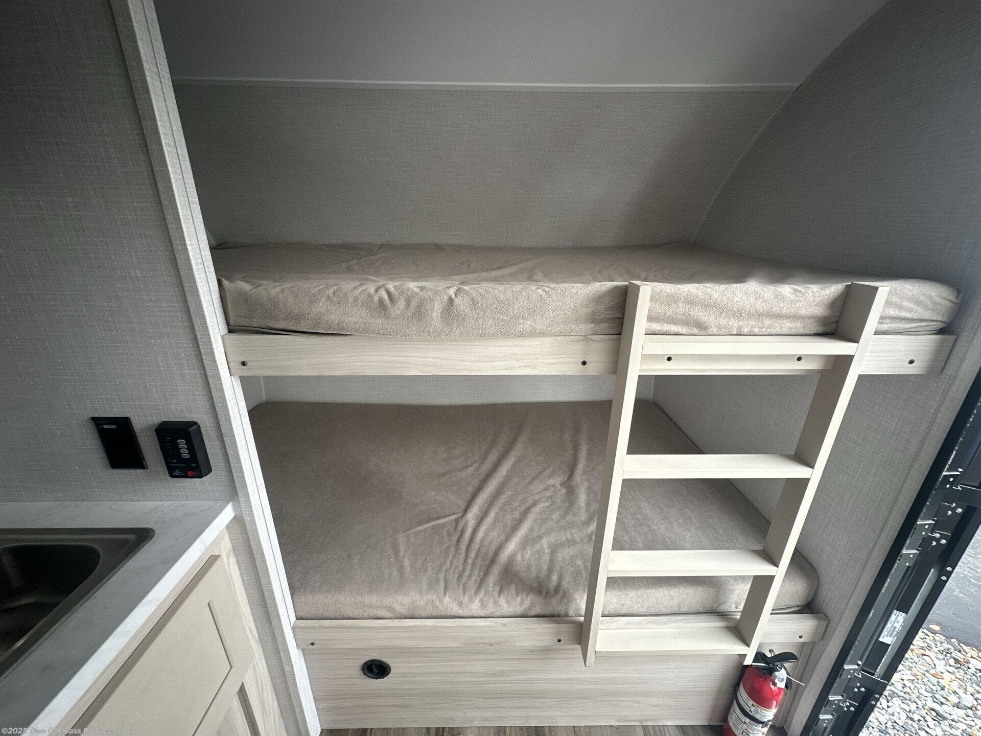 Now you can camp light and bring friends along with you in this teardrop trailer! Your guests or the little ones will love the front bunk beds, while you take the U-shaped dinette with an integrated folding sofa/bed. The chef of your group can prepare breakfast on the two burner cooktop, and there is even a sink here to clean up. This model also includes a 3.3 cu. ft. 12V refrigerator for your perishables and TV prep if you decide to bring along your own TV.