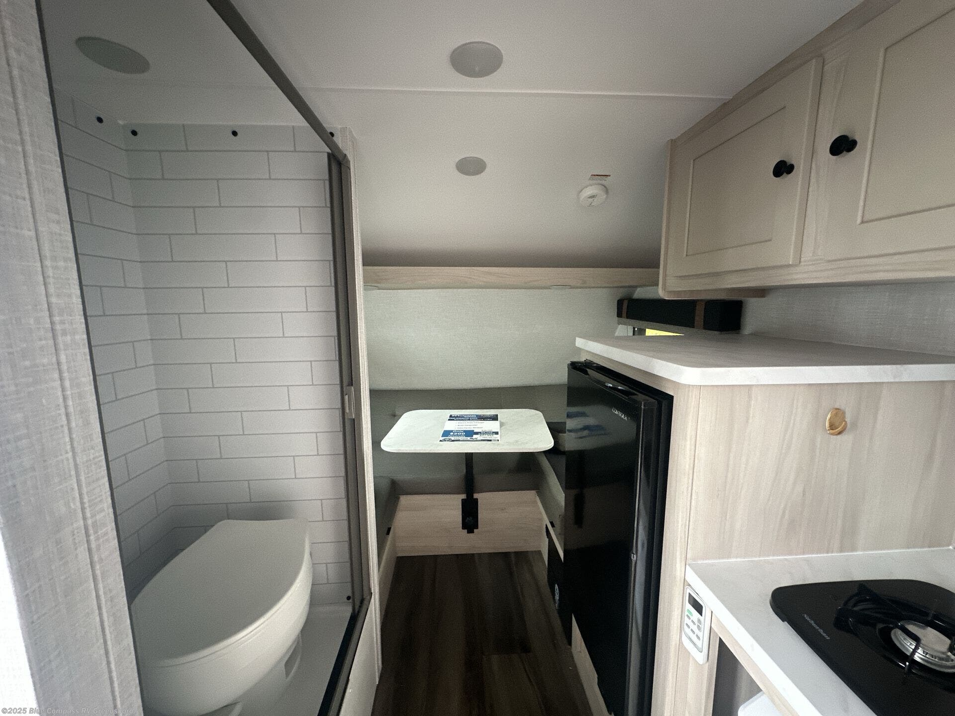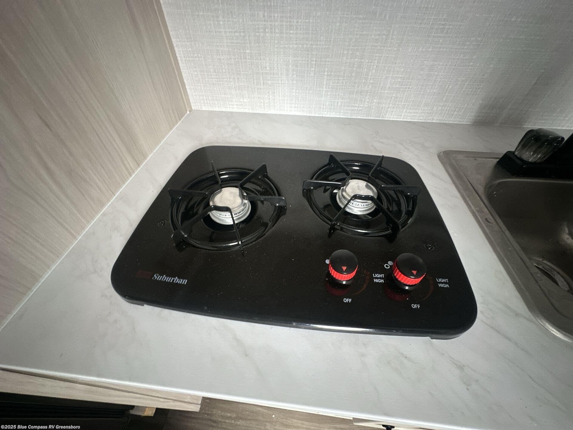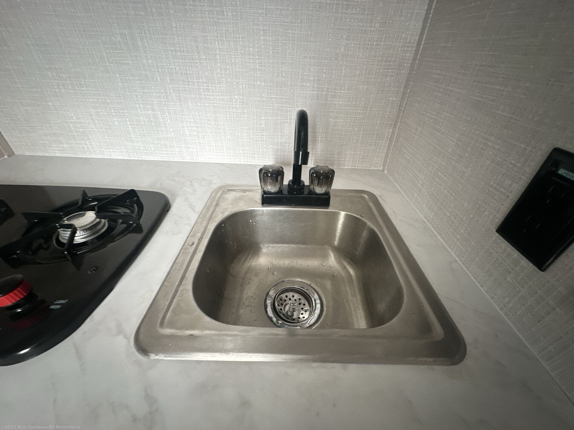 Now you can camp light and bring friends along with you in this teardrop trailer! Your guests or the little ones will love the front bunk beds, while you take the U-shaped dinette with an integrated folding sofa/bed. The chef of your group can prepare breakfast on the two burner cooktop, and there is even a sink here to clean up. This model also includes a 3.3 cu. ft. 12V refrigerator for your perishables and TV prep if you decide to bring along your own TV.