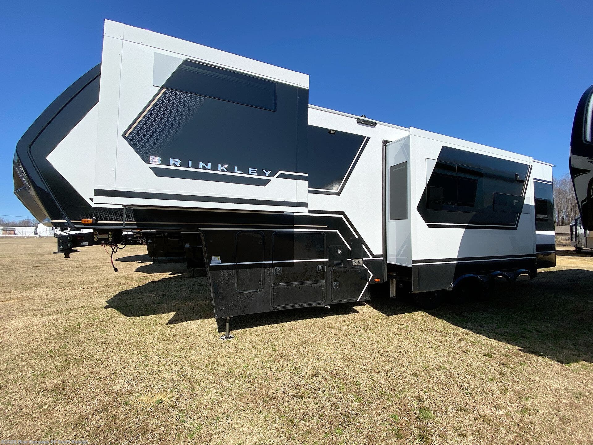 With any Model G toy hauler fifth wheel by Brinkley you will enjoy luxurious amenities, tons of storage space, and innovative features that have been developed and tested in the real world. Durable construction includes an industry leading PDI process, an industry best insulation package, and reinforced and walkable slide roofs. Some of the exterior features you'll find are a 3-way pass-through with a multi-functional flip-up bulkhead wall, under I-beam storage, a MAX-Vision reverse lighting system, and a low-maintenance roof to name a few. A Rockford Fosgate audio system comes standard, along with a OneControl app system that lets you control your fifth wheel's functions right from your mobile device. You will find the solar system with a designated storage area to be ultra convenient, plus there is a FlexPower 5500 with a dual fuel inverter generator for all your power needs. Head inside to find a residential interior with Brinkley's CraftSense wood trim construction, floating entrance steps, integrated window screens and insulated blackout blinds, and residential solid surface countertops plus backsplash. You will also enjoy the neon shower lighting and recessed medicine cabinets in the bath, plus motion activated LED bed lights and dual bedside outlets in the bedroom. Choose a Model G toy hauler fifth wheel to experience all the luxury it has to offer!