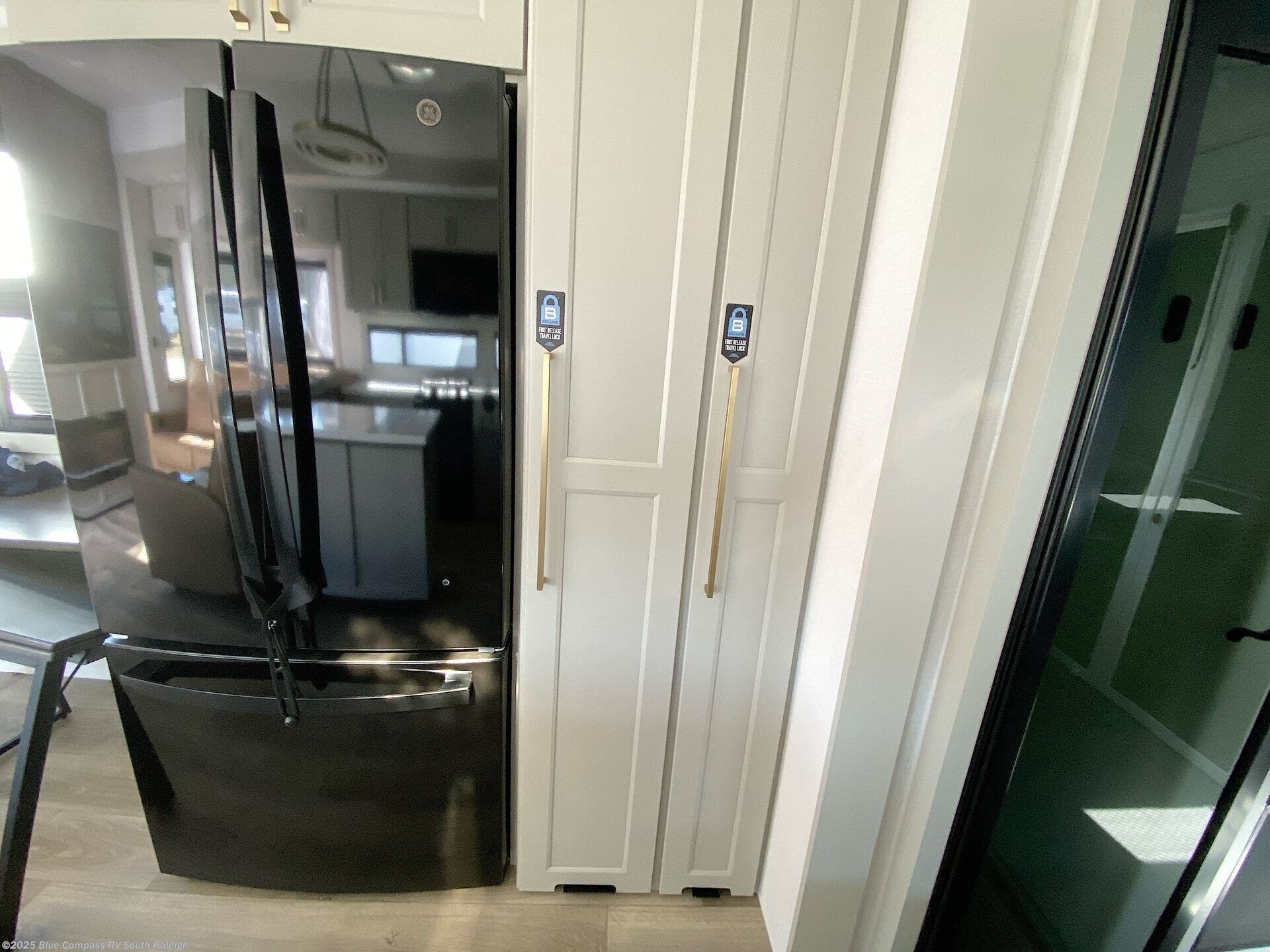 You can't imagine how much this toy hauler has to offer! The garage/outdoor kitchen/office space will allow you to utilize the garage how you need it, plus there is an adjustable tie-down system, as well as a loft for storage and a twin bed to sleep more campers! The garage patio with a 1,500 lb. capacity is another feature you are sure to love, especially with its own awning to keep you protected from the elements. Head to the kitchen to prepare meals with a 24" GE oven with a four burner range, a GE microwave with an air fryer, plus a spacious GE Energy Star 19 cu. ft. refrigerator. The island with two stools will let others visit with you while you cook, and there are even dog bowls to easily feed Frodo. You'll find the convertible dining table/L-desk will be accommodating since it can be use to dine at, and to get some work done. You may just find yourselves spending most of your time on the U-sofa in front of the entertainment center with a TV, fireplace and storage. A full bath is up front by the bedroom, and here you'll find a 30" x 43" shower and and pull-out linen storage with a trash bin to keep towels ready to use. After a day outdoors you'll love nothing more than coming back to your own bedroom with a king bed slide out, TV, a walk-in closet, and many more storage spaces. And we haven't even touched on the exterior features, like the 3-way pass-through storage, three power awnings, an air compressor to fill up tires, and the list goes on and on! This is a pre-production preview, all features and layout placement subject to change.