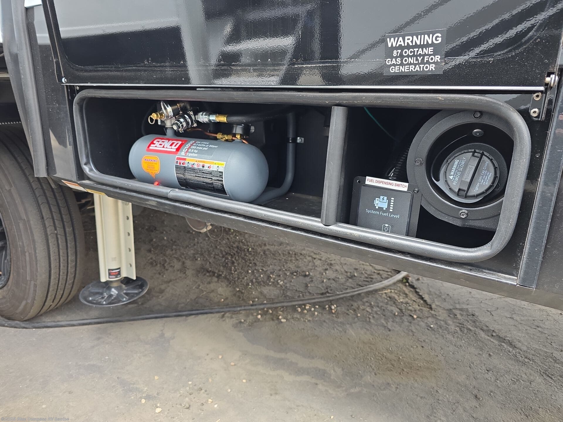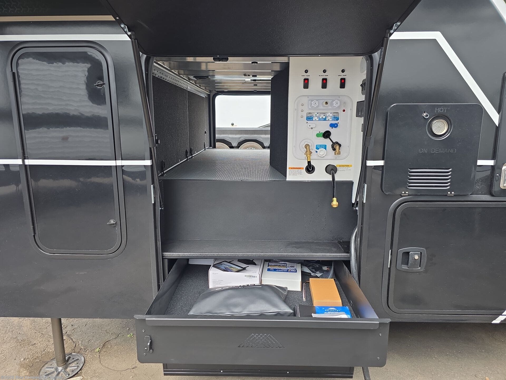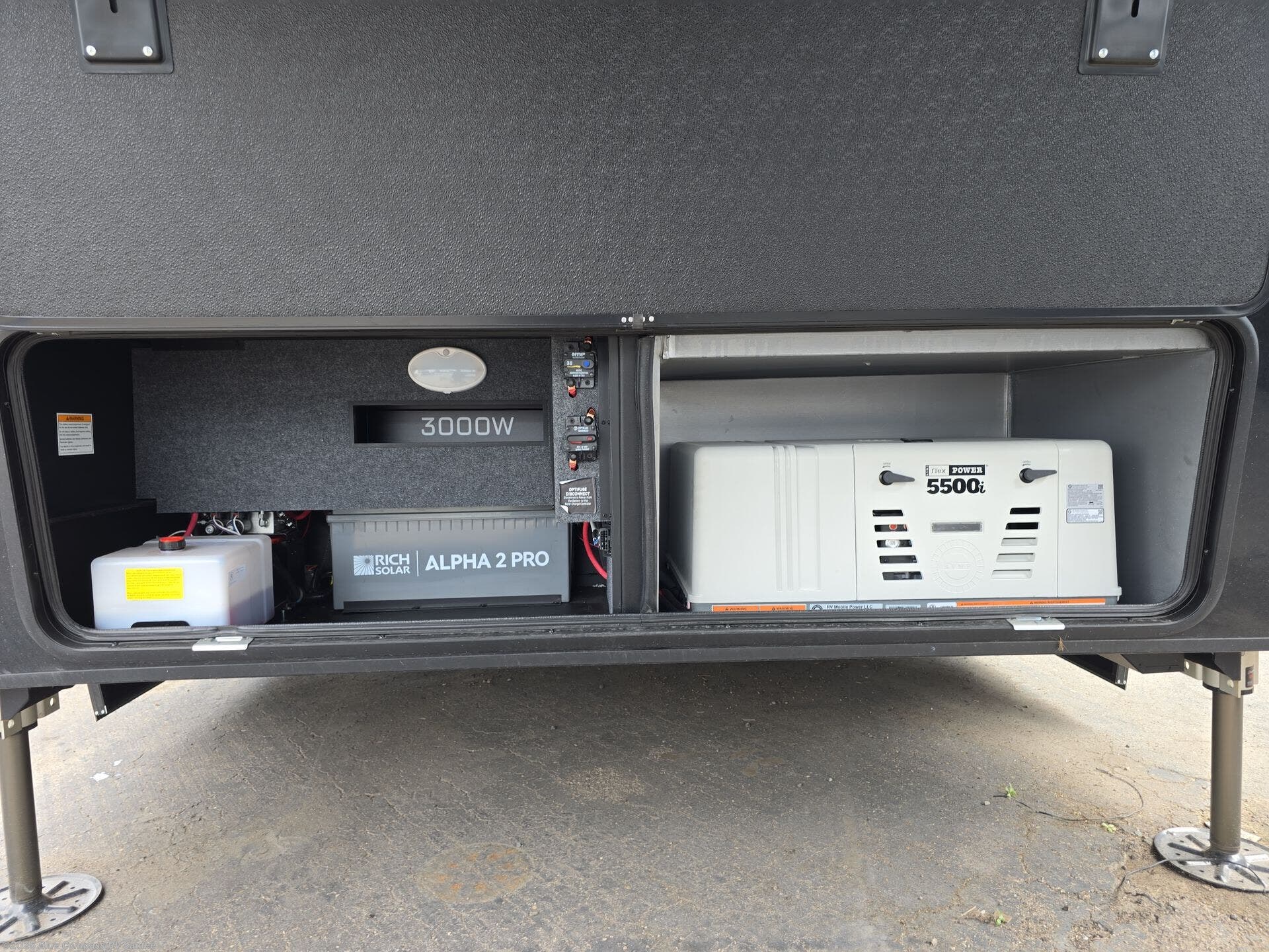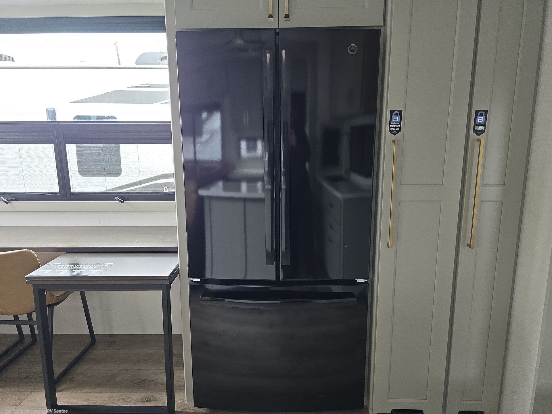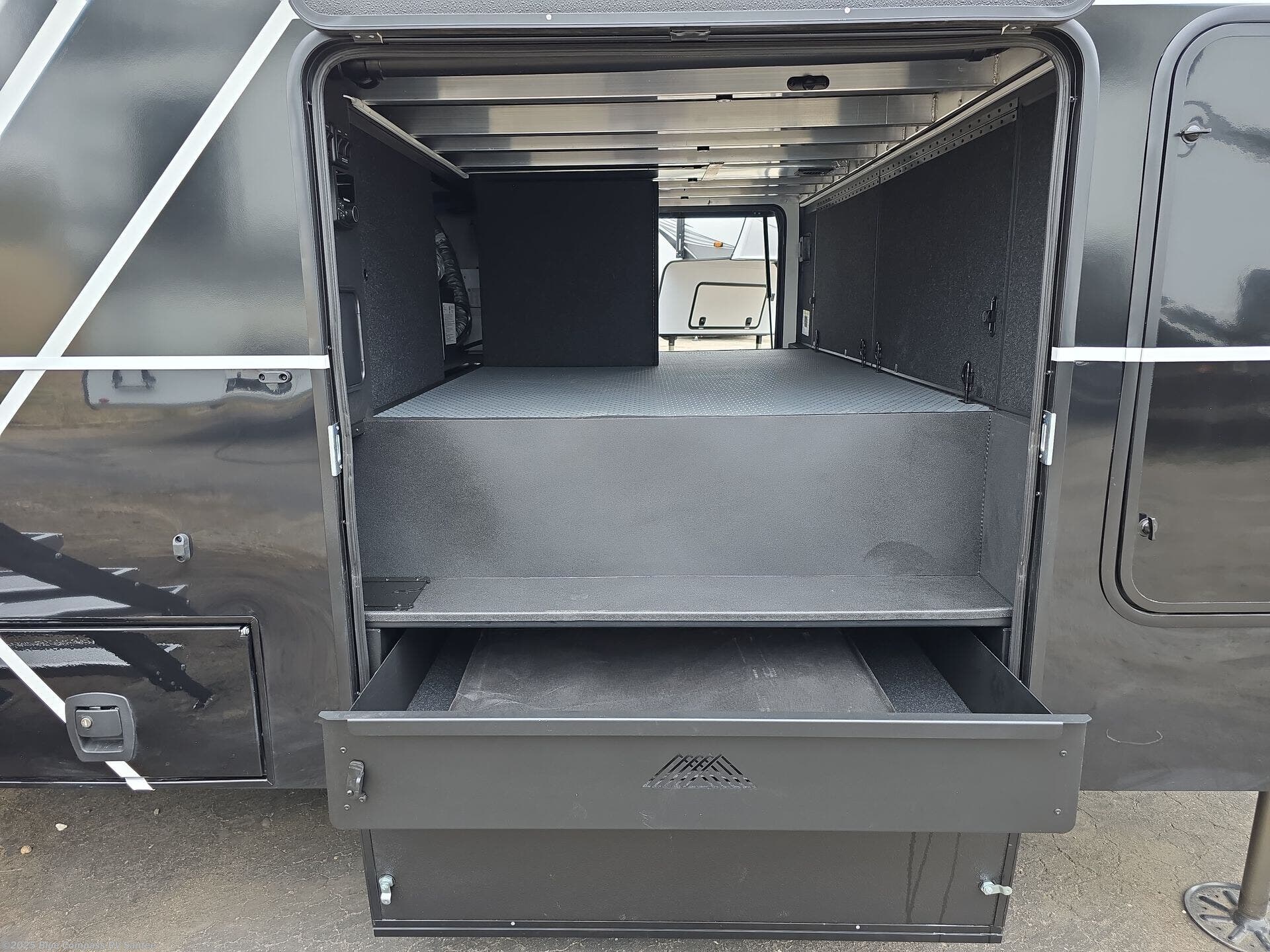 You can't imagine how much this toy hauler has to offer! The garage/outdoor kitchen/office space will allow you to utilize the garage how you need it, plus there is an adjustable tie-down system, as well as a loft for storage and a twin bed to sleep more campers! The garage patio with a 1,500 lb. capacity is another feature you are sure to love, especially with its own awning to keep you protected from the elements. Head to the kitchen to prepare meals with a 24" GE oven with a four burner range, a GE microwave with an air fryer, plus a spacious GE Energy Star 19 cu. ft. refrigerator. The island with two stools will let others visit with you while you cook, and there are even dog bowls to easily feed Frodo. You'll find the convertible dining table/L-desk will be accommodating since it can be use to dine at, and to get some work done. You may just find yourselves spending most of your time on the L-sofa in front of the entertainment center with a TV, fireplace and storage. A full bath is up front by the bedroom, and here you'll find a 30" x 42" shower and and pull-out linen storage with a trash bin to keep towels ready to use. After a day outdoors you'll love nothing more than coming back to your own bedroom with a king bed slide out, TV, a walk-in closet, and many more storage spaces. And we haven't even touched on the exterior features, like the 3-way pass-through storage, three power awnings, an air compressor to fill up tires, and the list goes on and on! This is a pre-production preview, all features and layout placement subject to change.