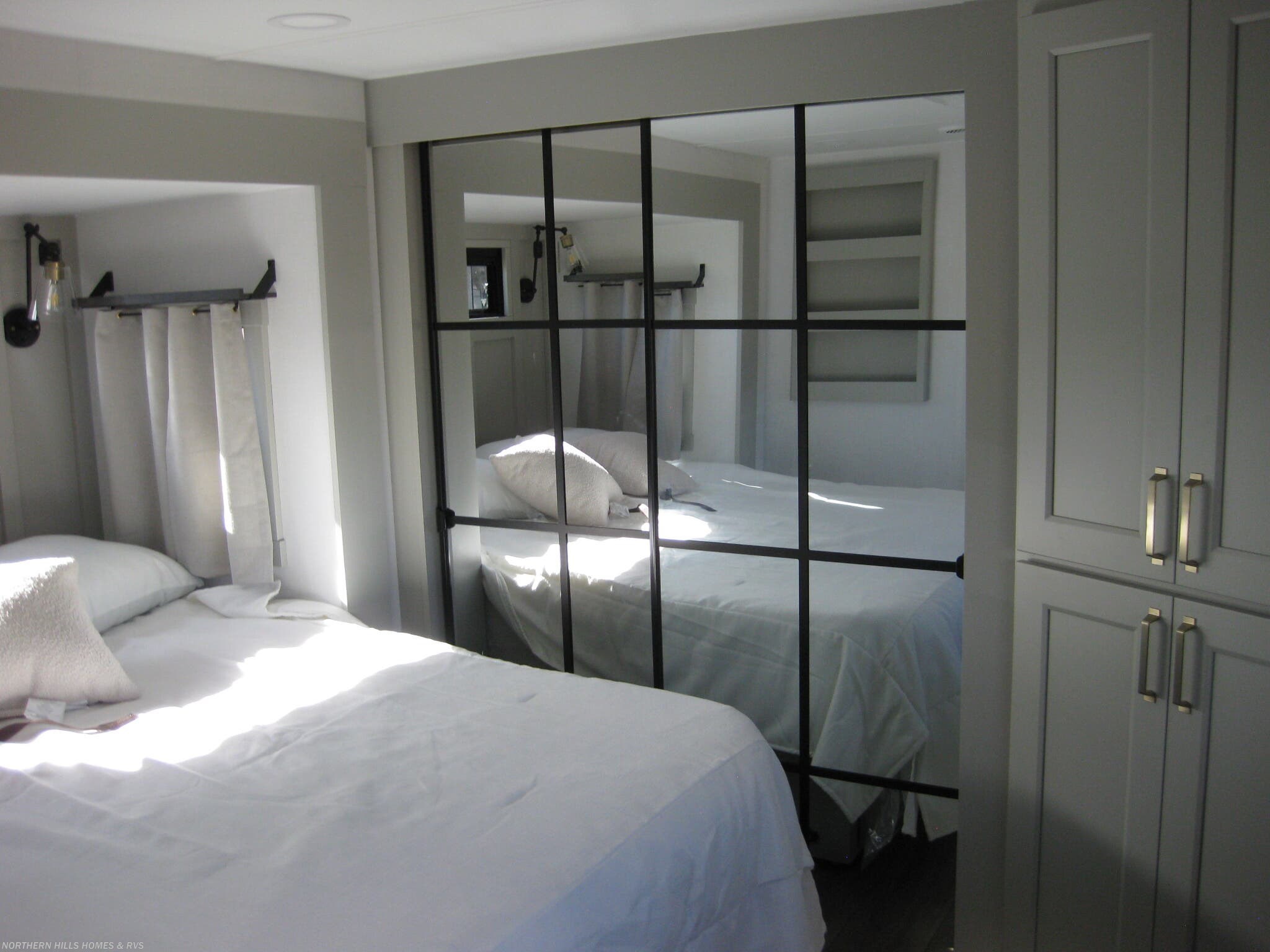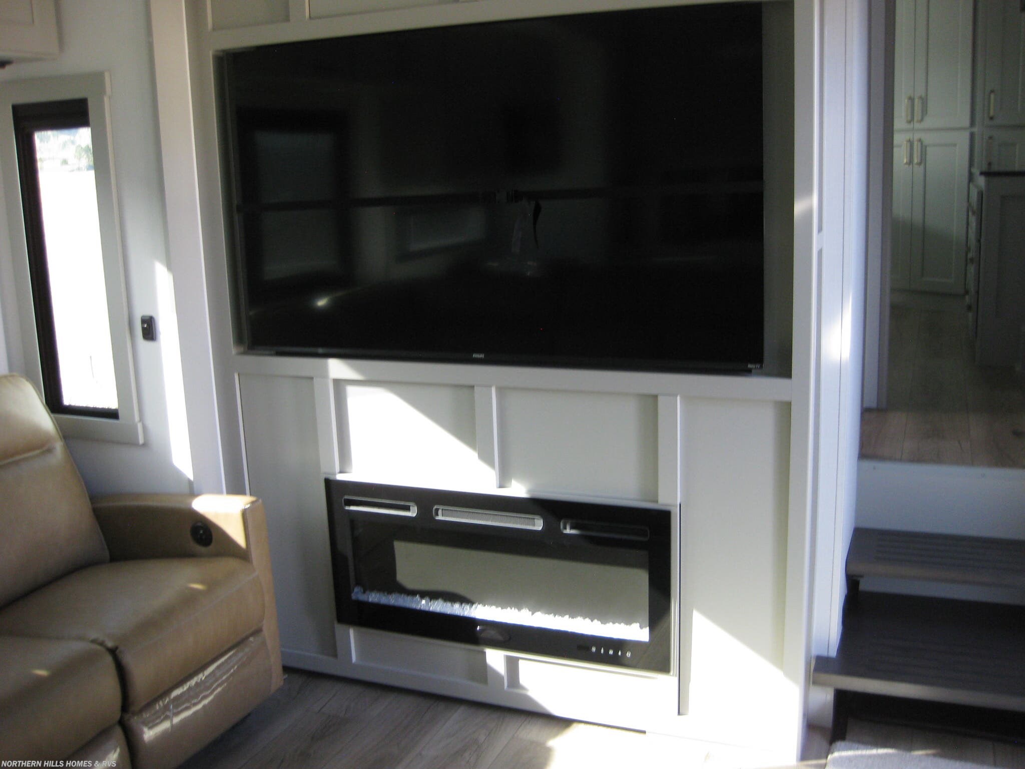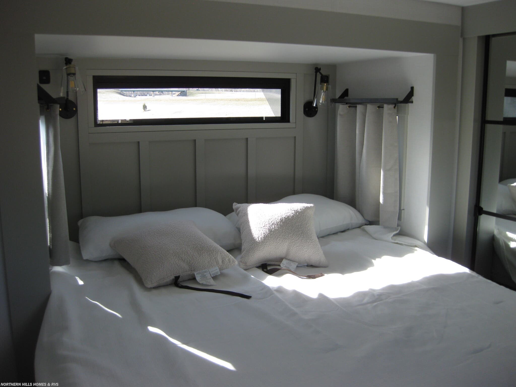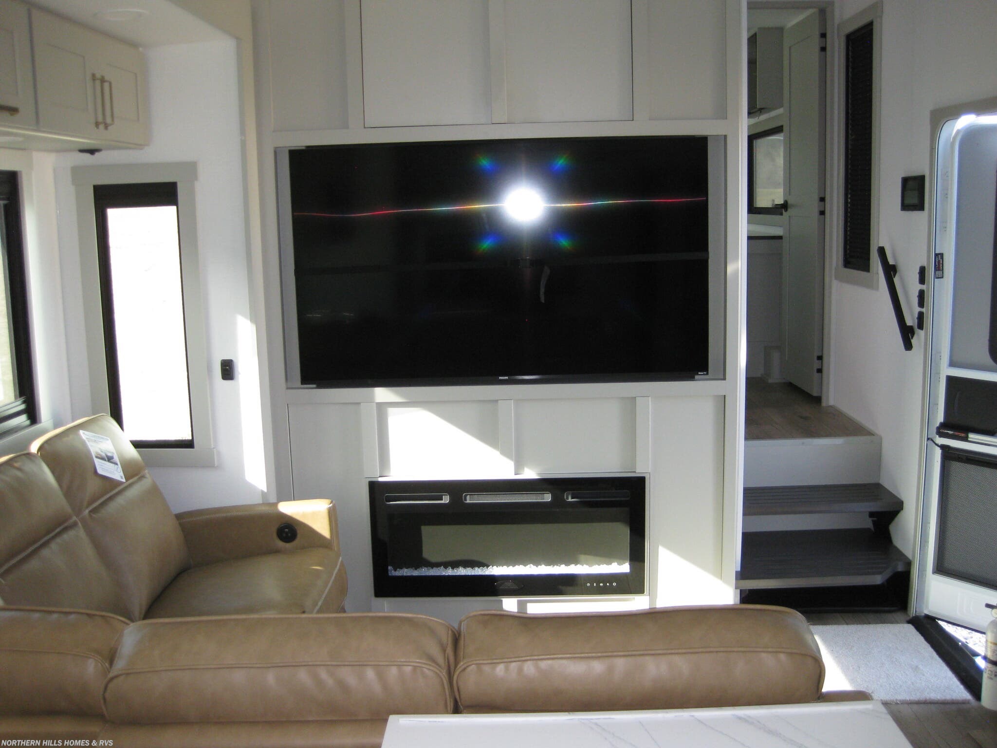 The interior of the Model G is packed with amenities to enhance your stay, including a cozy fireplace, a king-size bed, bunk beds, and a free-standing dinette with chairs—ideal for meals or game nights. The RV comfortably sleeps up to five people, making it a perfect choice for families or groups. The kitchenette includes a microwave, oven, refrigerator, stove top burner, and water heater, enabling you to prepare a variety of meals with ease. Additionally, the RV features ample storage options such as a medicine cabinet and washer/dryer prep, ensuring your belongings stay organized throughout your trip.