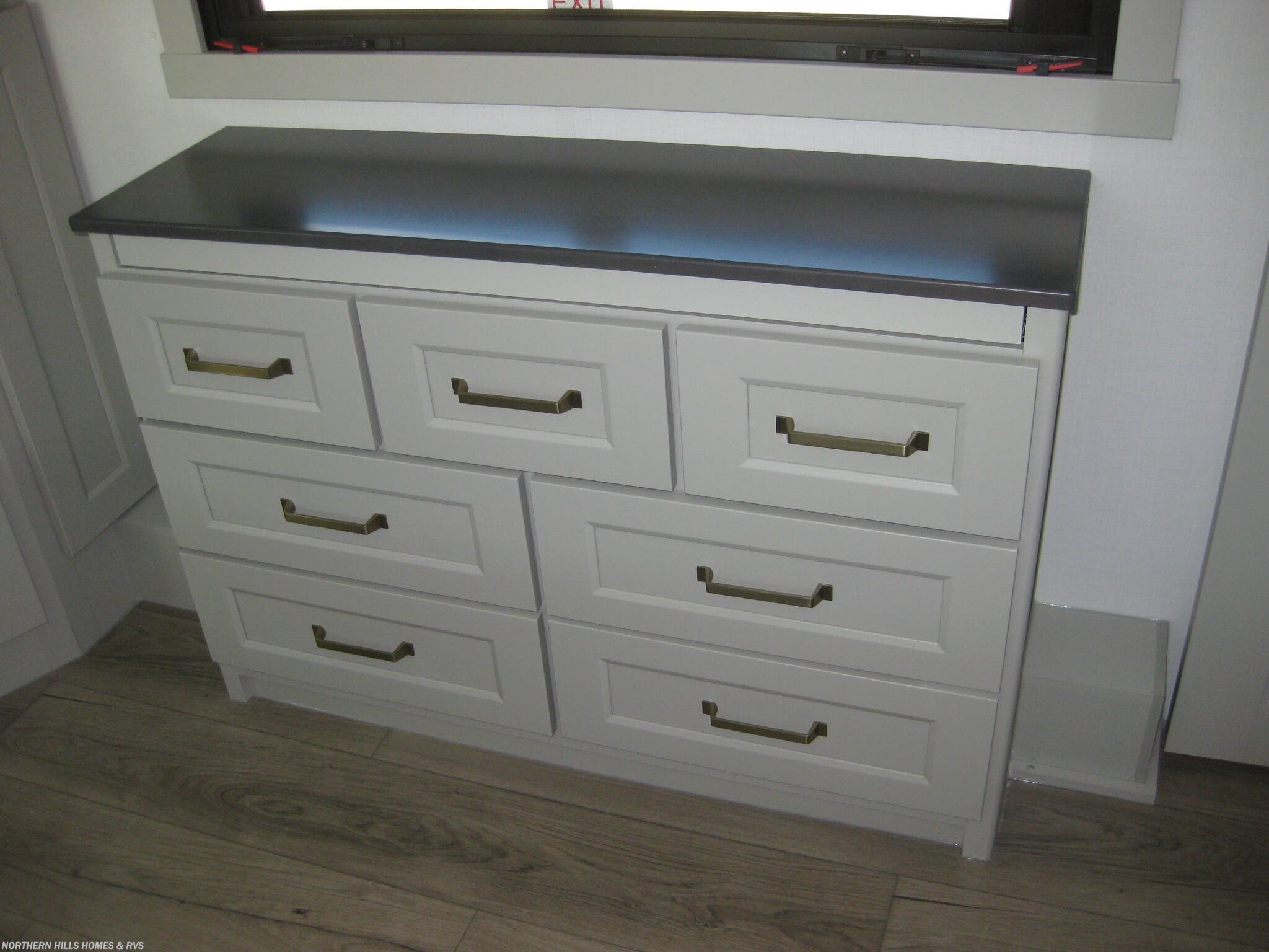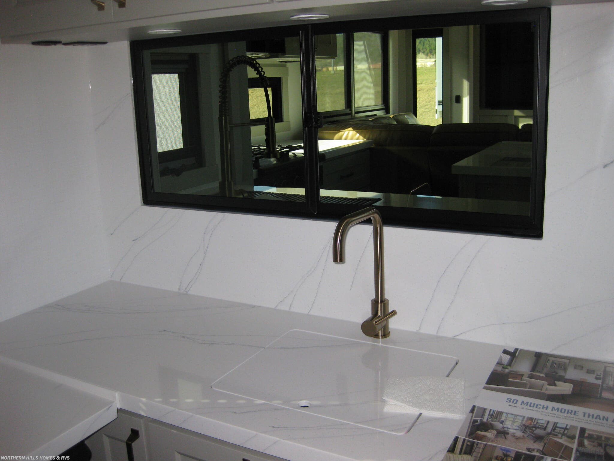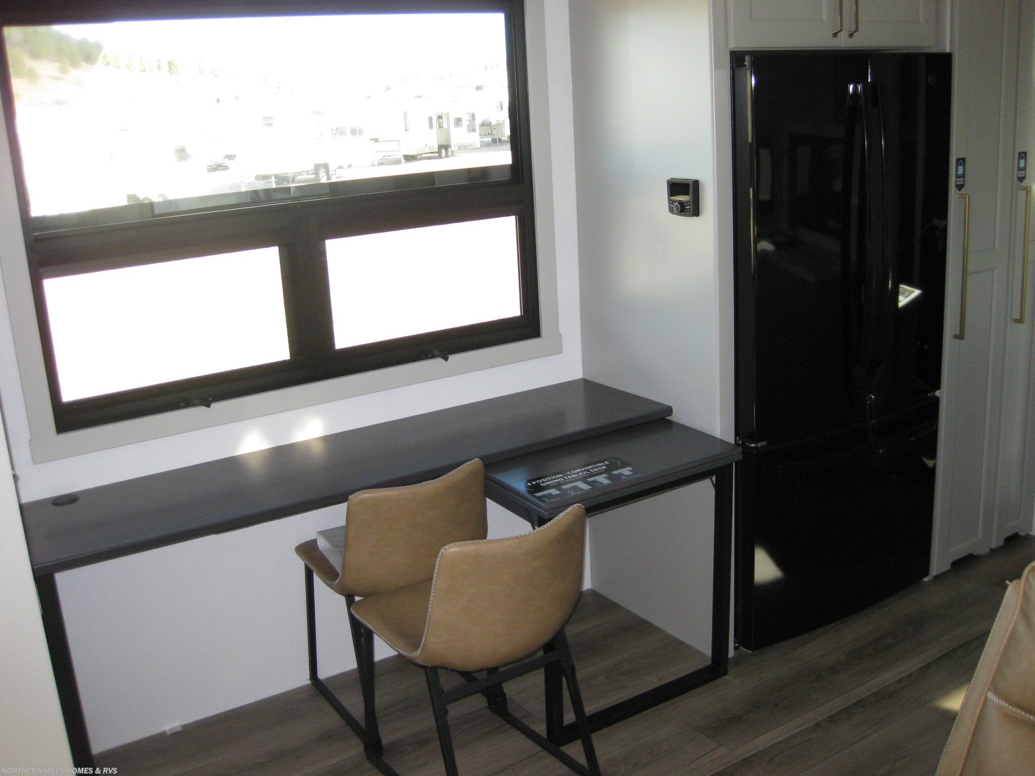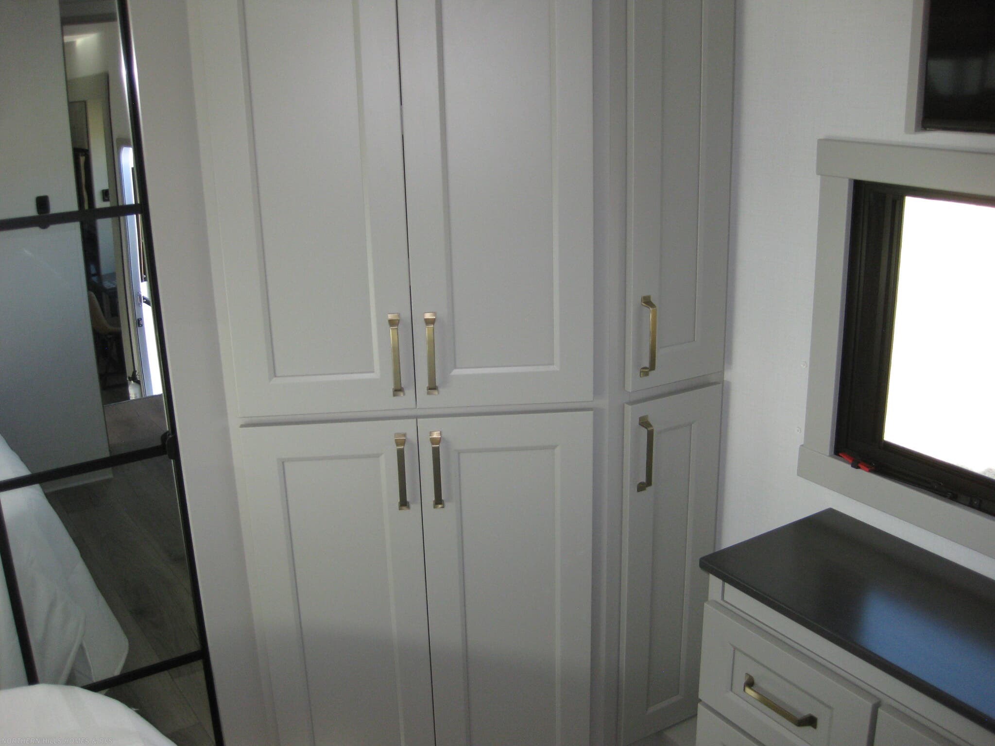 The interior of the Model G is packed with amenities to enhance your stay, including a cozy fireplace, a king-size bed, bunk beds, and a free-standing dinette with chairs—ideal for meals or game nights. The RV comfortably sleeps up to five people, making it a perfect choice for families or groups. The kitchenette includes a microwave, oven, refrigerator, stove top burner, and water heater, enabling you to prepare a variety of meals with ease. Additionally, the RV features ample storage options such as a medicine cabinet and washer/dryer prep, ensuring your belongings stay organized throughout your trip.