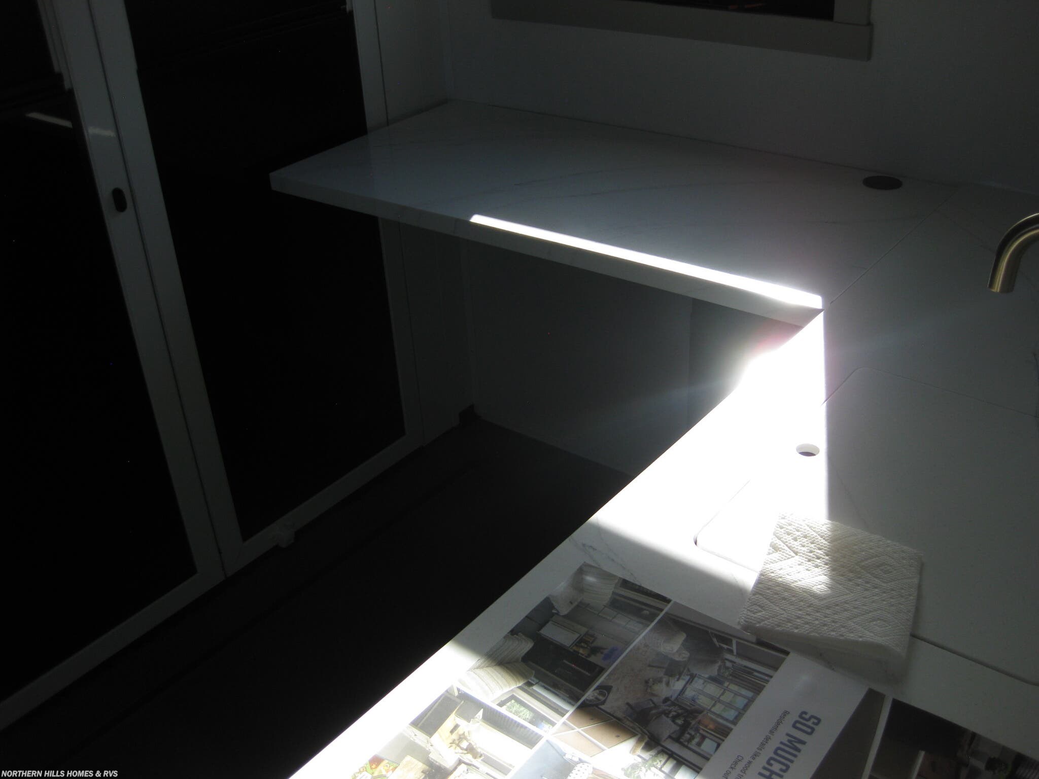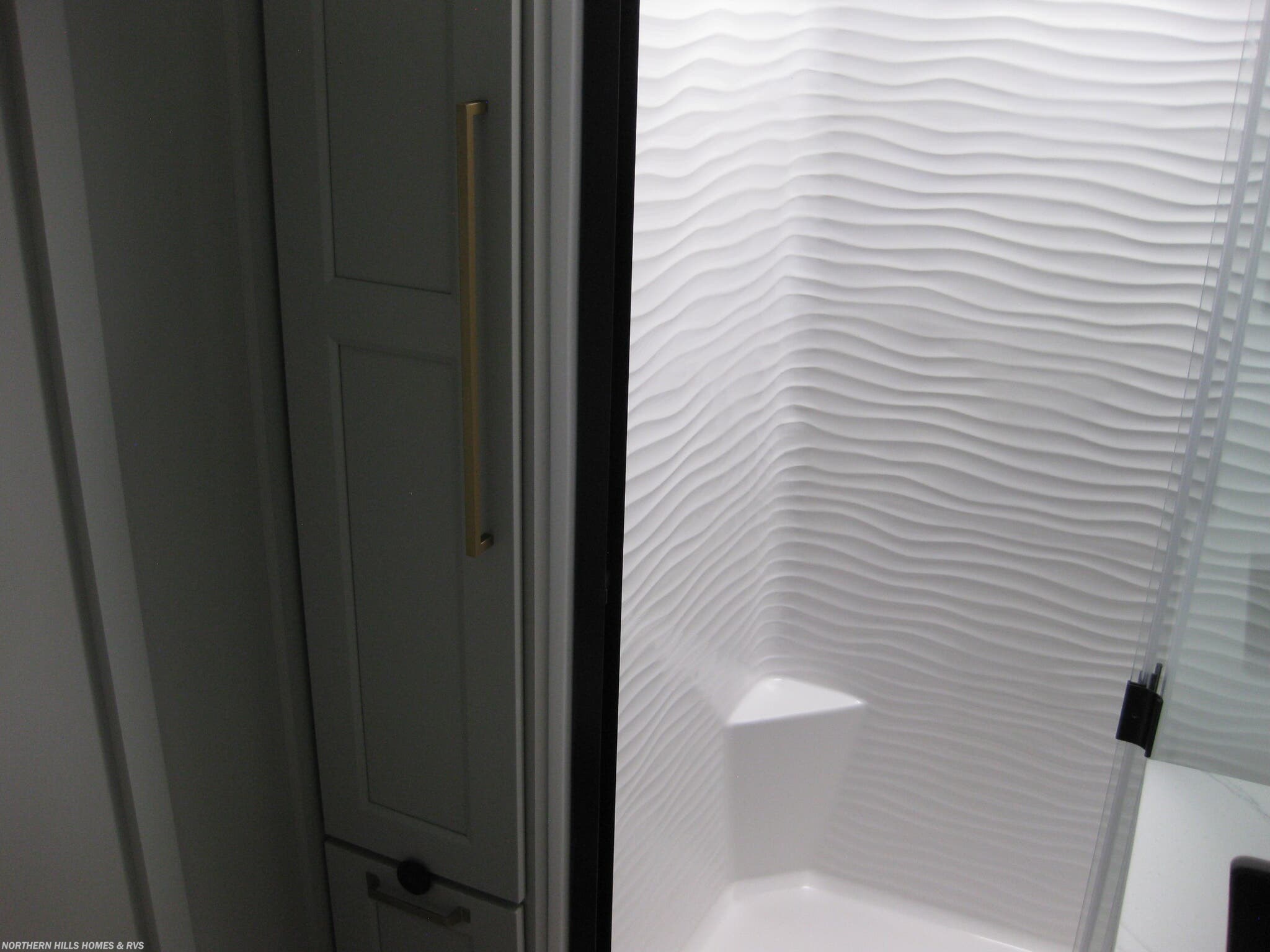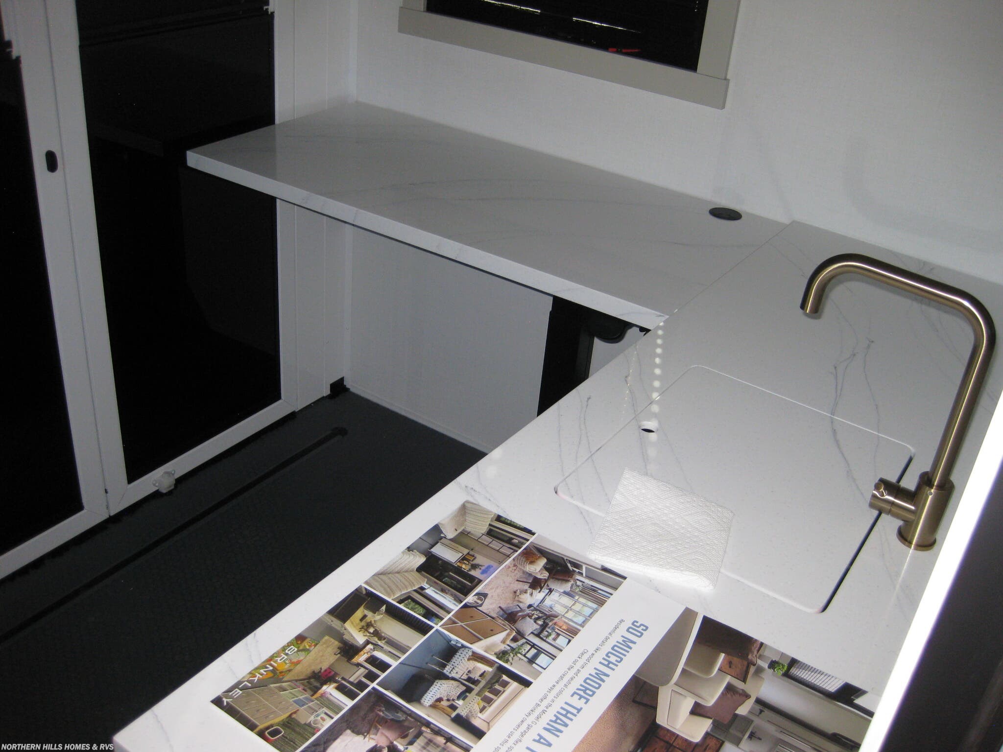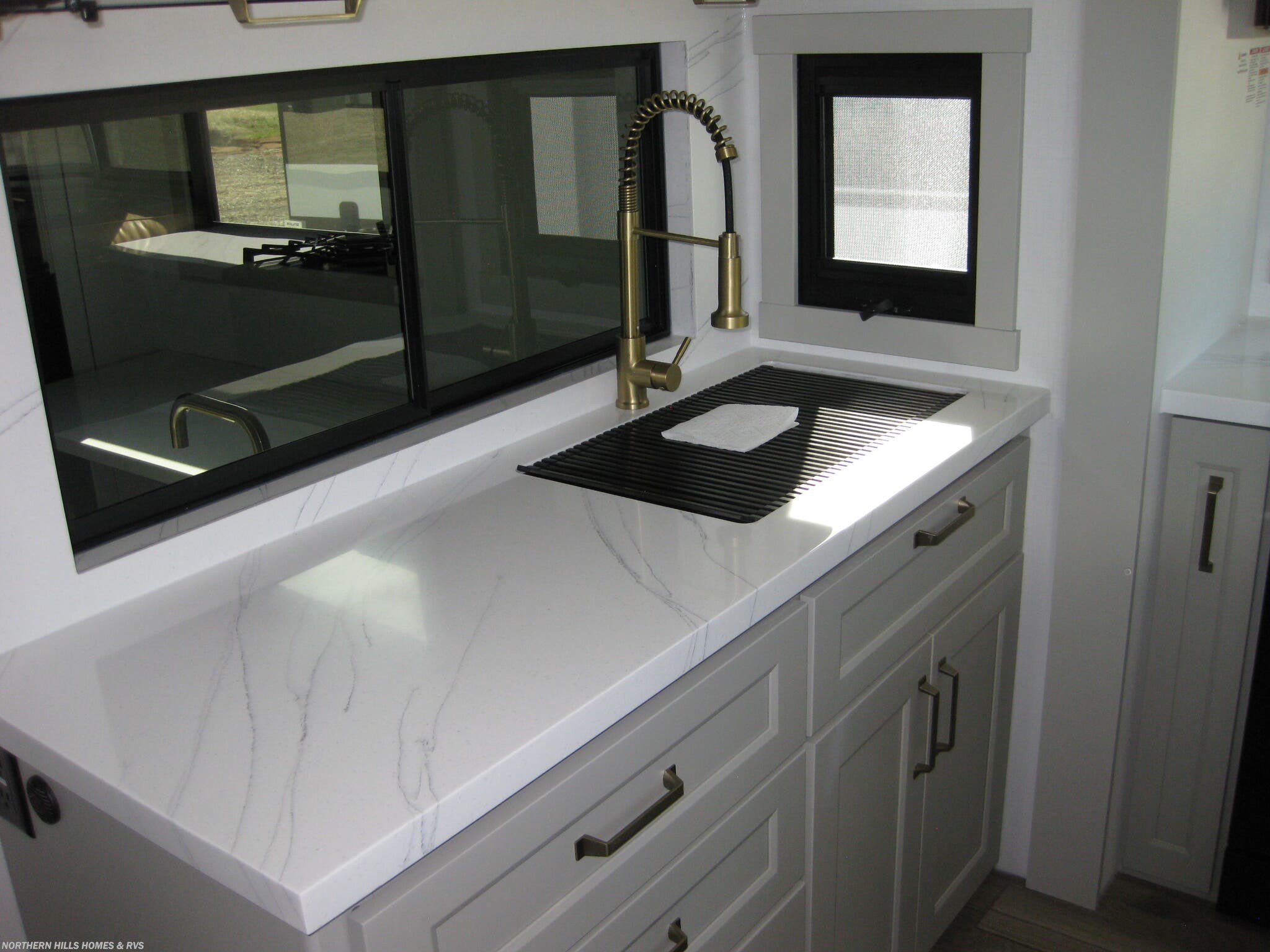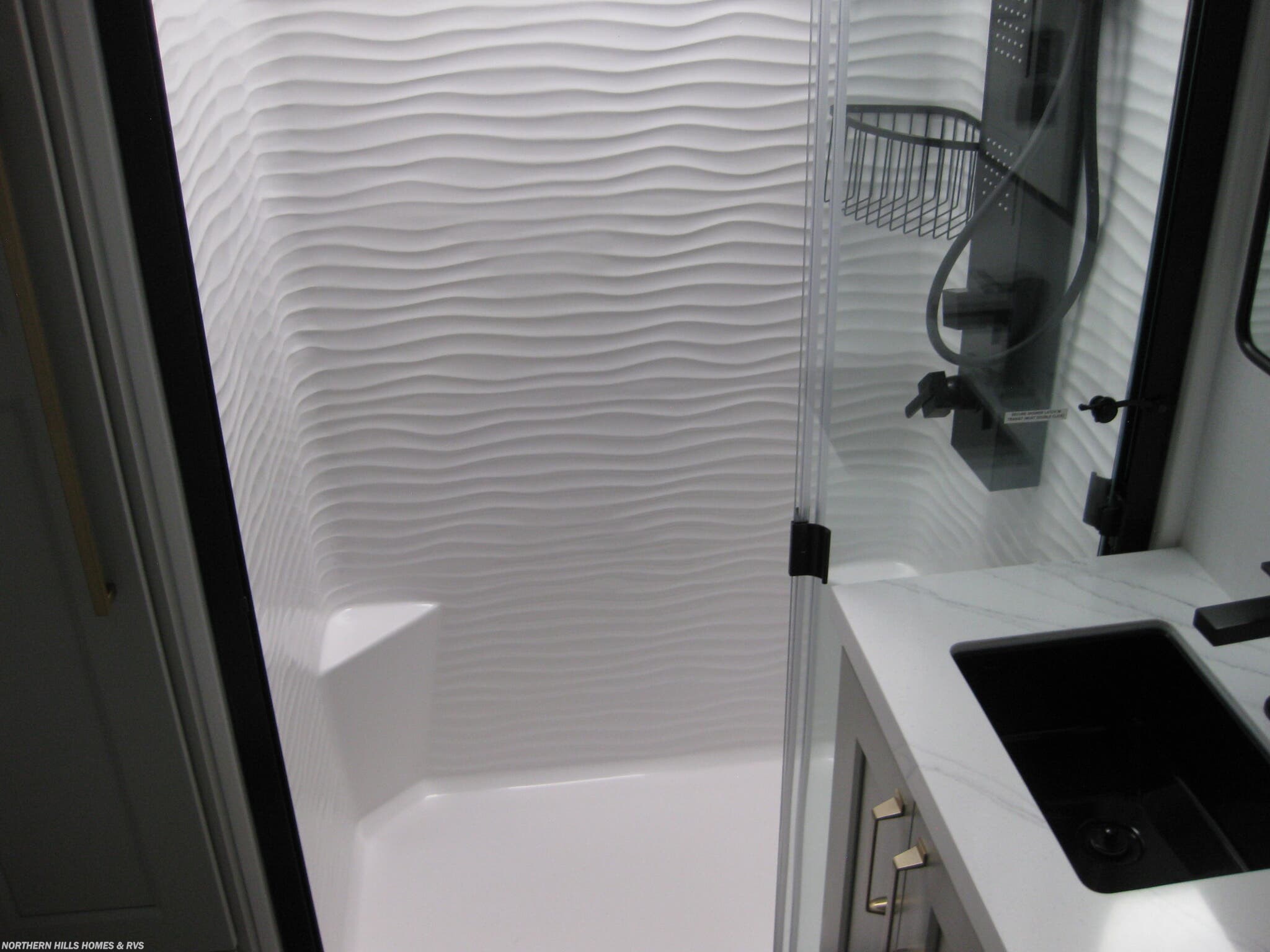Designed with practicality and safety in mind, the Model G includes features like a backup monitor, exterior speakers, external shower, awning, ladder, leveling jacks, and a power roof vent with skylight for optimal airflow. Safety is prioritized with detectors for CO, LP, and smoke. The exterior design includes a patio deck, RV awning for shade, and a roof vent, all contributing to a more enjoyable outdoor experience for you and your guests.