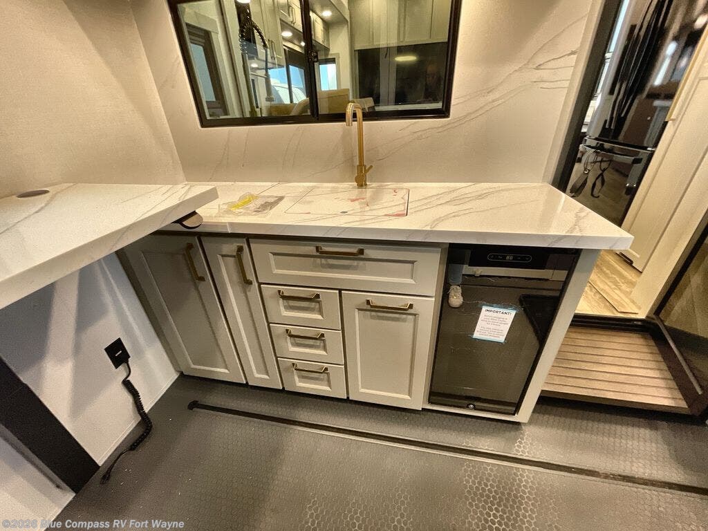 You can't imagine how much this toy hauler has to offer! The garage/outdoor kitchen/office space will allow you to utilize the garage how you need it, plus there is an adjustable tie-down system, as well as a loft for storage and a twin bed to sleep more campers! The garage patio with a 1,500 lb. capacity is another feature you are sure to love, especially with its own awning to keep you protected from the elements. Head to the kitchen to prepare meals with a 24" GE oven with a four burner range, a GE microwave with an air fryer, plus a spacious GE Energy Star 19 cu. ft. refrigerator. The island with two stools will let others visit with you while you cook, and there are even dog bowls to easily feed Frodo. You'll find the convertible dining table/L-desk will be accommodating since it can be use to dine at, and to get some work done. You may just find yourselves spending most of your time on the L-sofa in front of the entertainment center with a TV, fireplace and storage. A full bath is up front by the bedroom, and here you'll find a 30" x 42" shower and and pull-out linen storage with a trash bin to keep towels ready to use. After a day outdoors you'll love nothing more than coming back to your own bedroom with a king bed slide out, TV, a walk-in closet, and many more storage spaces. And we haven't even touched on the exterior features, like the 3-way pass-through storage, three power awnings, an air compressor to fill up tires, and the list goes on and on! This is a pre-production preview, all features and layout placement subject to change.