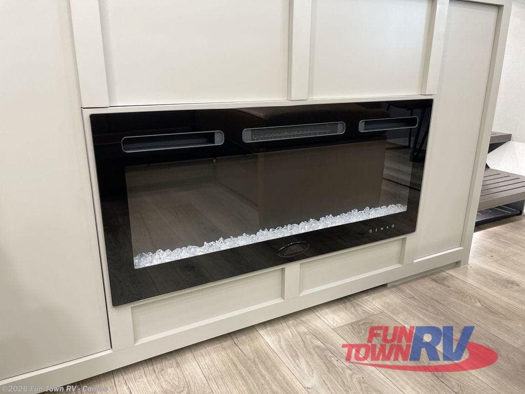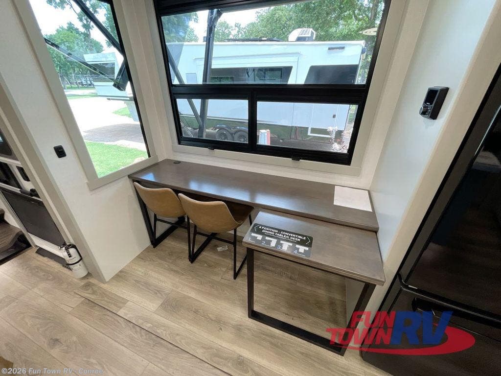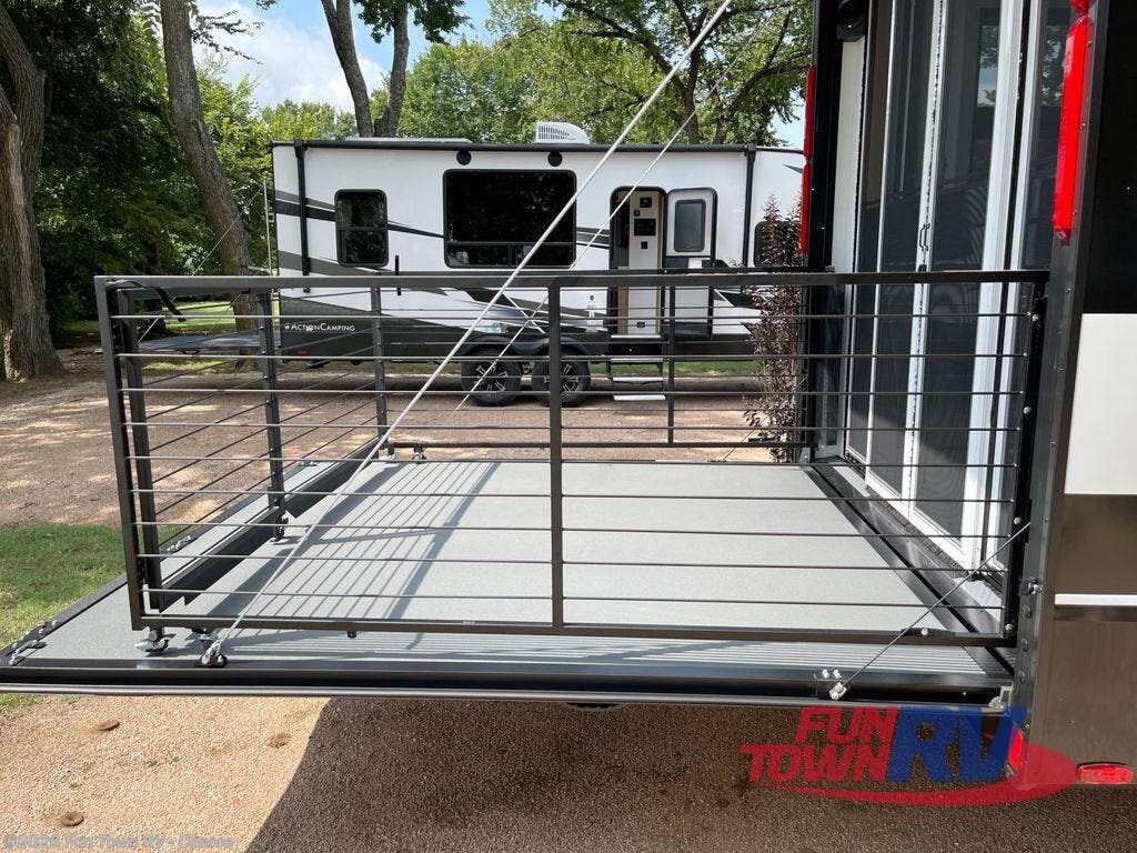 This toy hauler may just be the one you've been looking for! The garage/flex space with fold-away half bath walls will allow you to utilize the garage how you need it, plus there is an adjustable tie-down system, independent dual sofas, plus a loft for storage and a twin bed to sleep more campers! The garage patio with a 1,500 lb. capacity is another feature you are sure to love, especially with its own awning to keep you protected from the elements. Head to the kitchen to prepare meals with a 24" GE oven with a four burner range, a GE microwave with an air fryer, plus a spacious GE Energy Star 19 cu. ft. refrigerator. The island with two stools will let others visit with you while you cook, and there are even hidden dog bowls. You'll find the convertible dining table/L-desk will be accommodating since it can be use to dine at, and to get some work done. You may just find yourselves spending most of your time on the U-sofa in front of the TV and fireplace. A full bath is up front by the bedroom, and here you'll find neon shower lighting, a residential shower system, and pull-out linen storage to keep towels ready to use. After a day outdoors you'll love nothing more than coming back to your own bedroom with a king bed slide out, TV, a walk-in closet, and many more storage spaces. And we haven't even touched on the exterior features, like the 3-way pass-through storage, three power awnings, an air compressor to fill up tires, and the list goes on and on! This is a pre-production preview, all features and layout placement subject to change.
