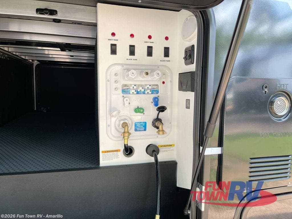 This toy hauler may just be the one you've been looking for! The garage/flex space with fold-away half bath walls will allow you to utilize the garage how you need it, plus there is an adjustable tie-down system, independent dual sofas, plus a loft for storage and a twin bed to sleep more campers! The garage patio with a 1,500 lb. capacity is another feature you are sure to love, especially with its own awning to keep you protected from the elements. Head to the kitchen to prepare meals with a 24" GE oven with a four burner range, a GE microwave with an air fryer, plus a spacious GE Energy Star 19 cu. ft. refrigerator. The island with two stools will let others visit with you while you cook, and there are even hidden dog bowls. You'll find the convertible dining table/L-desk will be accommodating since it can be use to dine at, and to get some work done. You may just find yourselves spending most of your time on the U-sofa in front of the TV and fireplace. A full bath is up front by the bedroom, and here you'll find neon shower lighting, a residential shower system, and pull-out linen storage to keep towels ready to use. After a day outdoors you'll love nothing more than coming back to your own bedroom with a king bed slide out, TV, a walk-in closet, and many more storage spaces. And we haven't even touched on the exterior features, like the 3-way pass-through storage, three power awnings, an air compressor to fill up tires, and the list goes on and on! This is a pre-production preview, all features and layout placement subject to change.