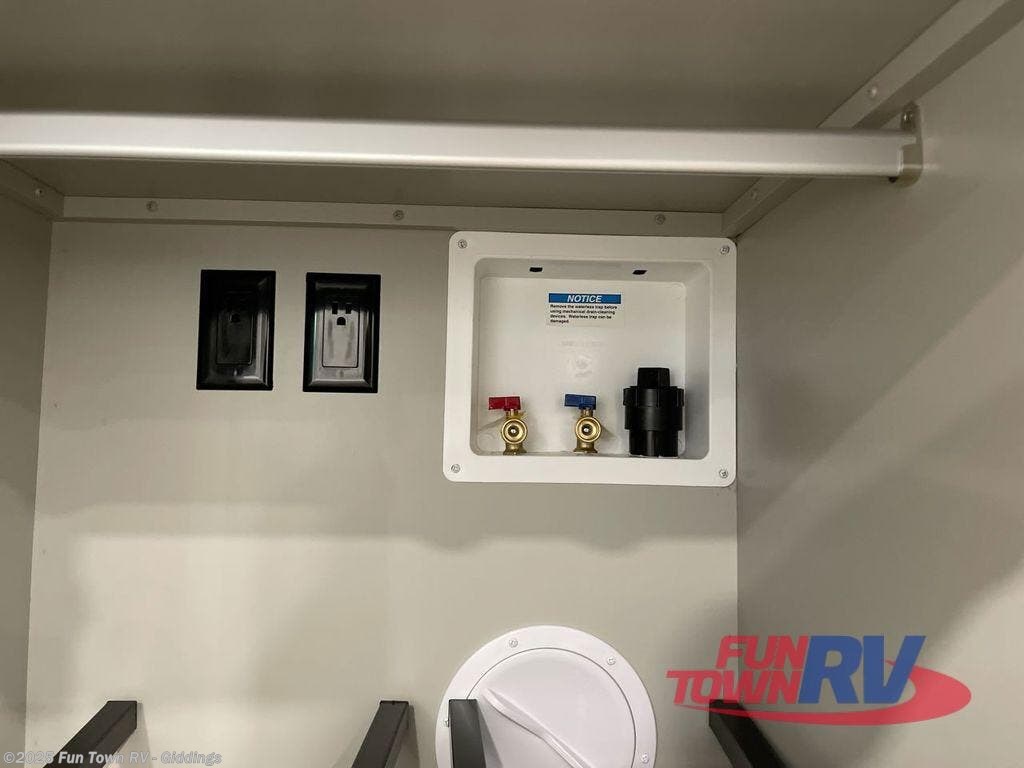 This toy hauler may just be the one you've been looking for! The garage/flex space with fold-away half bath walls will allow you to utilize the garage how you need it, plus there is an adjustable tie-down system, independent dual sofas, plus a loft for storage and a twin bed to sleep more campers! The garage patio with a 1,500 lb. capacity is another feature you are sure to love, especially with its own awning to keep you protected from the elements. Head to the kitchen to prepare meals with a 24" GE oven with a four burner range, a GE microwave with an air fryer, plus a spacious GE Energy Star 19 cu. ft. refrigerator. The island with two stools will let others visit with you while you cook, and there are even hidden dog bowls. You'll find the convertible dining table/L-desk will be accommodating since it can be use to dine at, and to get some work done. You may just find yourselves spending most of your time on the U-sofa in front of the TV and fireplace. A full bath is up front by the bedroom, and here you'll find neon shower lighting, a residential shower system, and pull-out linen storage to keep towels ready to use. After a day outdoors you'll love nothing more than coming back to your own bedroom with a king bed slide out, TV, a walk-in closet, and many more storage spaces. And we haven't even touched on the exterior features, like the 3-way pass-through storage, three power awnings, an air compressor to fill up tires, and the list goes on and on! This is a pre-production preview, all features and layout placement subject to change.
