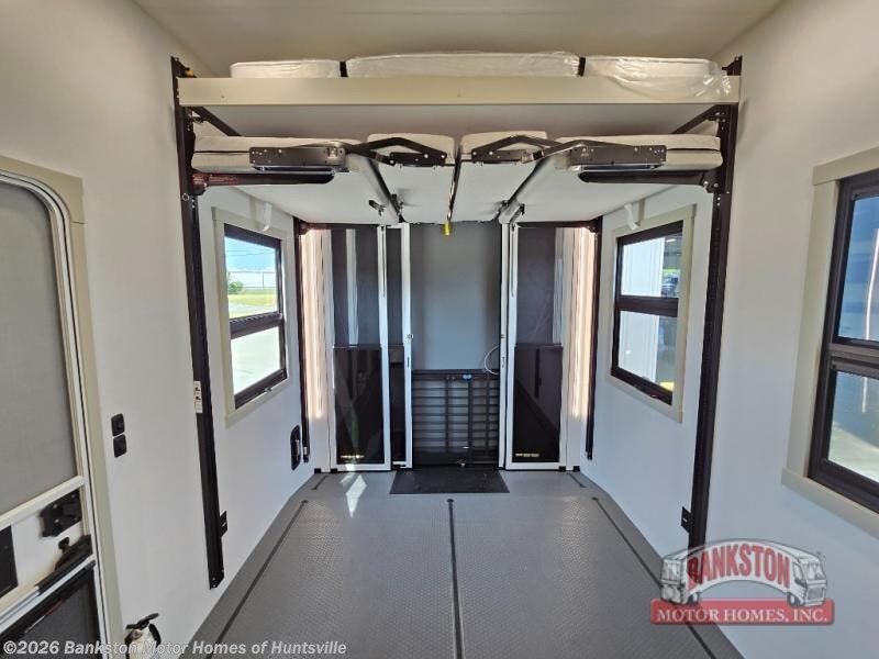 This toy hauler may just be the one you've been looking for! The garage/flex space with fold-away half bath walls will allow you to utilize the garage how you need it, plus there is an adjustable tie-down system, independent dual sofas, plus a loft for storage and a twin bed to sleep more campers! The garage patio with a 1,500 lb. capacity is another feature you are sure to love, especially with its own awning to keep you protected from the elements. Head to the kitchen to prepare meals with a 24" GE oven with a four burner range, a GE microwave with an air fryer, plus a spacious GE Energy Star 19 cu. ft. refrigerator. The island with two stools will let others visit with you while you cook, and there are even hidden dog bowls. You'll find the convertible dining table/L-desk will be accommodating since it can be use to dine at, and to get some work done. You may just find yourselves spending most of your time on the U-sofa in front of the TV and fireplace. A full bath is up front by the bedroom, and here you'll find neon shower lighting, a residential shower system, and pull-out linen storage to keep towels ready to use. After a day outdoors you'll love nothing more than coming back to your own bedroom with a king bed slide out, TV, a walk-in closet, and many more storage spaces. And we haven't even touched on the exterior features, like the 3-way pass-through storage, three power awnings, an air compressor to fill up tires, and the list goes on and on! This is a pre-production preview, all features and layout placement subject to change.