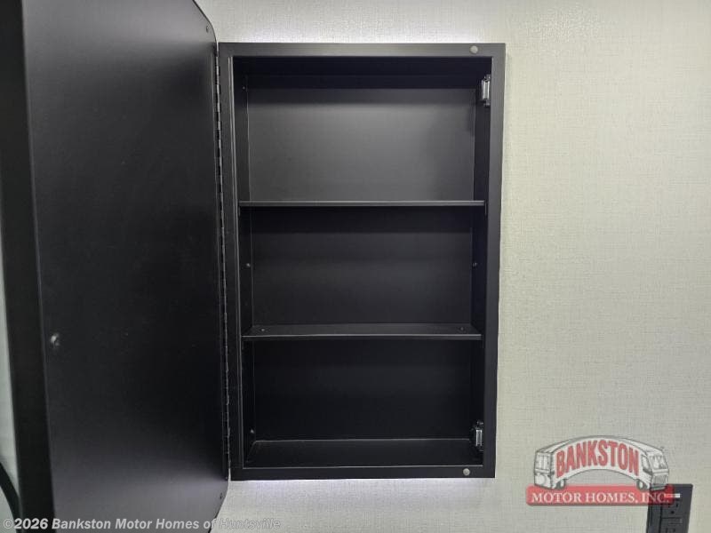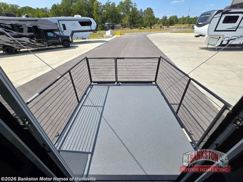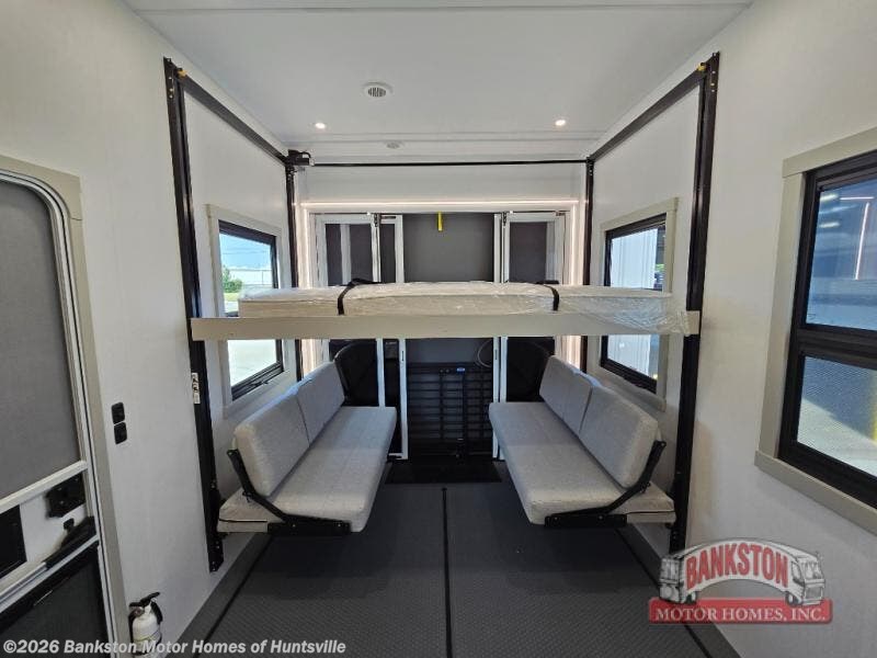 This toy hauler may just be the one you've been looking for! The garage/flex space with fold-away half bath walls will allow you to utilize the garage how you need it, plus there is an adjustable tie-down system, independent dual sofas, plus a loft for storage and a twin bed to sleep more campers! The garage patio with a 1,500 lb. capacity is another feature you are sure to love, especially with its own awning to keep you protected from the elements. Head to the kitchen to prepare meals with a 24" GE oven with a four burner range, a GE microwave with an air fryer, plus a spacious GE Energy Star 19 cu. ft. refrigerator. The island with two stools will let others visit with you while you cook, and there are even hidden dog bowls. You'll find the convertible dining table/L-desk will be accommodating since it can be use to dine at, and to get some work done. You may just find yourselves spending most of your time on the U-sofa in front of the TV and fireplace. A full bath is up front by the bedroom, and here you'll find neon shower lighting, a residential shower system, and pull-out linen storage to keep towels ready to use. After a day outdoors you'll love nothing more than coming back to your own bedroom with a king bed slide out, TV, a walk-in closet, and many more storage spaces. And we haven't even touched on the exterior features, like the 3-way pass-through storage, three power awnings, an air compressor to fill up tires, and the list goes on and on! This is a pre-production preview, all features and layout placement subject to change.