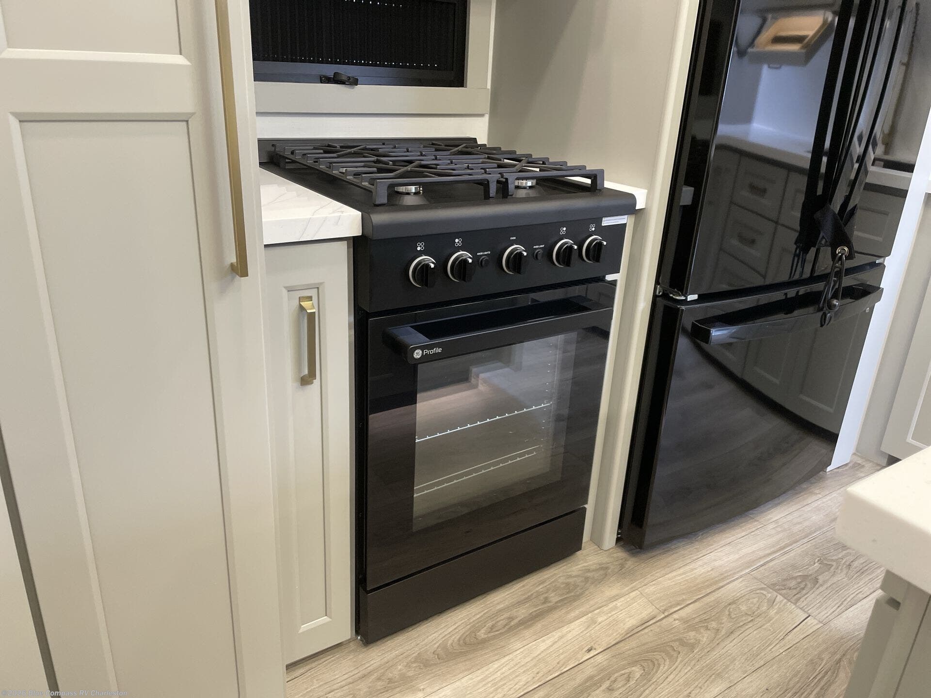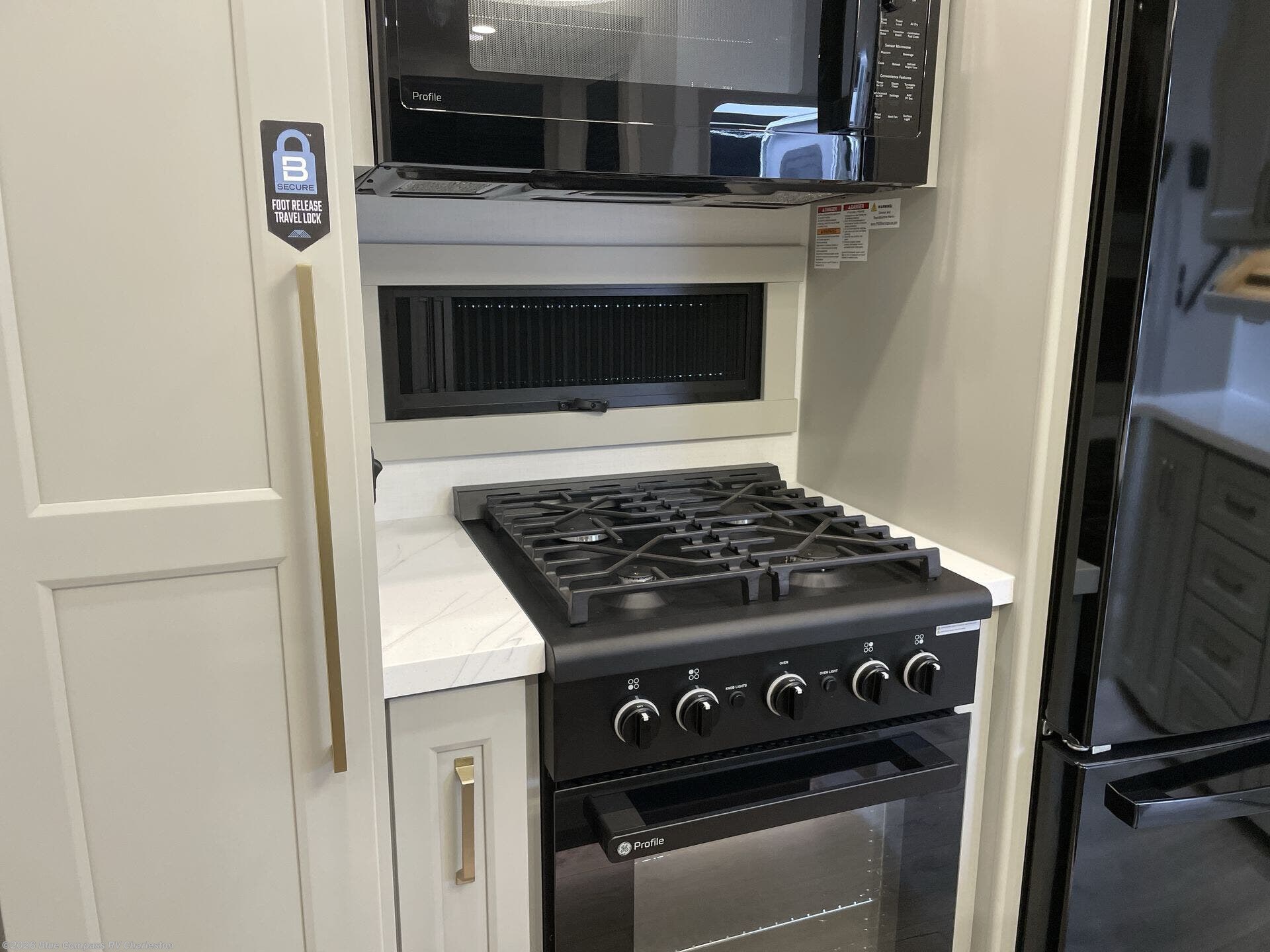 Prepare to be amazed by all the features packed into this toy hauler! There are triple slides that will provide your crew with more space, a 16' separate garage flex area that can sleep five with the loft included, plus a bath and a half for added convenience. The chef in your group will love the middle kitchen with a waterfall island that converts to a counter peninsula, a pull-out pantry, a GE Energy Star 19 cu. ft. refrigerator with ice and filtered water, and much more. In the combined kitchen and living area you'll find a spacious sofa with heat and massage, a fireplace, a TV, plus convenient dog bowls and shoe storage. After your toys are unloaded from the garage, you can relax on the independent dual couches with a Fold-N-Stow table in between. You will find the front private bedroom with a king bed slide out will provide a great night's rest, and you'll also find a walk-in closet, under-bed storage, and a sliding dresser top with hidden storage for special belongings.