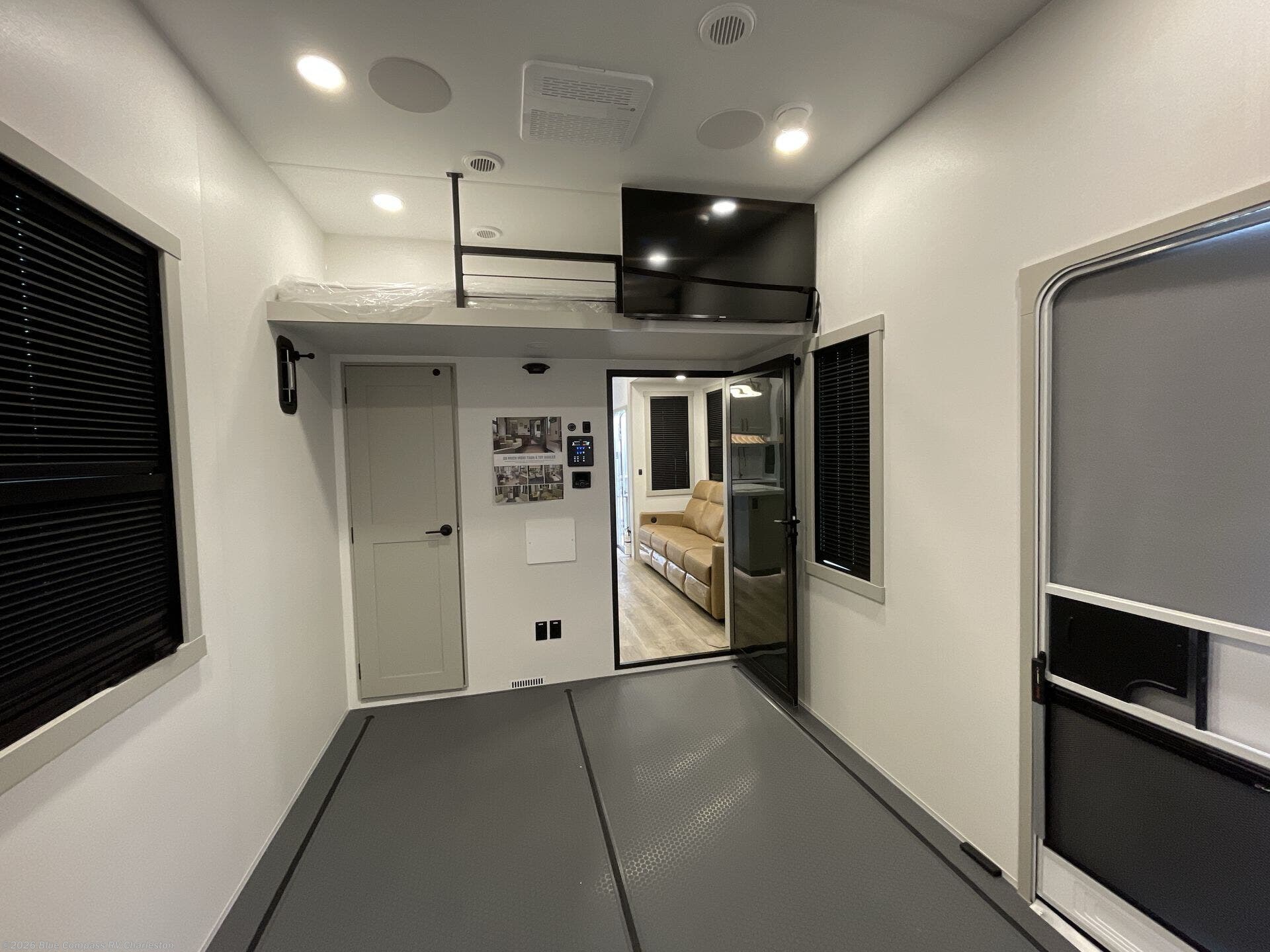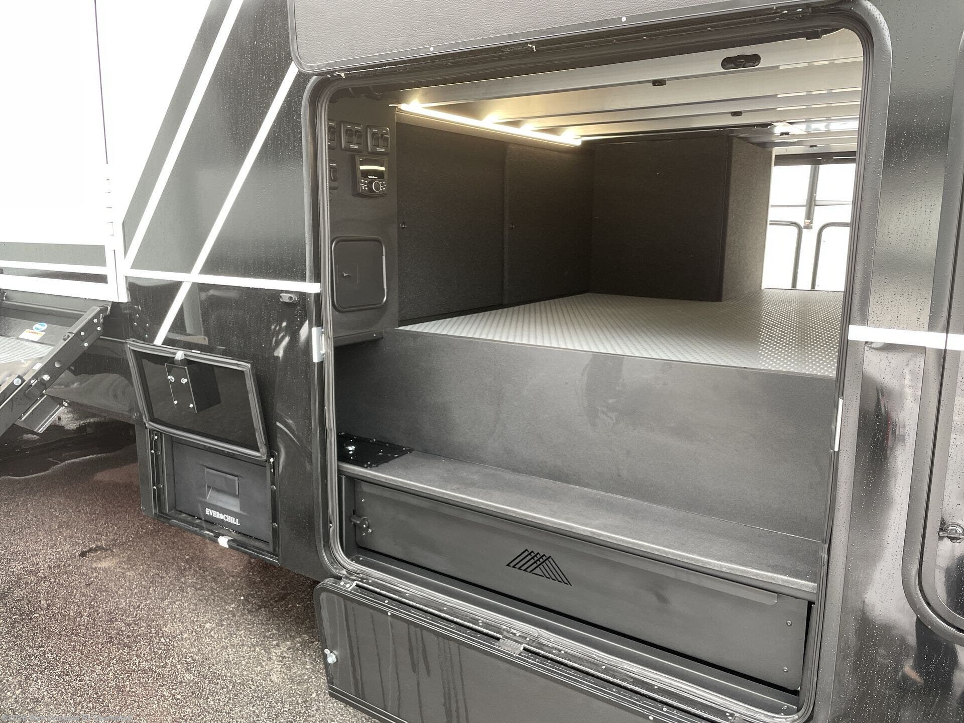 With any Model G toy hauler fifth wheel by Brinkley you will enjoy luxurious amenities, tons of storage space, and innovative features that have been developed and tested in the real world. Durable construction includes an industry leading PDI process, an industry best insulation package, and reinforced and walkable slide roofs. Some of the exterior features you'll find are a 3-way pass-through with a multi-functional flip-up bulkhead wall, under I-beam storage, a MAX-Vision reverse lighting system, and a low-maintenance roof to name a few. A Rockford Fosgate audio system comes standard, along with a OneControl app system that lets you control your fifth wheel's functions right from your mobile device. You will find the solar system with a designated storage area to be ultra convenient, plus there is a FlexPower 5500 with a dual fuel inverter generator for all your power needs. Head inside to find a residential interior with Brinkley's CraftSense wood trim construction, floating entrance steps, integrated window screens and insulated blackout blinds, and residential solid surface countertops plus backsplash. You will also enjoy the neon shower lighting and recessed medicine cabinets in the bath, plus motion activated LED bed lights and dual bedside outlets in the bedroom. Choose a Model G toy hauler fifth wheel to experience all the luxury it has to offer!