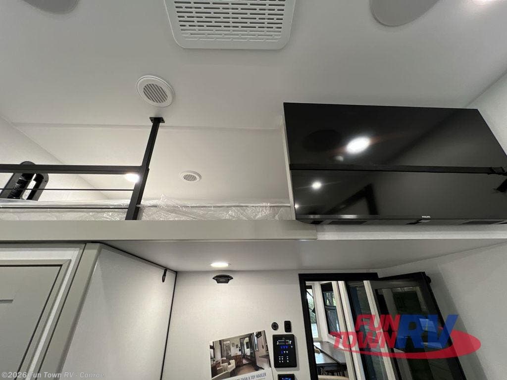 The front bedroom is a serene retreat, featuring a plush king bed, spacious walk-in closet, 32” smart TV, sliding dresser top, and hidden storage for better organization.The bathroom is a haven of convenience, boasting a full bathroom with pull-out linen and trash bin, and a spacious 30 x 42 shower. Perfect for freshening up after a long day of adventure! The kitchen has a pantry featuring adjustable shelving, a hutch, 19 cu. refrigerator, microwave, four-burner cooktop, kitchen island, and convertible dining table/L-desk. Plus, pet bowls for your furry friends! Gather with family and friends in the living room, which features a dual sofa with two recliners, each with heat and massage functions, a televator, and a cozy fireplace. It's the perfect spot to relax and unwind! The garage has a half bathroom, two sofas, and a 43” smart TV, ideal for game days, movie nights, or just relaxing with friends. Outside, enjoy the convenience of a fuel station, three-way pass-thru storage, and LP quick connect. Whether you're an adventure-seeker, or just love to travel in style, this toy hauler has everything you need and more!