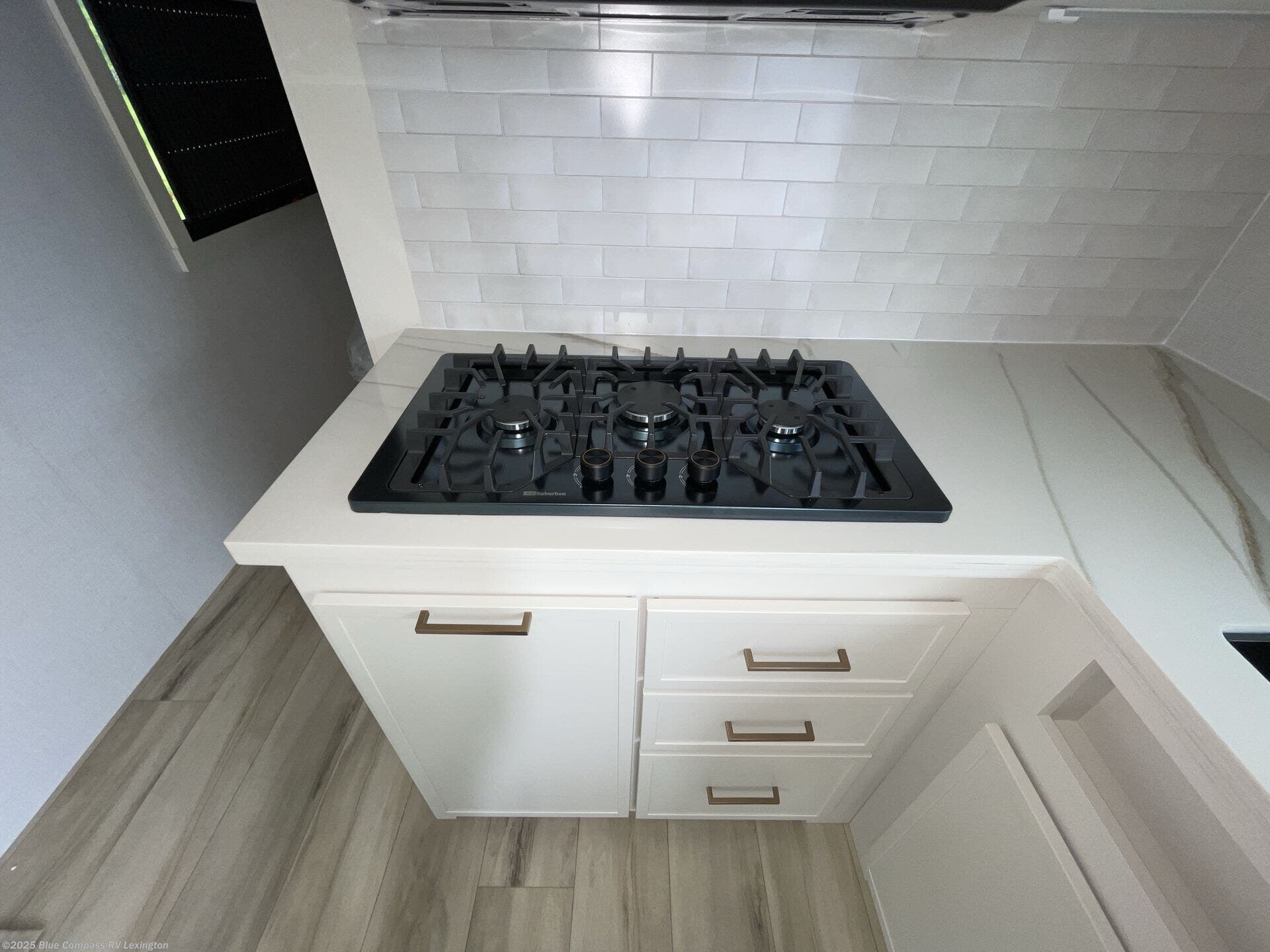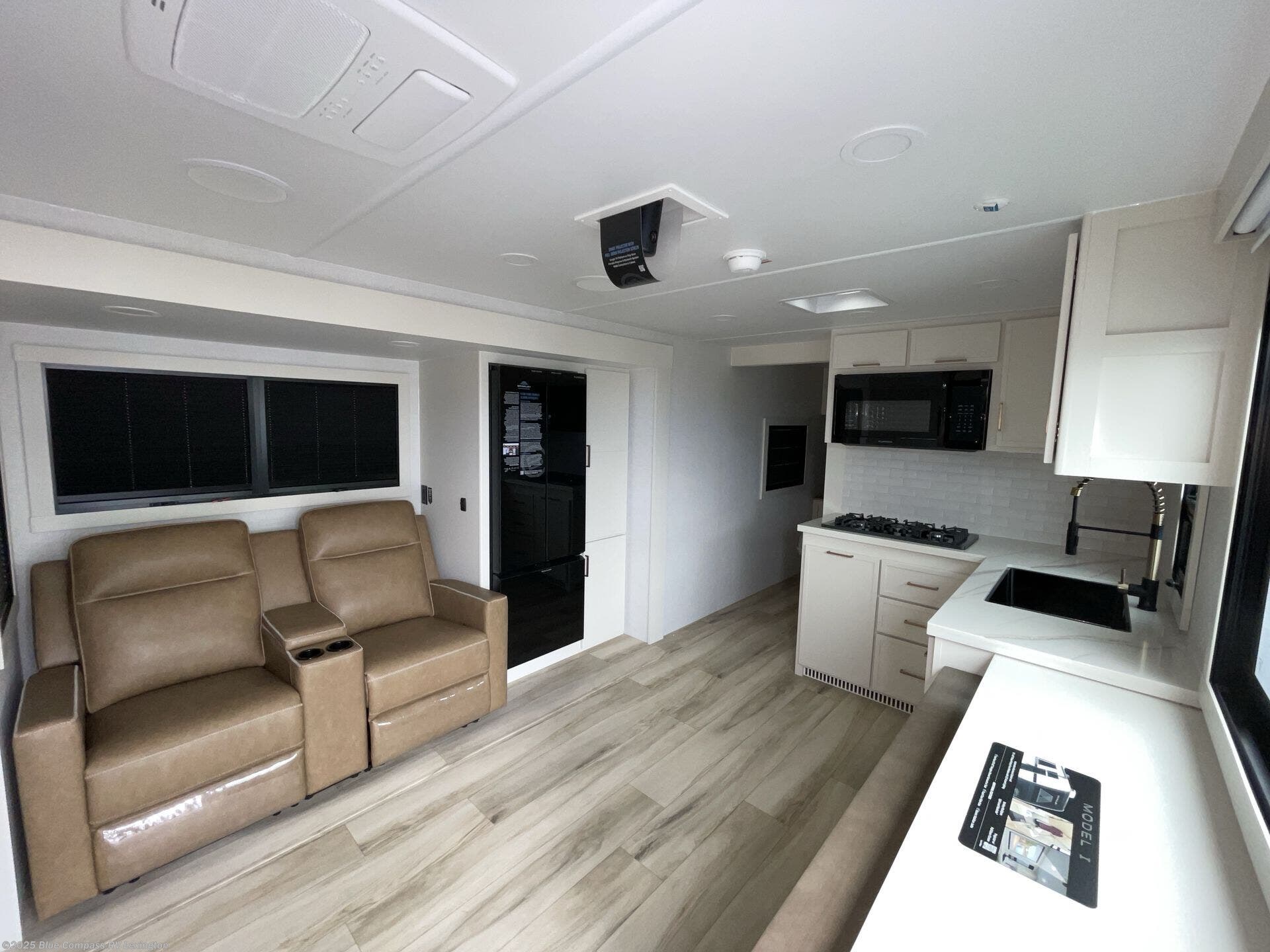 One look at this travel trailer and you'll be sold! The full rear bath features a spacious 42" x 30" shower with a built-in seat and Maxxair fan to name a few comforts. The front private bedroom features a 66" x 80" king bed with a MaxSpace Split-Level Wardrobe underneath to store shoes, clothes, and more! A slide out in the combined living area and kitchen makes your space more open, and you'll enjoy relaxing on the theater seating here in the evenings. The full kitchen includes a three burner stovetop, residential 30" convection microwave, 12 cu. ft. 12V refrigerator, plus a trash bin and Stow N' Go paper towel holder for added convenience. You can choose to eat outdoors under the 19' electric awning with LED lights or stay inside to dine at the pull-out dining table with a drawer for added storage! And if you're needing more sleeping space, just choose the optional tri-fold sofa in place of the theater seating!