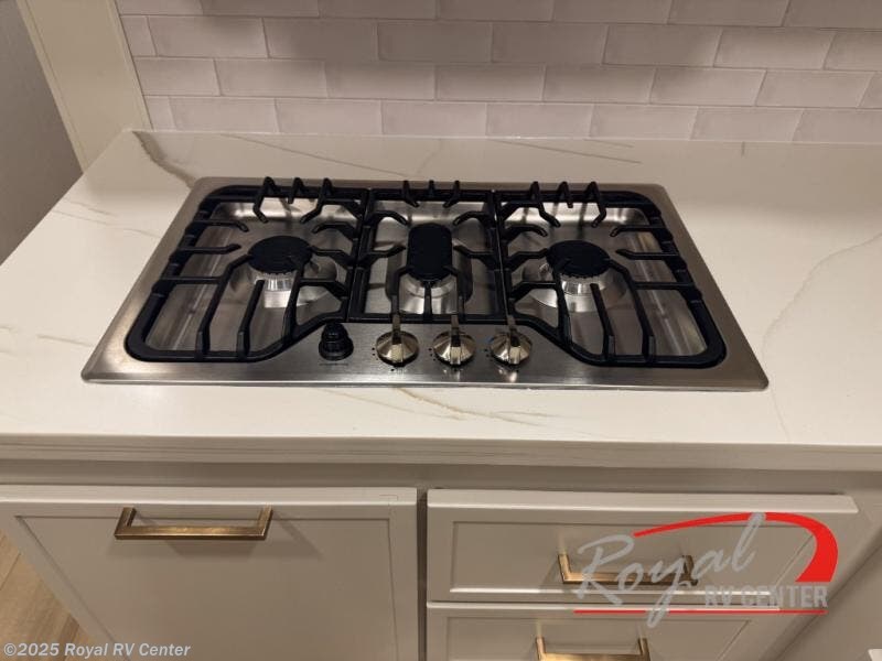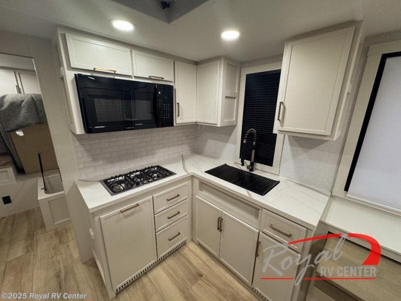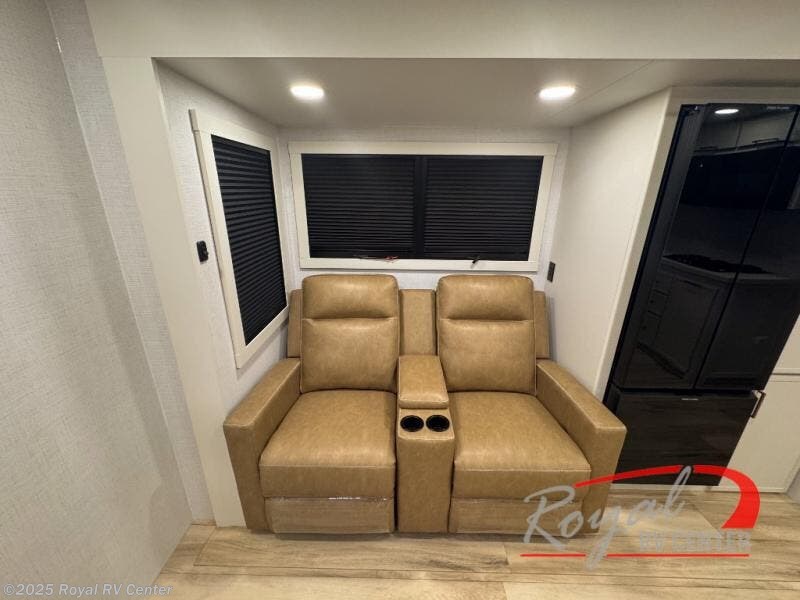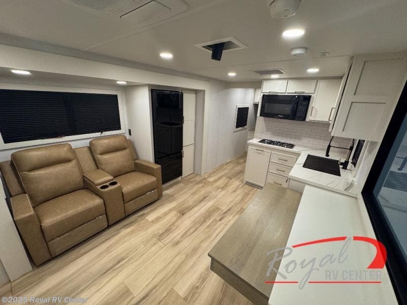 One look at this travel trailer and you'll be sold! The full rear bath features a spacious 42" x 30" shower with a built-in seat and Maxxair fan to name a few comforts. The front private bedroom features a 66" x 80" king bed with a MaxSpace Split-Level Wardrobe underneath to store shoes, clothes, and more! A slide out in the combined living area and kitchen makes your space more open, and you'll enjoy relaxing on the theater seating here in the evenings. The full kitchen includes a three burner stovetop, residential 30" convection microwave, 12 cu. ft. 12V refrigerator, plus a trash bin and Stow N' Go paper towel holder for added convenience. You can choose to eat outdoors under the 19' electric awning with LED lights or stay inside to dine at the pull-out dining table with a drawer for added storage! And if you're needing more sleeping space, just choose the optional tri-fold sofa in place of the theater seating!