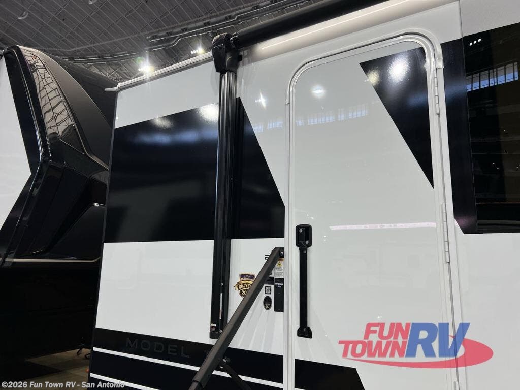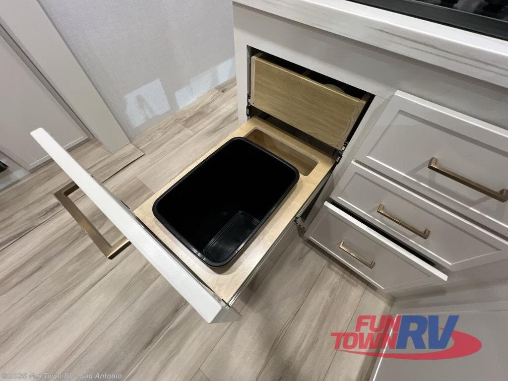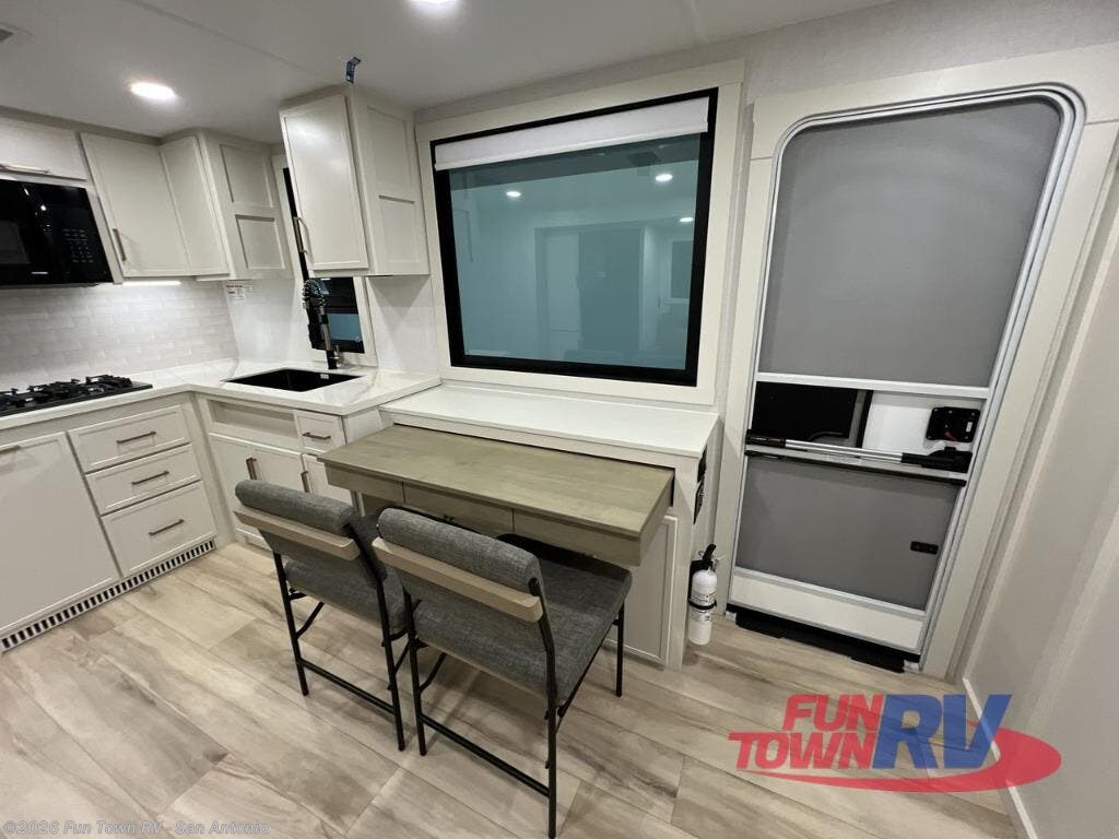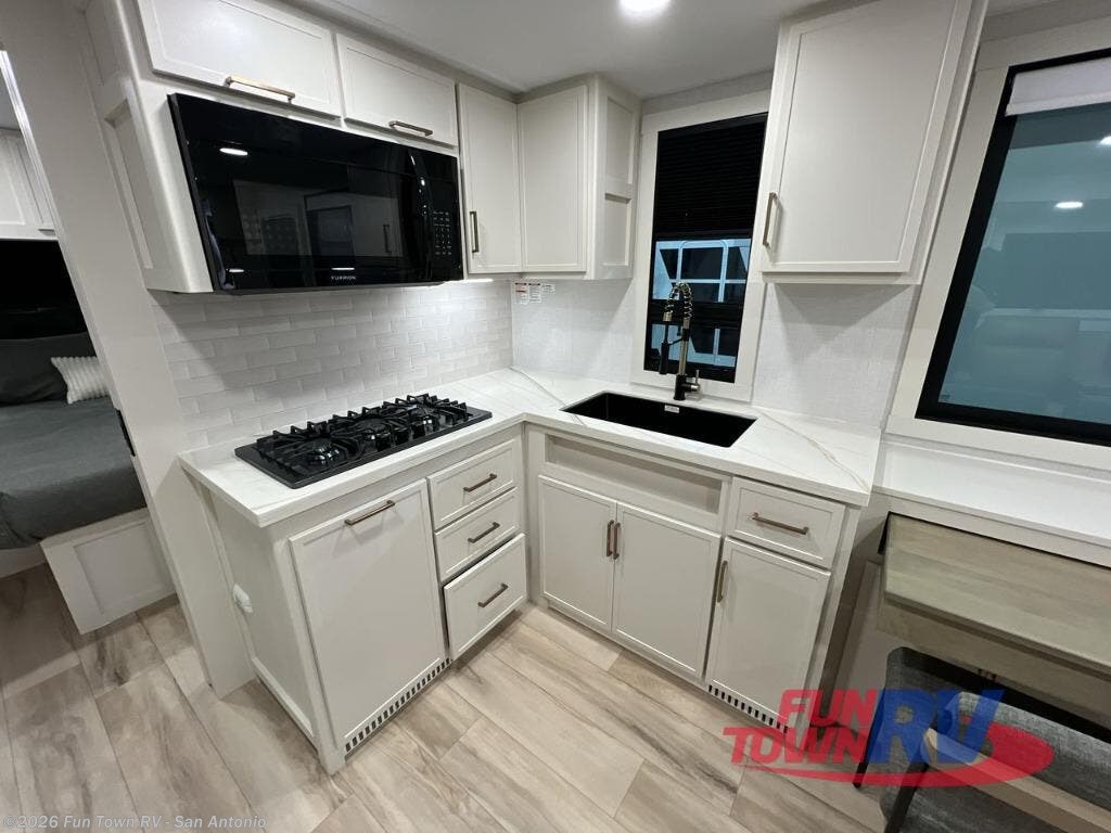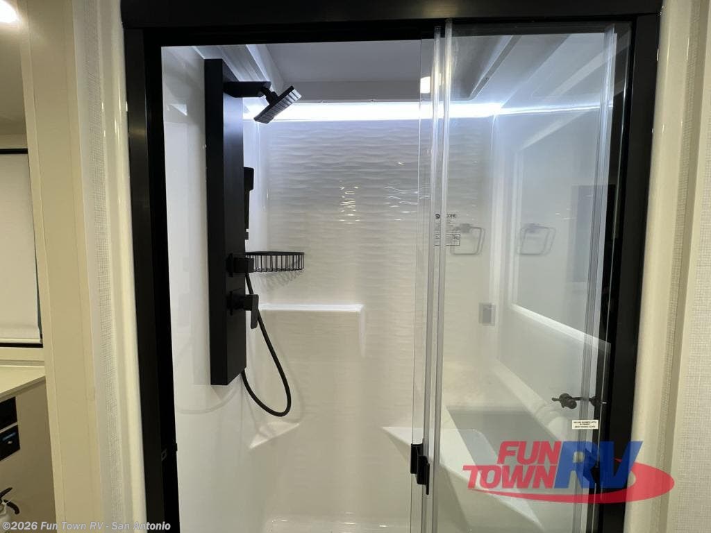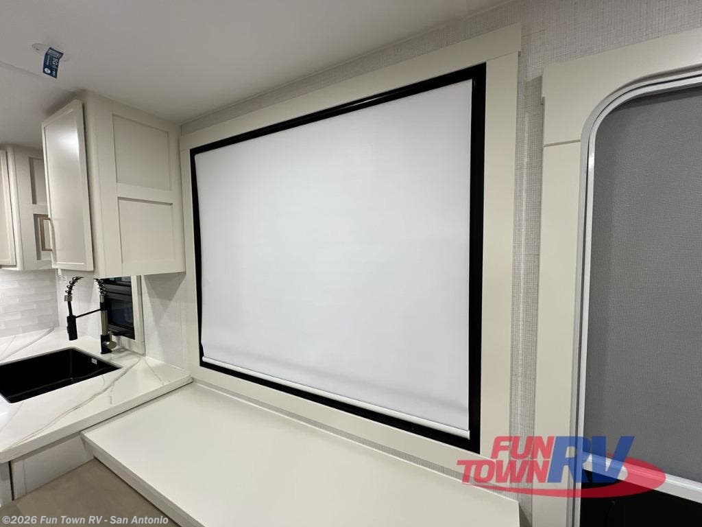 One look at this travel trailer and you'll be sold! The full rear bath features a spacious 30" x 42" shower with a glass shower door, built-in seat, and Maxxair fan to name a few comforts. The front private bedroom features a 66" x 80" king bed with a MaxSpace split-level wardrobe underneath to store shoes, clothes, and more! A slide out in the combined living area and kitchen makes your space more open, and you'll enjoy relaxing on the theater seating here in the evenings. There is also a 48" x 40" smart window with a screen that will allow you to view your indoor/outdoor projector screen for movies! The full kitchen includes a three burner stovetop, residential 30" convection microwave, 12 cu. ft. 12V refrigerator, plus a trash bin and Stow N' Go paper towel holder for added convenience. You can choose to eat outdoors under the 19' electric awning with LED lights or stay inside to dine at the pull-out dining table with a drawer for added storage!