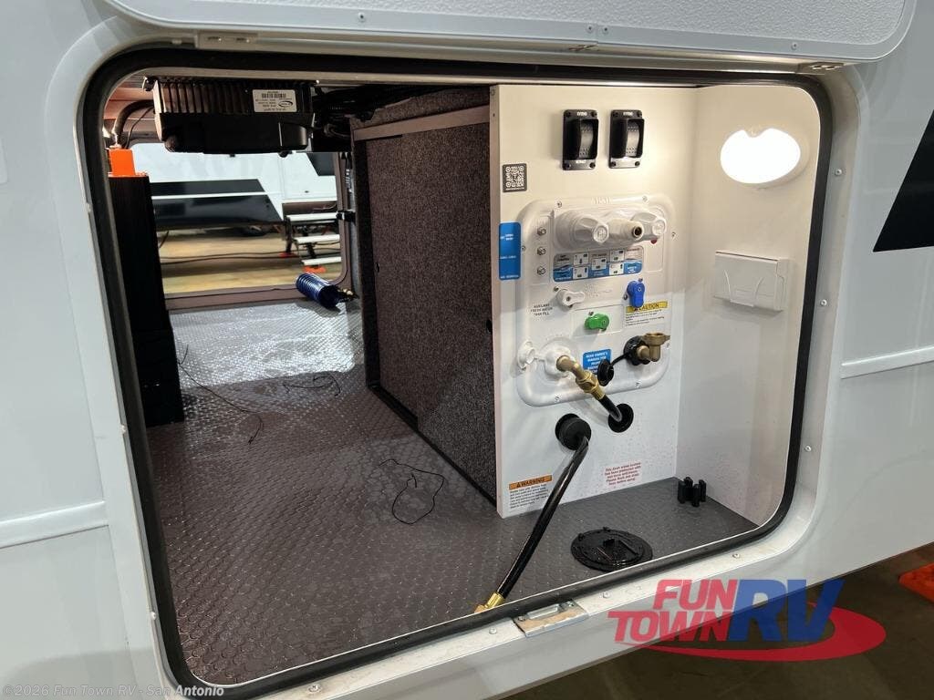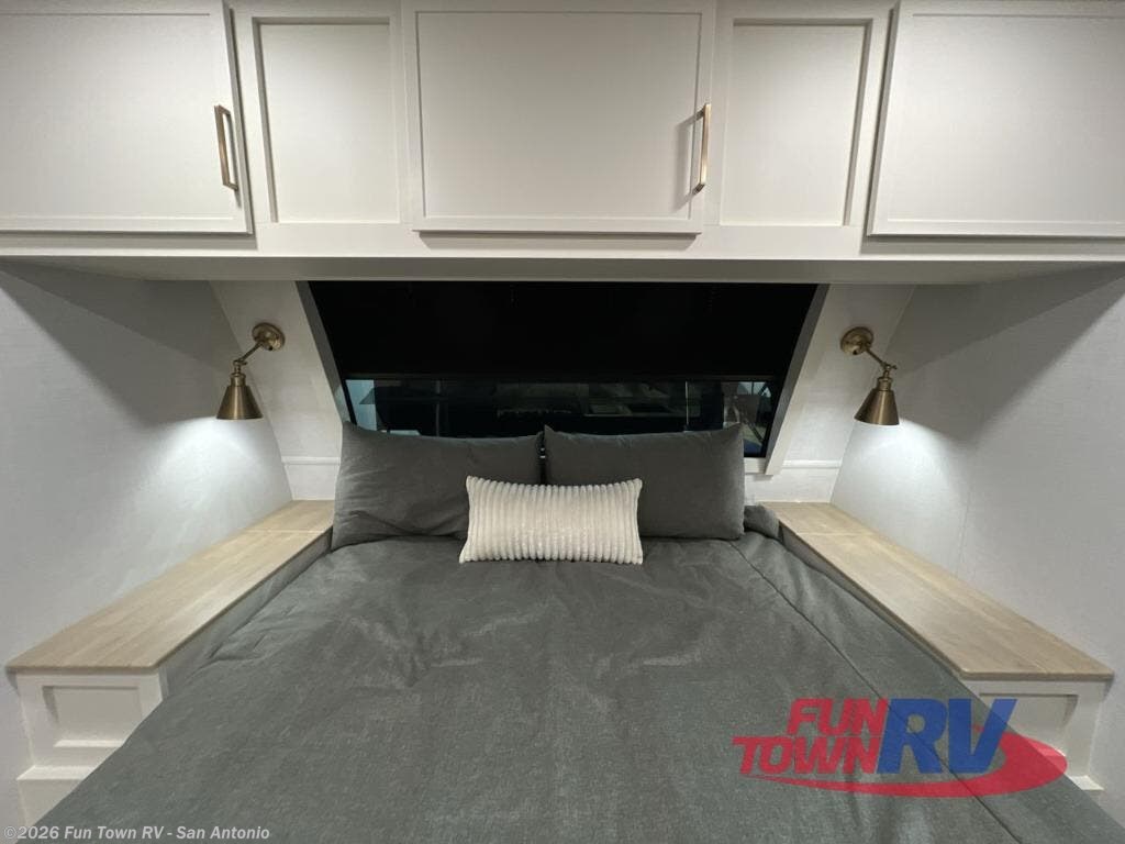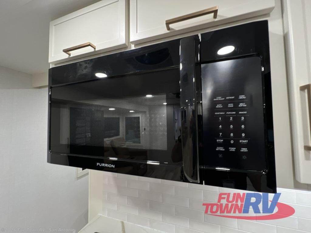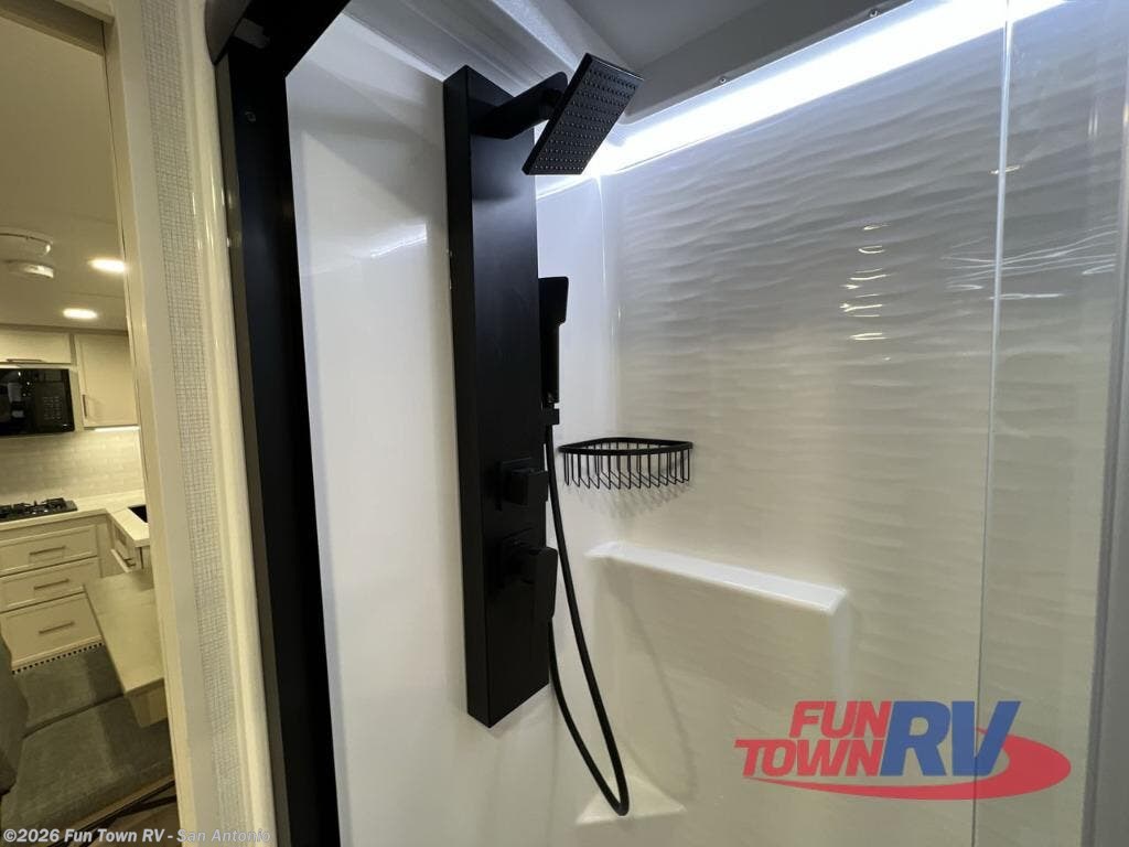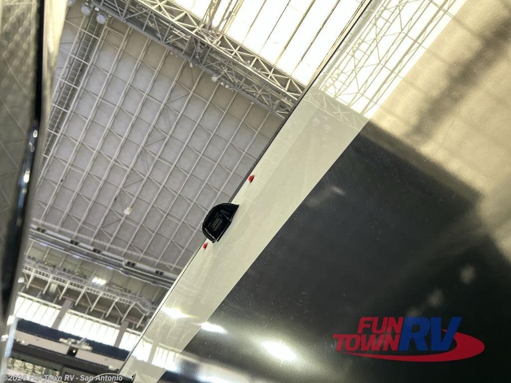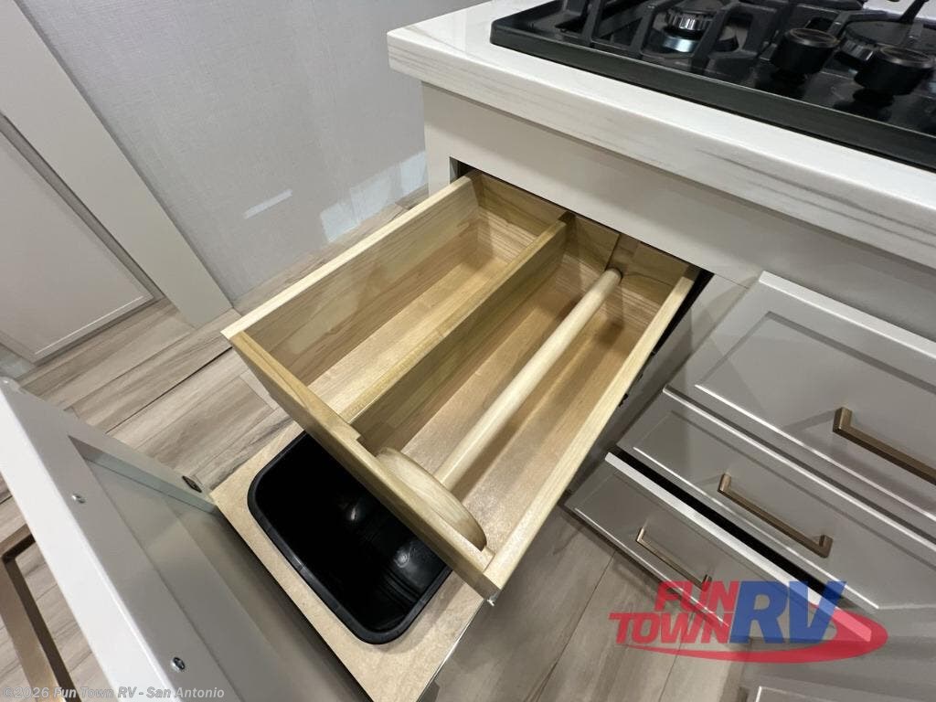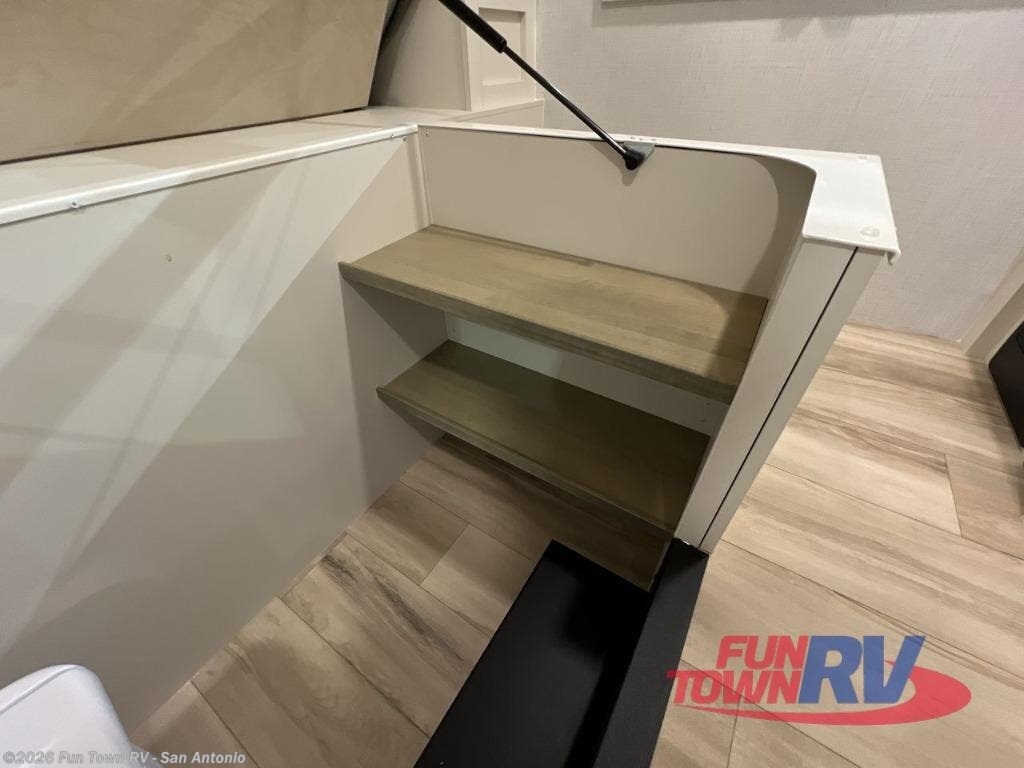 One look at this travel trailer and you'll be sold! The full rear bath features a spacious 30" x 42" shower with a glass shower door, built-in seat, and Maxxair fan to name a few comforts. The front private bedroom features a 66" x 80" king bed with a MaxSpace split-level wardrobe underneath to store shoes, clothes, and more! A slide out in the combined living area and kitchen makes your space more open, and you'll enjoy relaxing on the theater seating here in the evenings. There is also a 48" x 40" smart window with a screen that will allow you to view your indoor/outdoor projector screen for movies! The full kitchen includes a three burner stovetop, residential 30" convection microwave, 12 cu. ft. 12V refrigerator, plus a trash bin and Stow N' Go paper towel holder for added convenience. You can choose to eat outdoors under the 19' electric awning with LED lights or stay inside to dine at the pull-out dining table with a drawer for added storage!
