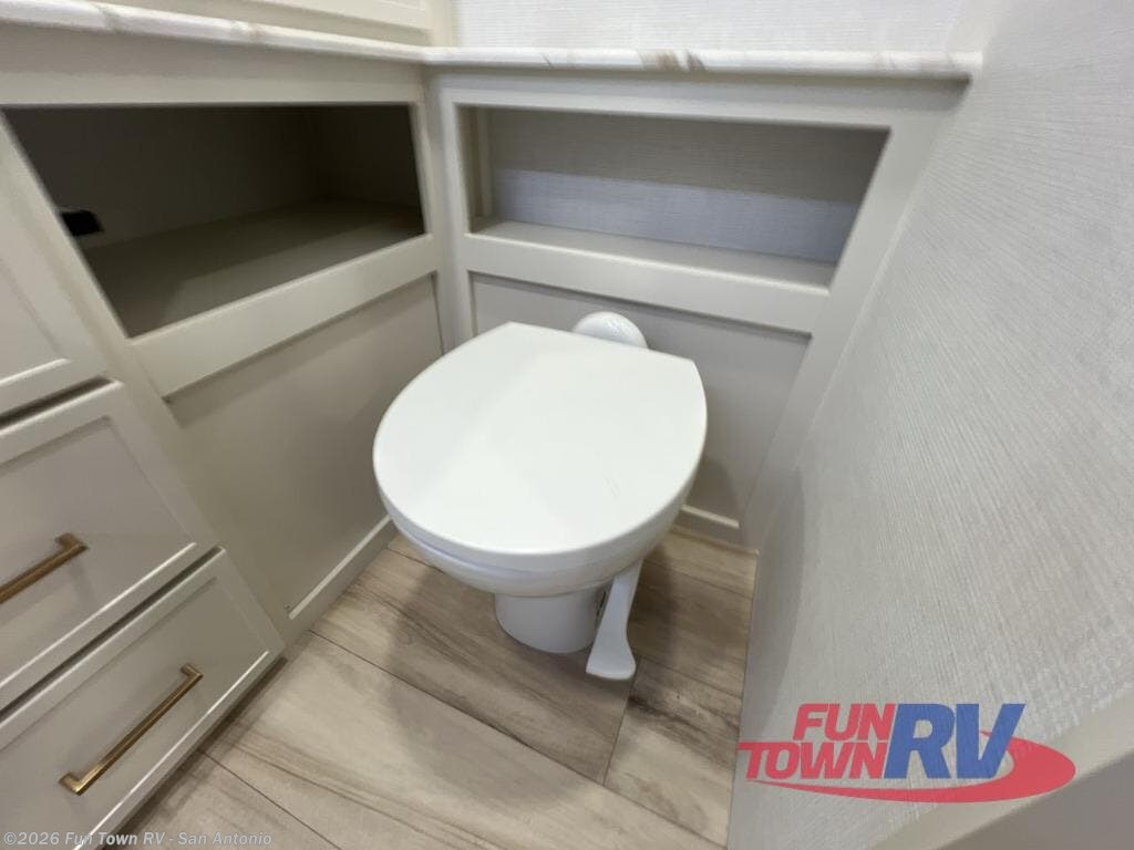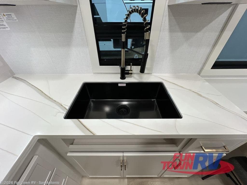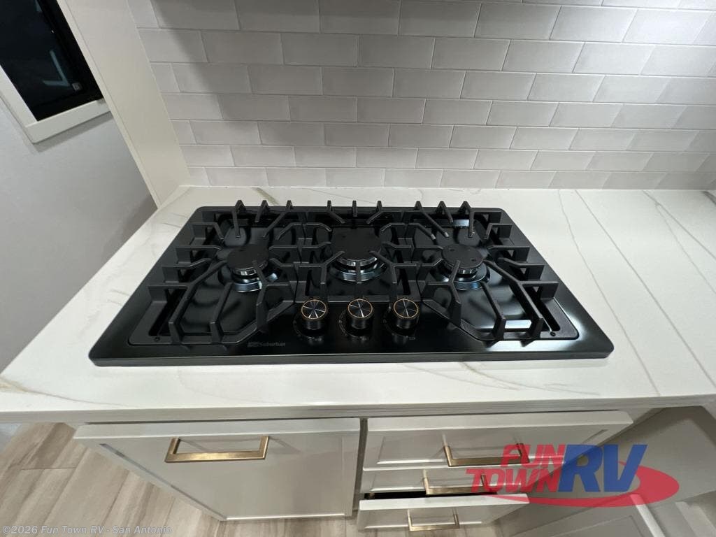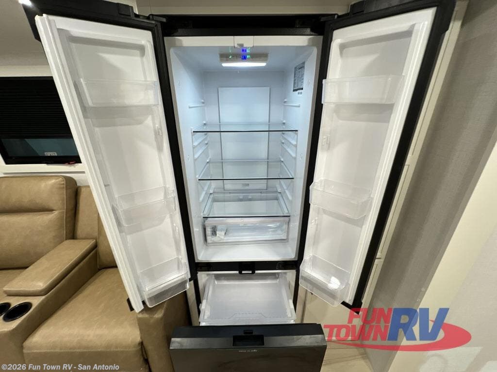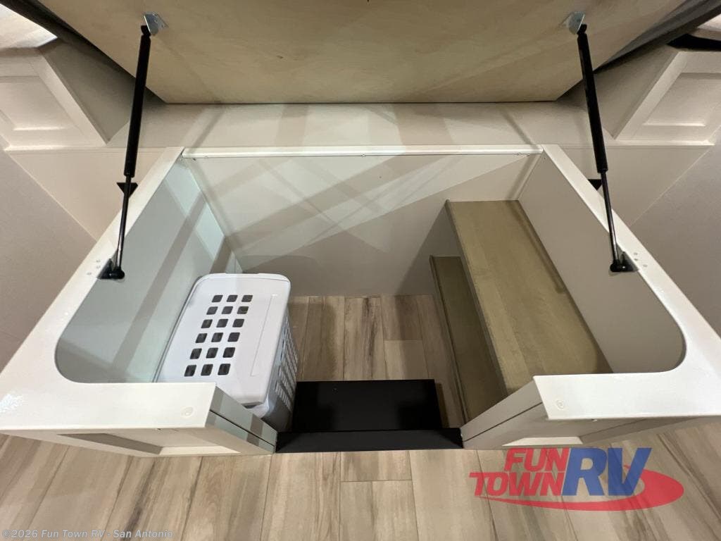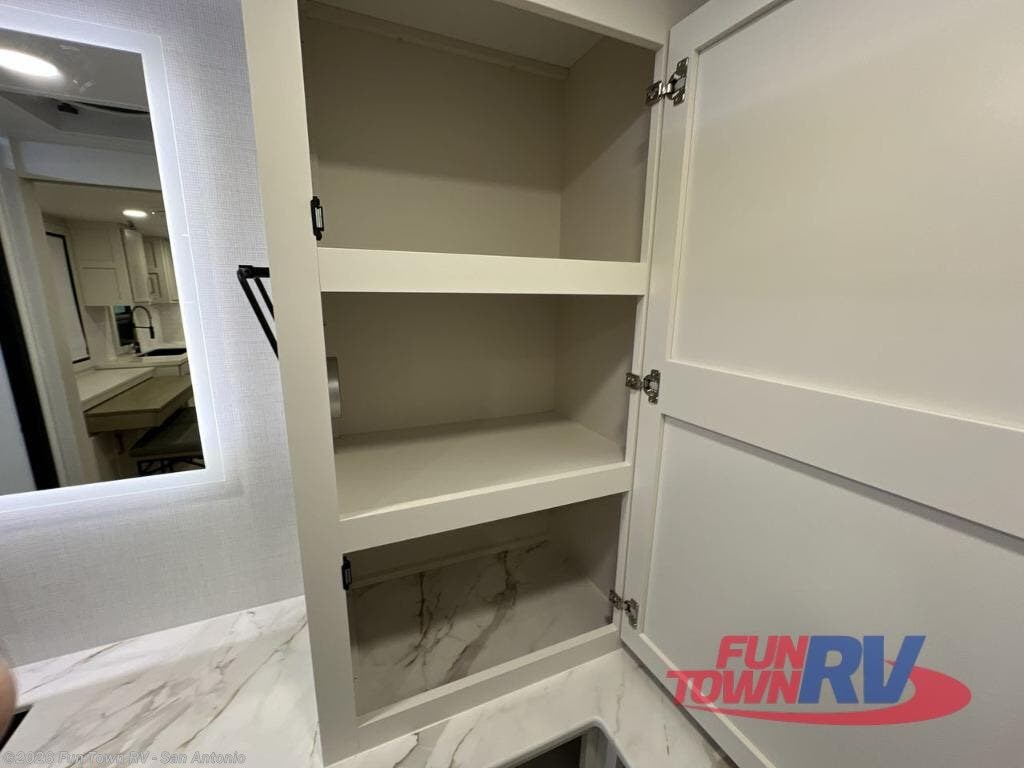 One look at this travel trailer and you'll be sold! The full rear bath features a spacious 30" x 42" shower with a glass shower door, built-in seat, and Maxxair fan to name a few comforts. The front private bedroom features a 66" x 80" king bed with a MaxSpace split-level wardrobe underneath to store shoes, clothes, and more! A slide out in the combined living area and kitchen makes your space more open, and you'll enjoy relaxing on the theater seating here in the evenings. There is also a 48" x 40" smart window with a screen that will allow you to view your indoor/outdoor projector screen for movies! The full kitchen includes a three burner stovetop, residential 30" convection microwave, 12 cu. ft. 12V refrigerator, plus a trash bin and Stow N' Go paper towel holder for added convenience. You can choose to eat outdoors under the 19' electric awning with LED lights or stay inside to dine at the pull-out dining table with a drawer for added storage!