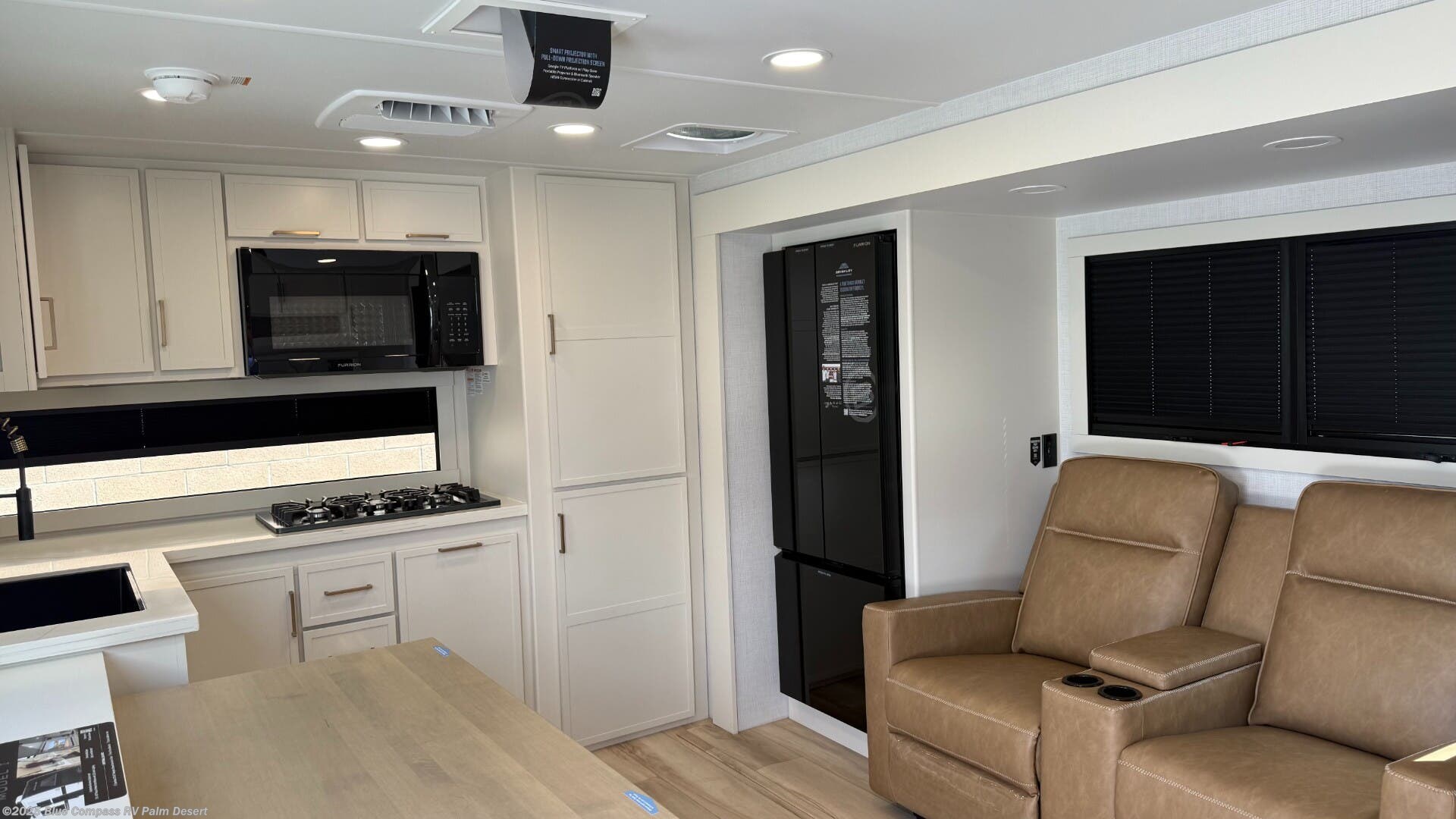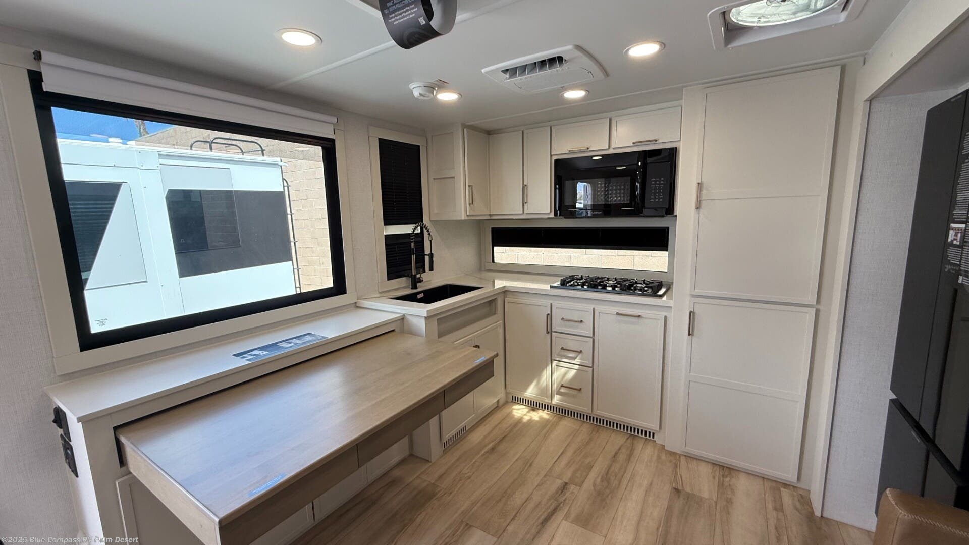 This travel trailer can comfortably sleep four with the king bed in the private bedroom and the tri-fold sofa in the main living area! The full bath features a spacious 42" x 30" shower with a built-in seat and Maxxair fan to name a few comforts. The front private bedroom features a 66" x 80" king bed with a MaxSpace Split-Level Wardrobe underneath to store shoes, clothes, and more! A slide out in the combined living area and rear kitchen makes your space more open, and you'll enjoy relaxing on the theater seating here in the evenings. The full kitchen includes a three burner stovetop, residential 30" convection microwave, 12 cu. ft. 12V refrigerator, plus a trash bin and Stow N' Go paper towel holder for added convenience. You can choose to eat outdoors under the 19' electric awning with LED lights or stay inside to dine at the pull-out dining table with a drawer for added storage!