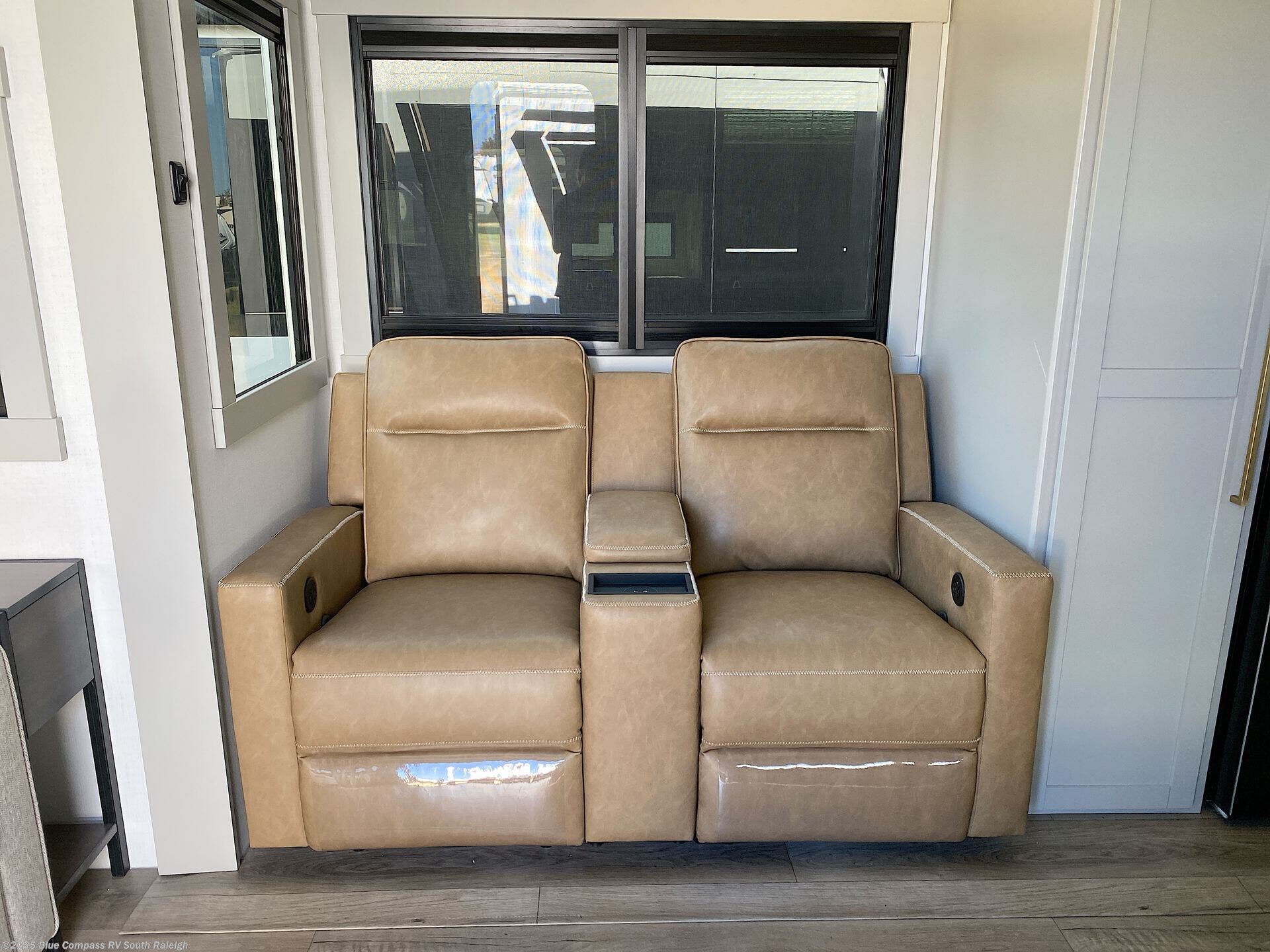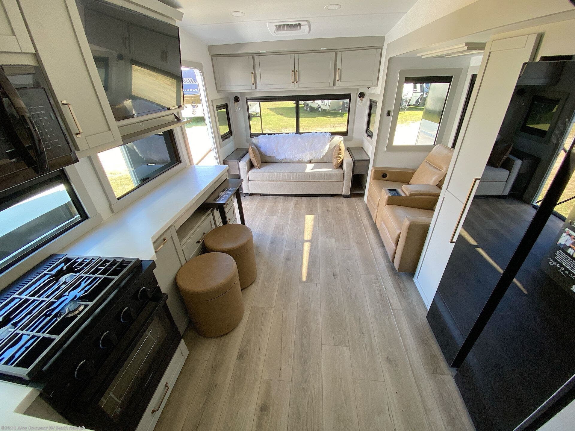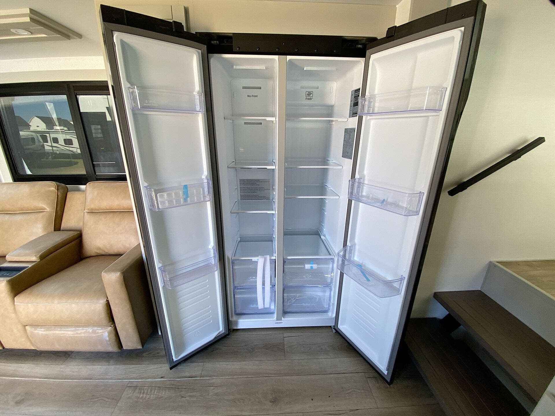 You'll love every minute spent in this luxury fifth wheel! Your crew can get comfortable in the rear living room on the 72" tri-fold sofa that converts to a 62" x 70" bed, or on the theater seating within the slide out. There is also a sliding dining table and a TV with swivel so everyone can have a good view of the movie. A full kitchen, complete with a cooktop, 30" residential microwave, and 16 cu. ft. refrigerator will let you cook and store food, and there is a handy trash bin with a Stow N' Go paper towel holder for easy clean up. The full bath will let you freshen up before heading to bed in the front private bedroom!