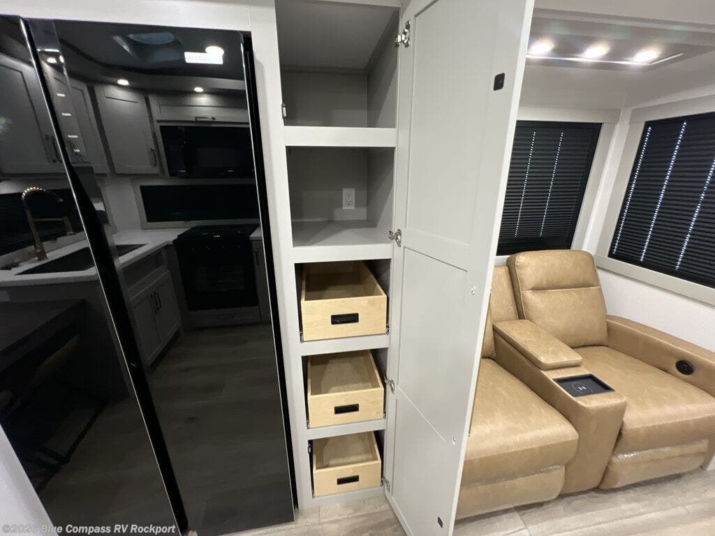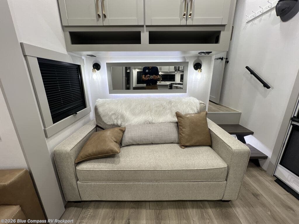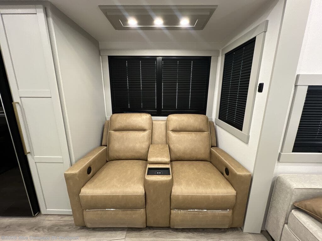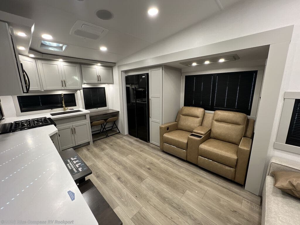 You'll love every minute spent in this spacious fifth wheel that can sleep four each night. There is a front private bedroom with a queen bed and 4x under-bed drawers to keep your space tidy. Your guests can sleep on the tri-fold sofa that extends to a 54" x 70" bed at night. The theater seating sits directly across from the 50" articulating TV for movie nights, and the pantry with drawers is right next to the theater seating for quick access to snacks! The chef of your group is sure to love the kitchen with its ample counter space, 30" residential microwave, and a sliding dining table with a drawer for even more storage. The desk in the back will allow you to get some work done if needed, or you can just spend your days outdoors under the two power awnings. There is also an exterior 12V refrigerator and storage, exterior speakers and controls, and a pass-thru storage for camp gear!