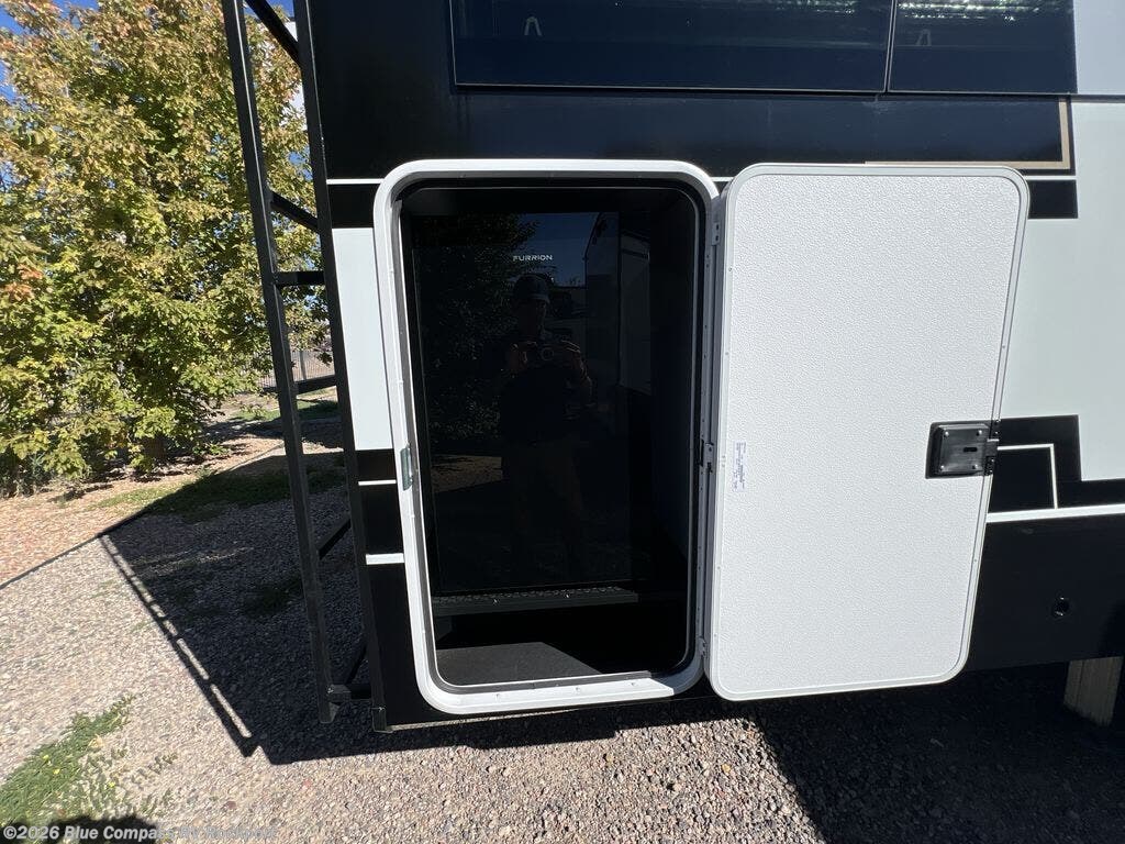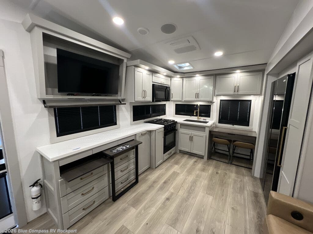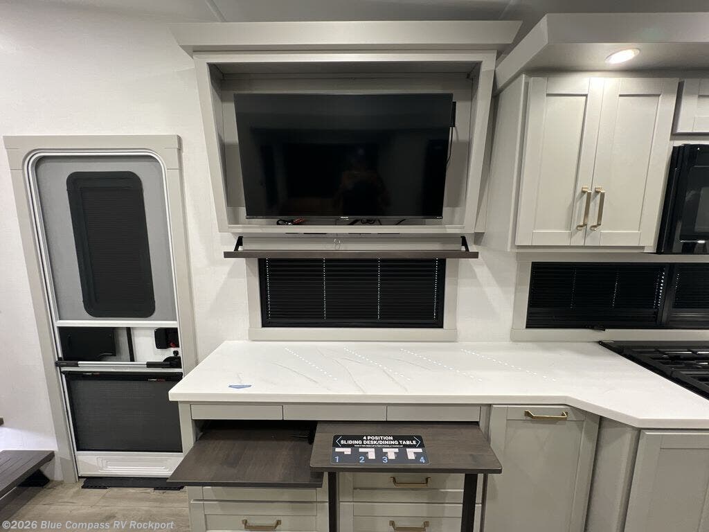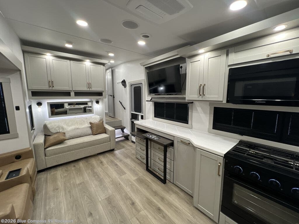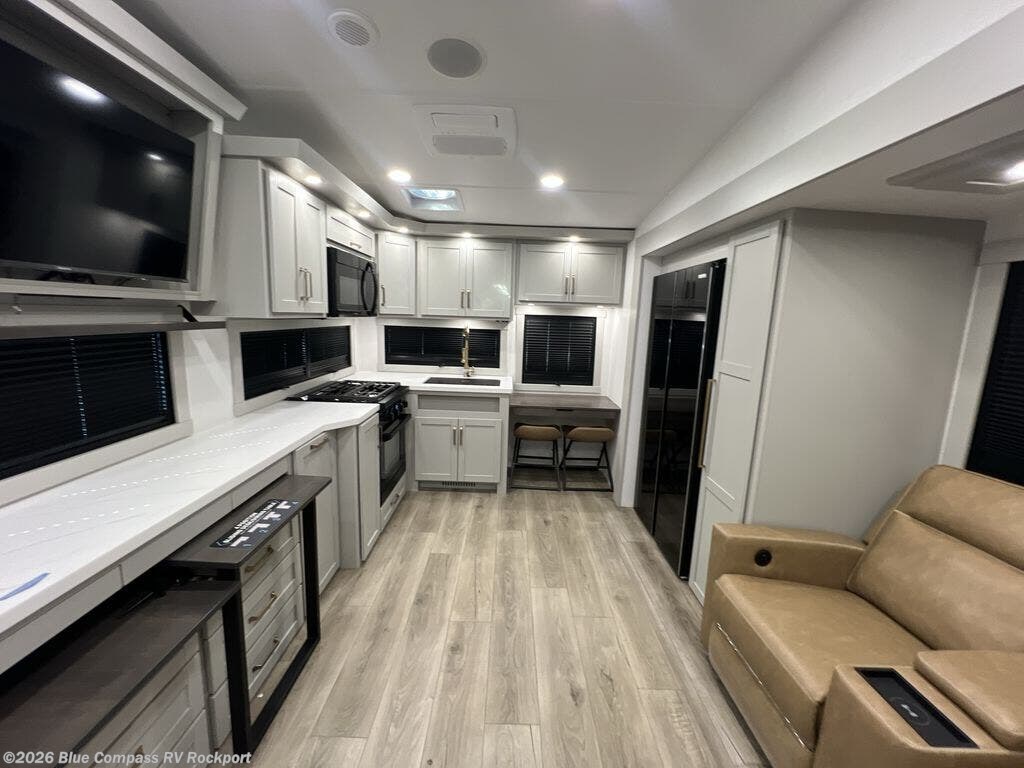 You'll love every minute spent in this spacious fifth wheel that can sleep four each night. There is a front private bedroom with a queen bed and 4x under-bed drawers to keep your space tidy. Your guests can sleep on the tri-fold sofa that extends to a 54" x 70" bed at night. The theater seating sits directly across from the 50" articulating TV for movie nights, and the pantry with drawers is right next to the theater seating for quick access to snacks! The chef of your group is sure to love the kitchen with its ample counter space, 30" residential microwave, and a sliding dining table with a drawer for even more storage. The desk in the back will allow you to get some work done if needed, or you can just spend your days outdoors under the two power awnings. There is also an exterior 12V refrigerator and storage, exterior speakers and controls, and a pass-thru storage for camp gear!