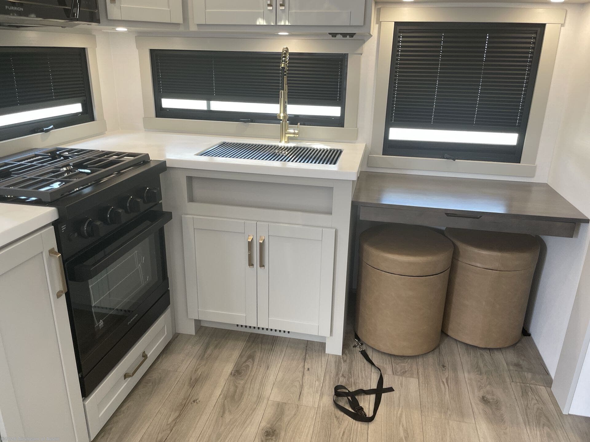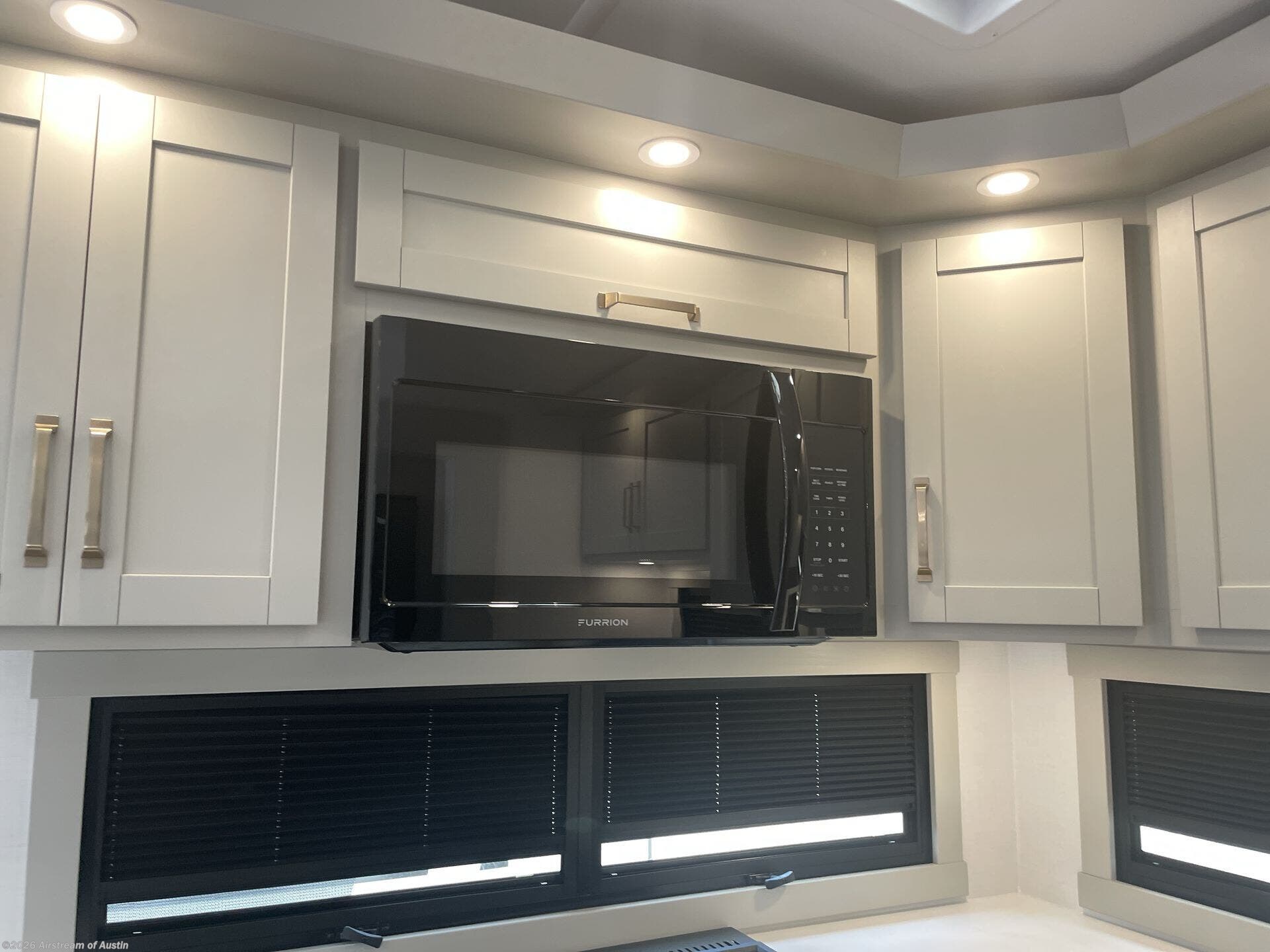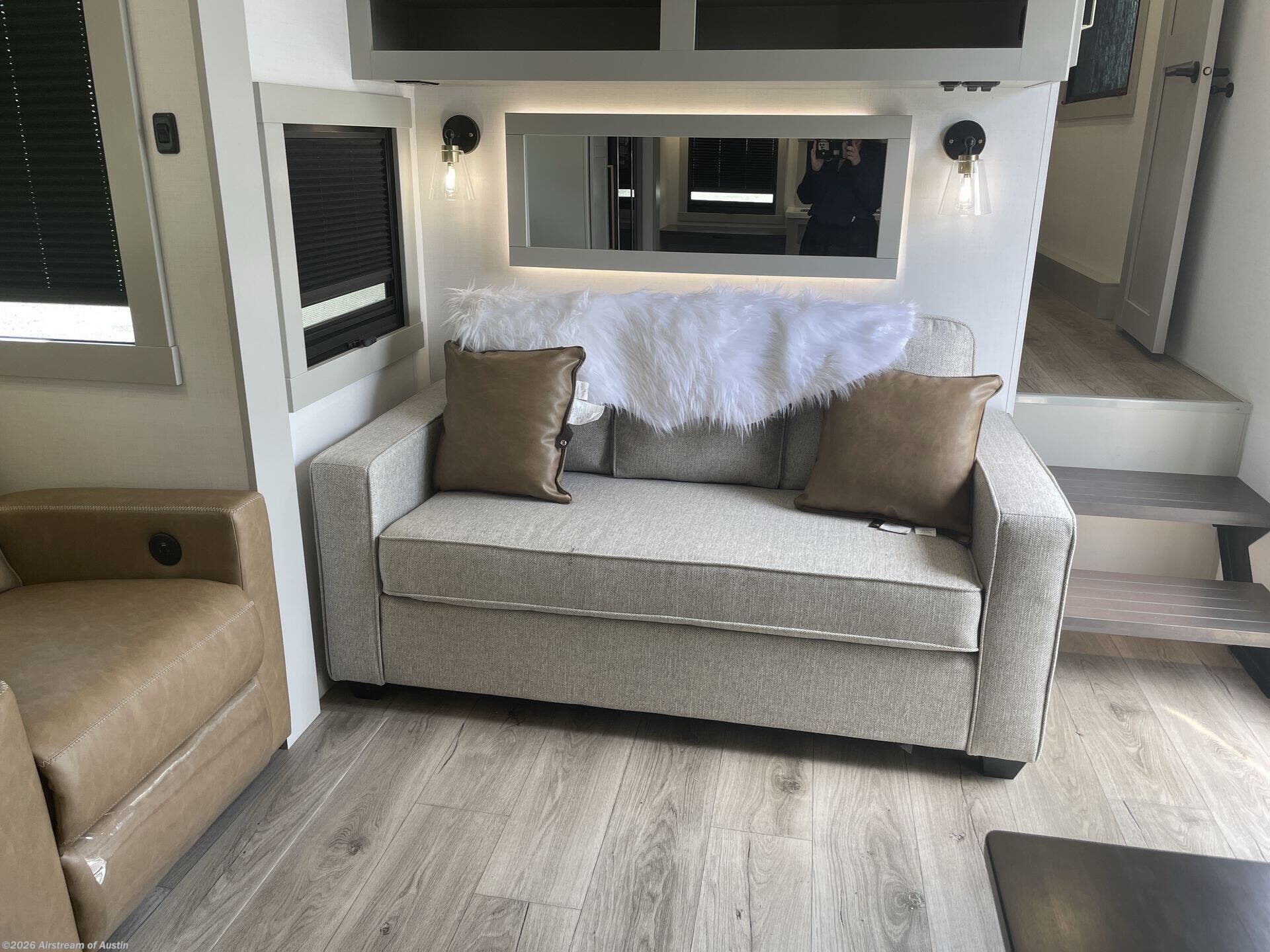 You'll love every minute spent in this spacious fifth wheel that can sleep four each night. There is a front private bedroom with a queen bed and 4x under-bed drawers to keep your space tidy. Your guests can sleep on the tri-fold sofa that extends to a 54" x 70" bed at night. The theater seating sits directly across from the 50" articulating TV for movie nights, and the pantry with drawers is right next to the theater seating for quick access to snacks! The chef of your group is sure to love the kitchen with its ample counter space, 30" residential microwave, and a sliding dining table with a drawer for even more storage. The desk in the back will allow you to get some work done if needed, or you can just spend your days outdoors under the two power awnings. There is also an exterior 12V refrigerator and storage, exterior speakers and controls, and a pass-thru storage for camp gear!