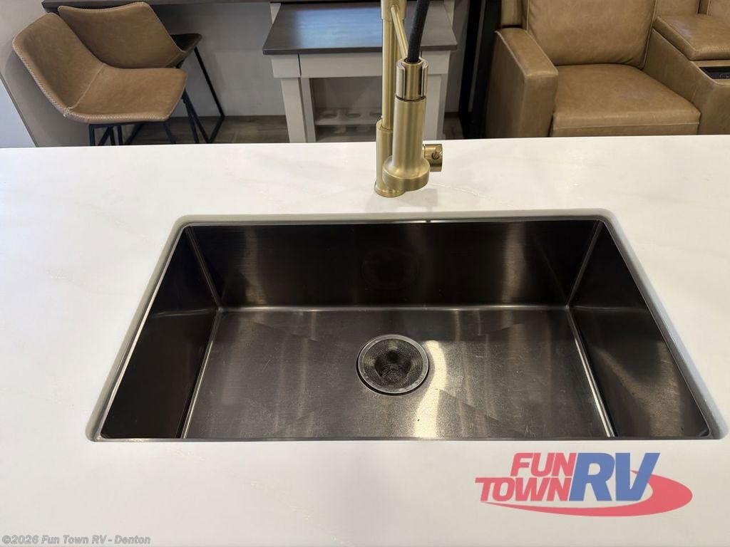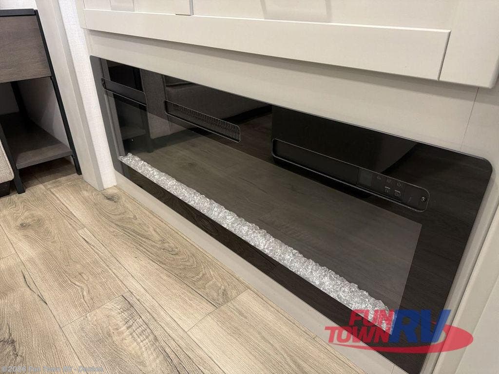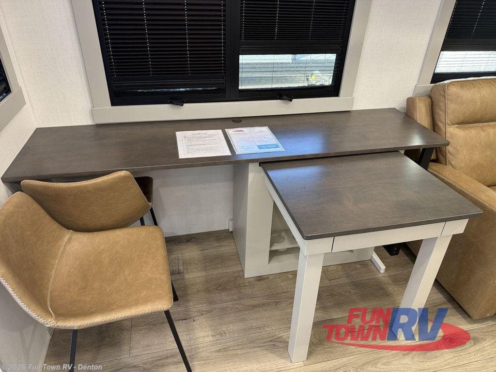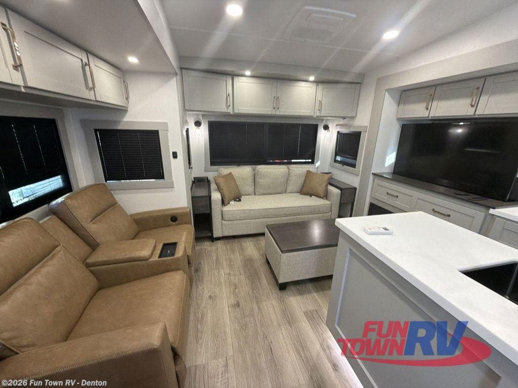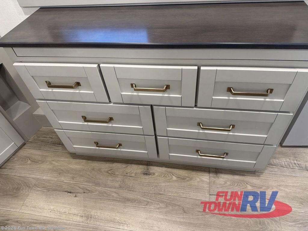 This Model Z luxury fifth wheel is bright and modern on the inside, with loads of amenities that will have you dreaming of your next trip! Enter and find a spacious combined living/kitchen space thanks to dual opposing slides. There is ample seating with a sliding desk/dining table, 62" theater seating, and a 72" tri-fold sofa along the rear wall. You can easily relax and enjoy the 50" Smart telescoping TV with a cozy fireplace below. The kitchen offers all that you need to prepare and cook meals just like home with a 16 cu. ft. refrigerator for your perishables, a 30" microwave oven, and three burner range top and oven. You will love the integrated spice rack, and the kitchen island all outfitted with dog bowls and double pull out trash bins with an integrated Stow 'N Go paper towel holder. There is also an 84" pantry with adjustable shelves for all of your canned and dry goods. Head up the steps to a private master suite with king bed slide. You can opt for the queen bed if you like. A sliding dresser top features hidden storage which is perfect for jewelry and other personal belongings. The front wardrobe features mirrored doors and the corner closet has been prepped for a stackable washer and dryer if you choose to add that option. Relax and enjoy a large bath featuring a linen cabinet, a 30" x 42" shower, and vanity with sink, plus medicine cabinet.
