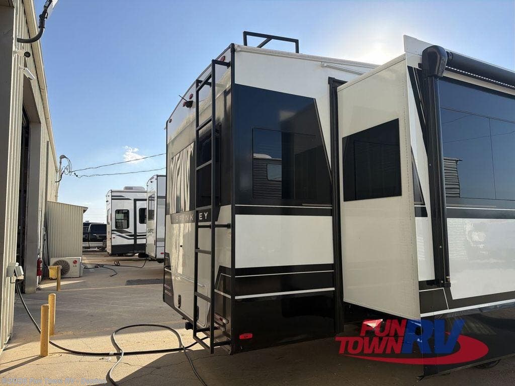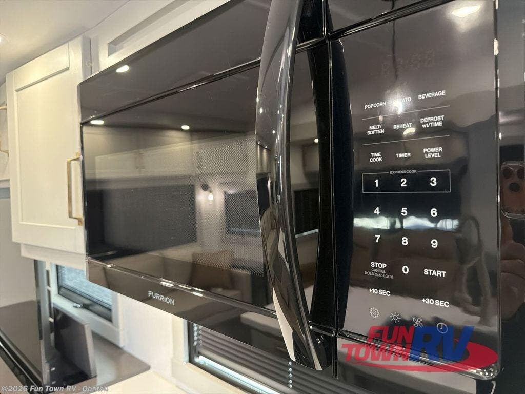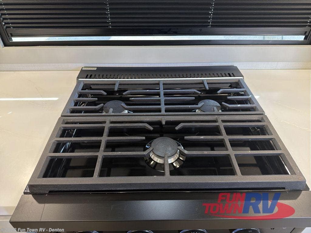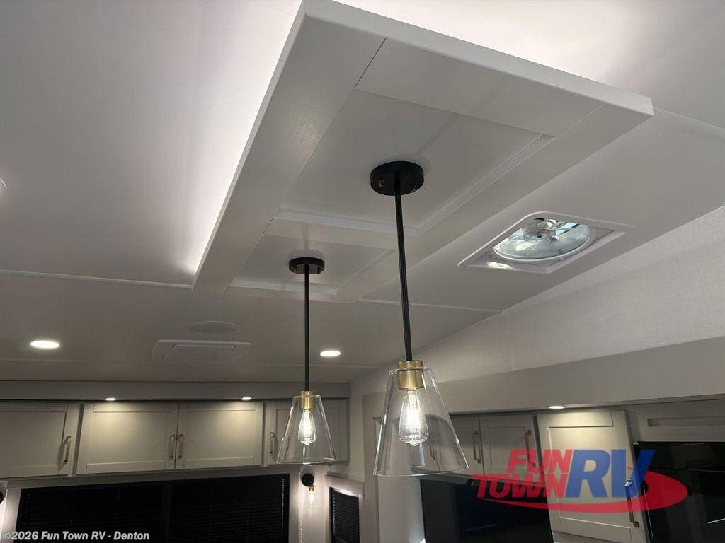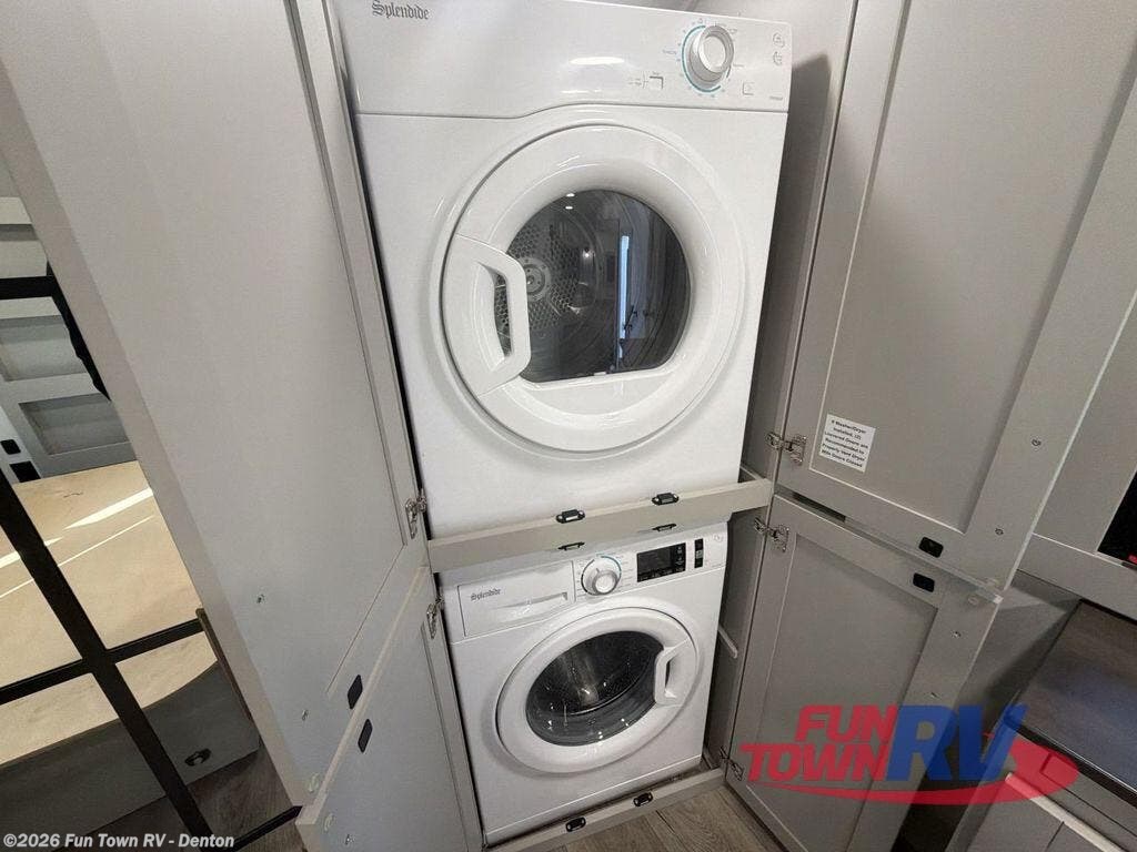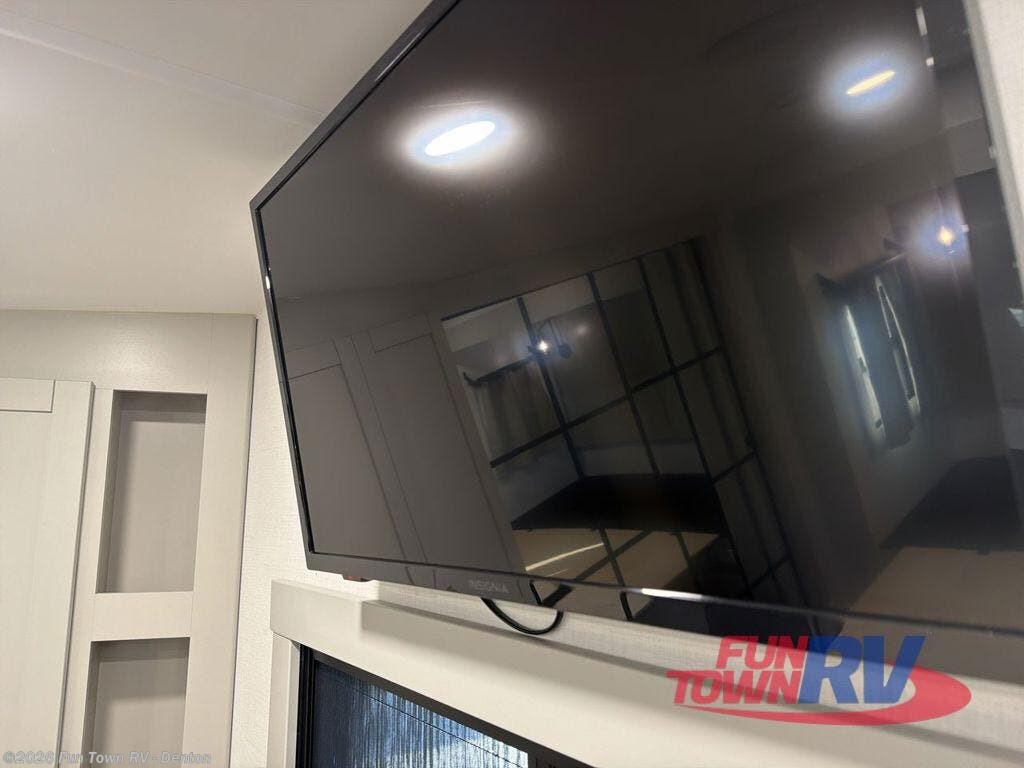 This Model Z luxury fifth wheel is bright and modern on the inside, with loads of amenities that will have you dreaming of your next trip! Enter and find a spacious combined living/kitchen space thanks to dual opposing slides. There is ample seating with a sliding desk/dining table, 62" theater seating, and a 72" tri-fold sofa along the rear wall. You can easily relax and enjoy the 50" Smart telescoping TV with a cozy fireplace below. The kitchen offers all that you need to prepare and cook meals just like home with a 16 cu. ft. refrigerator for your perishables, a 30" microwave oven, and three burner range top and oven. You will love the integrated spice rack, and the kitchen island all outfitted with dog bowls and double pull out trash bins with an integrated Stow 'N Go paper towel holder. There is also an 84" pantry with adjustable shelves for all of your canned and dry goods. Head up the steps to a private master suite with king bed slide. You can opt for the queen bed if you like. A sliding dresser top features hidden storage which is perfect for jewelry and other personal belongings. The front wardrobe features mirrored doors and the corner closet has been prepped for a stackable washer and dryer if you choose to add that option. Relax and enjoy a large bath featuring a linen cabinet, a 30" x 42" shower, and vanity with sink, plus medicine cabinet.